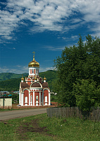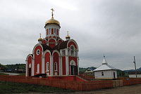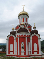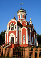Хороший образец современного храмового зодчества: кирпичная однокупольная церковь, во внешних формах воспроизводящая формы раннемосковского зодчества XIV века, со звонницей над притвором.