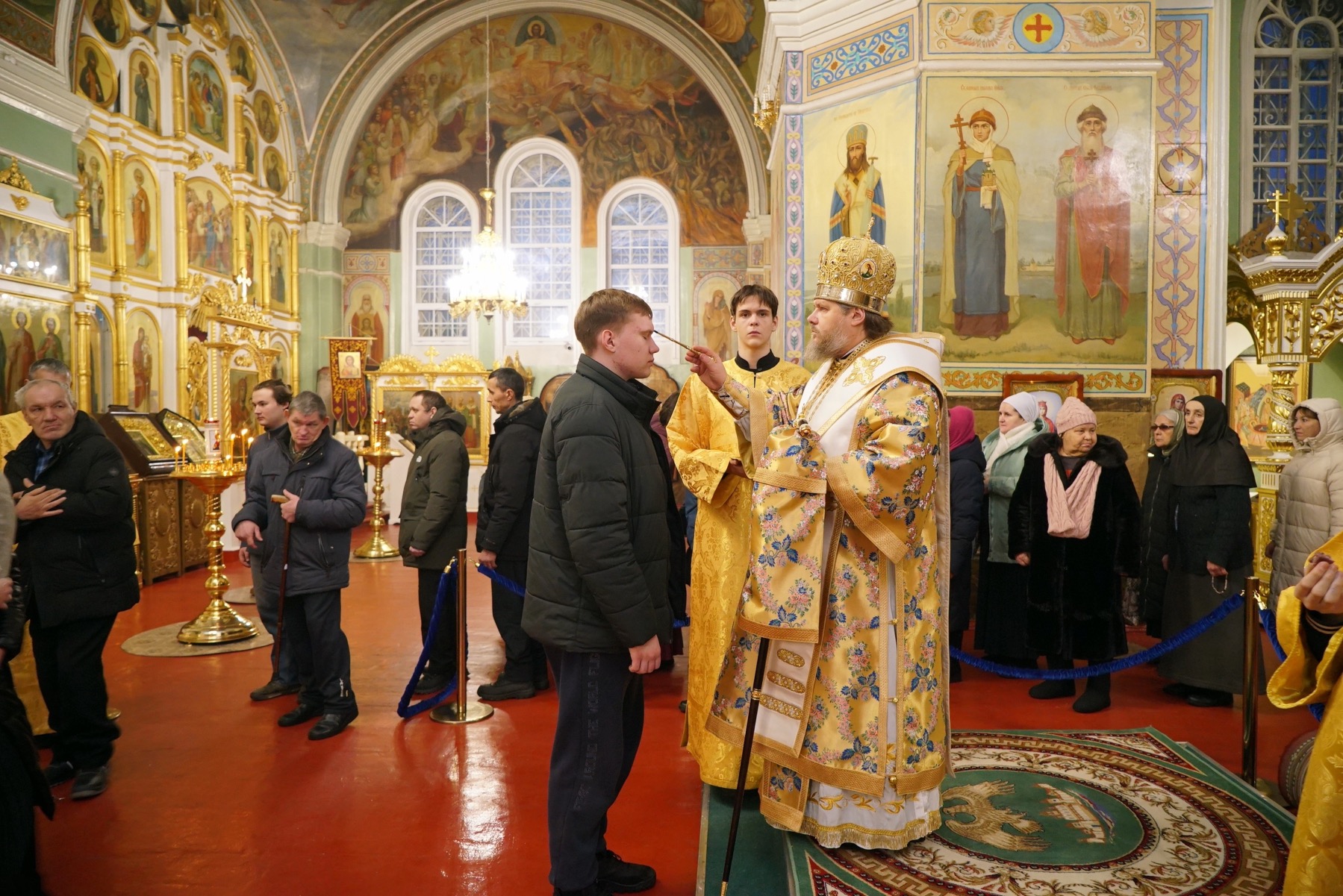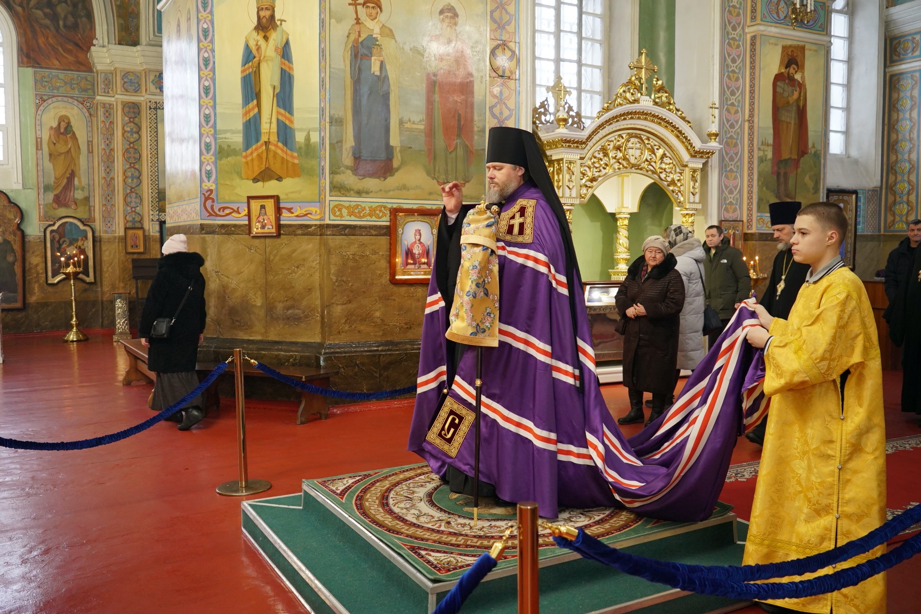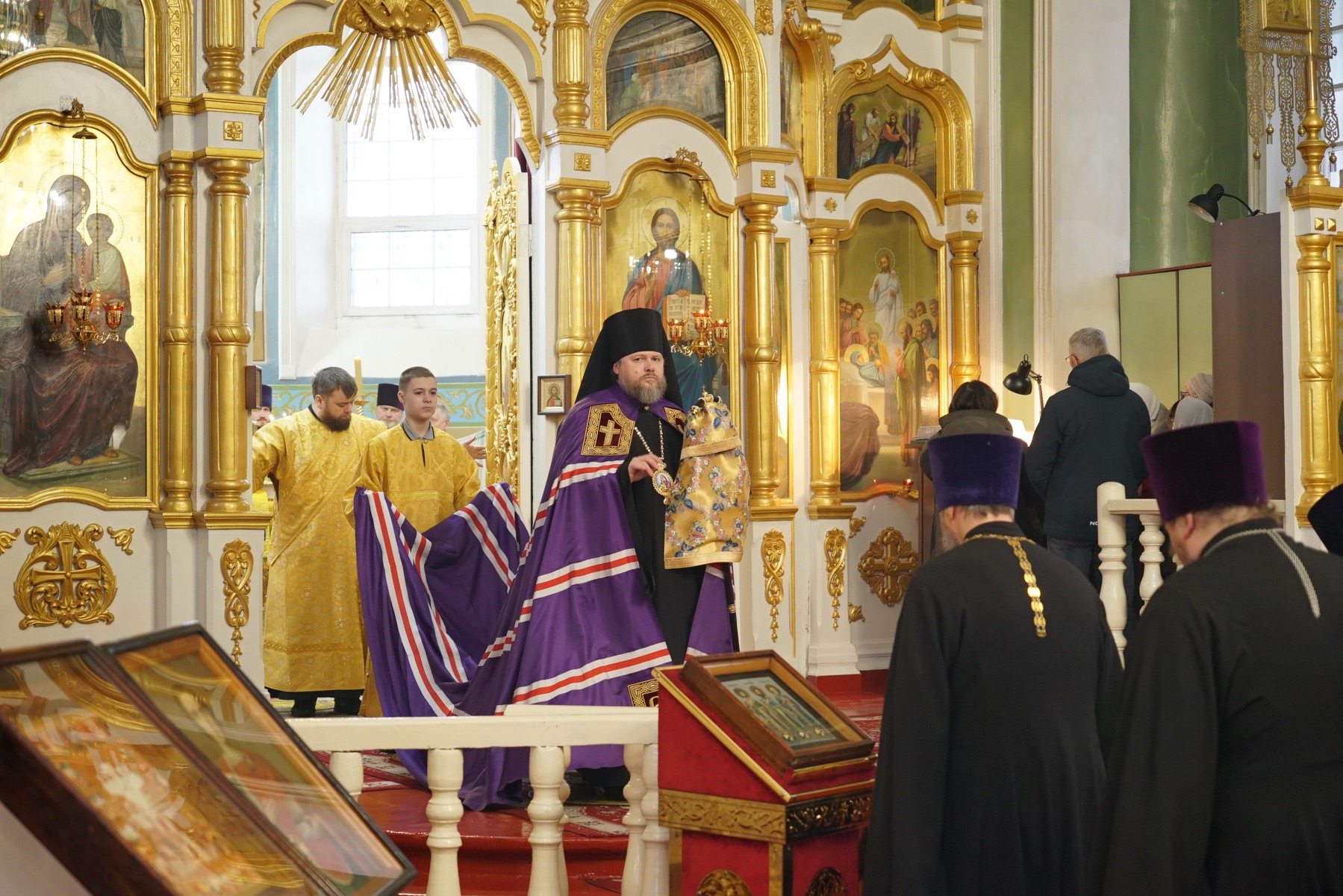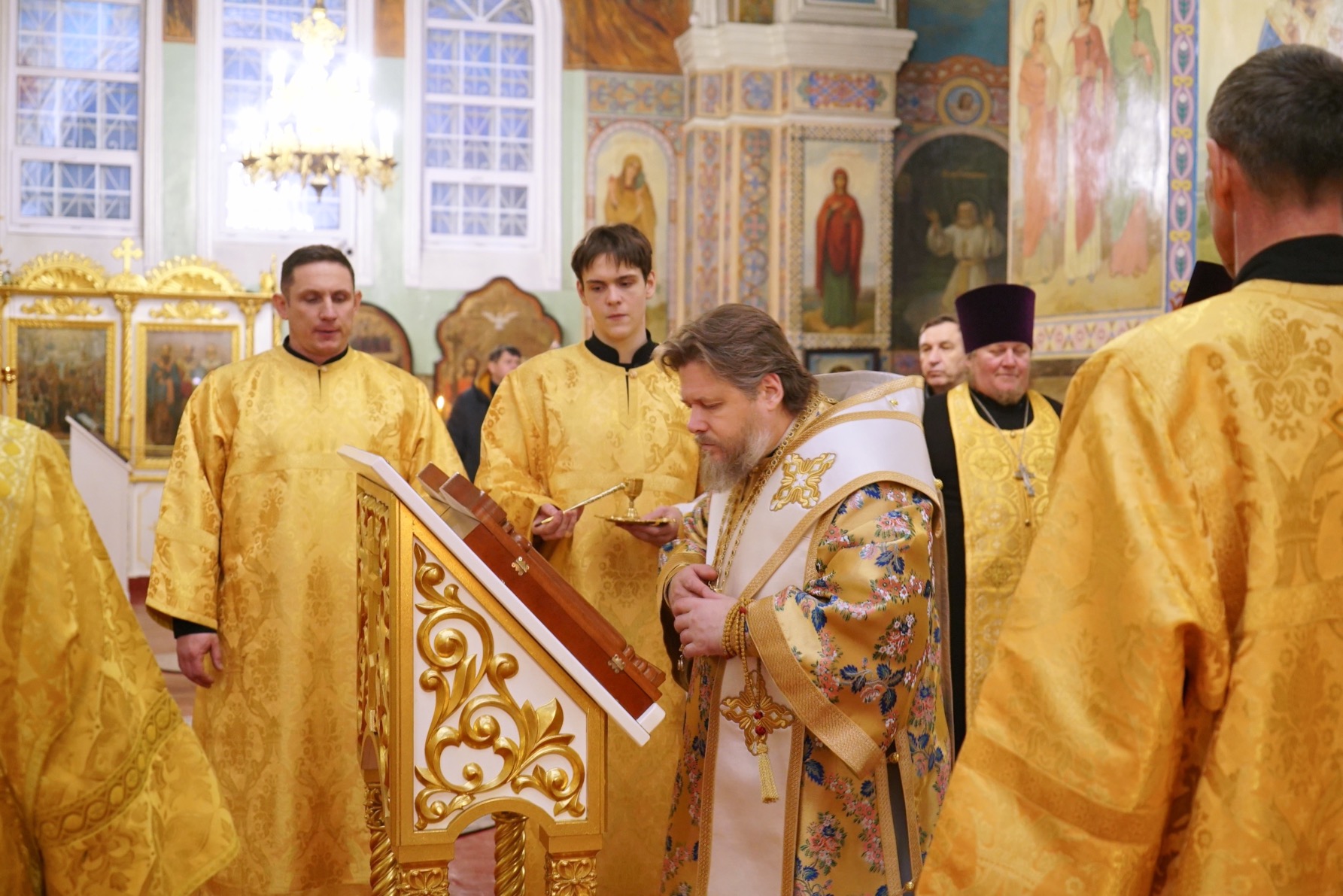 Преосвященному владыке сослужили: ключарь собора протоиерей Александр Петров, протоиерей Владимир Ащеулов, иерей Димитрий Щербаков, иерей Иоанн Шкуропацкий, иерей Артемий Золотых, диакон Вадим Шпак, диакон Никита Гологузов, диакон Артемий Волков.