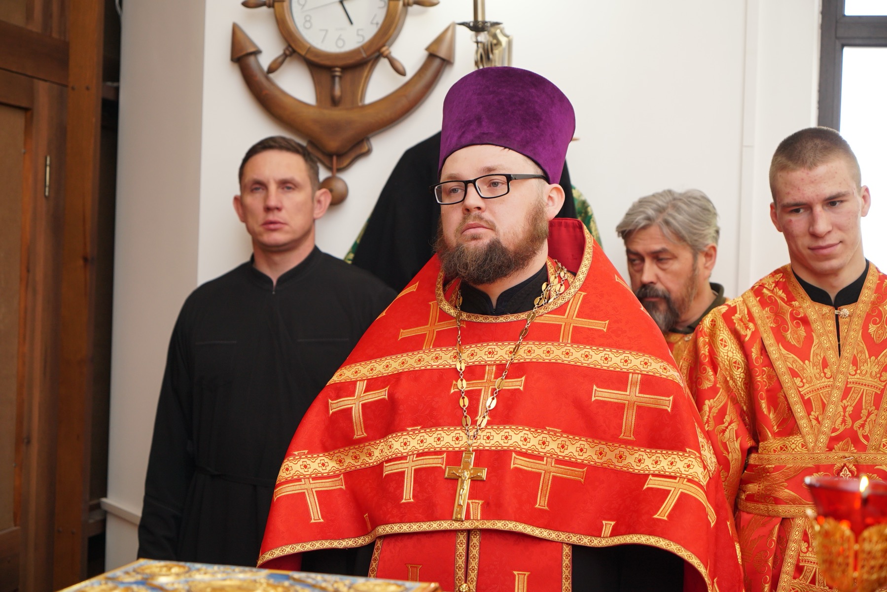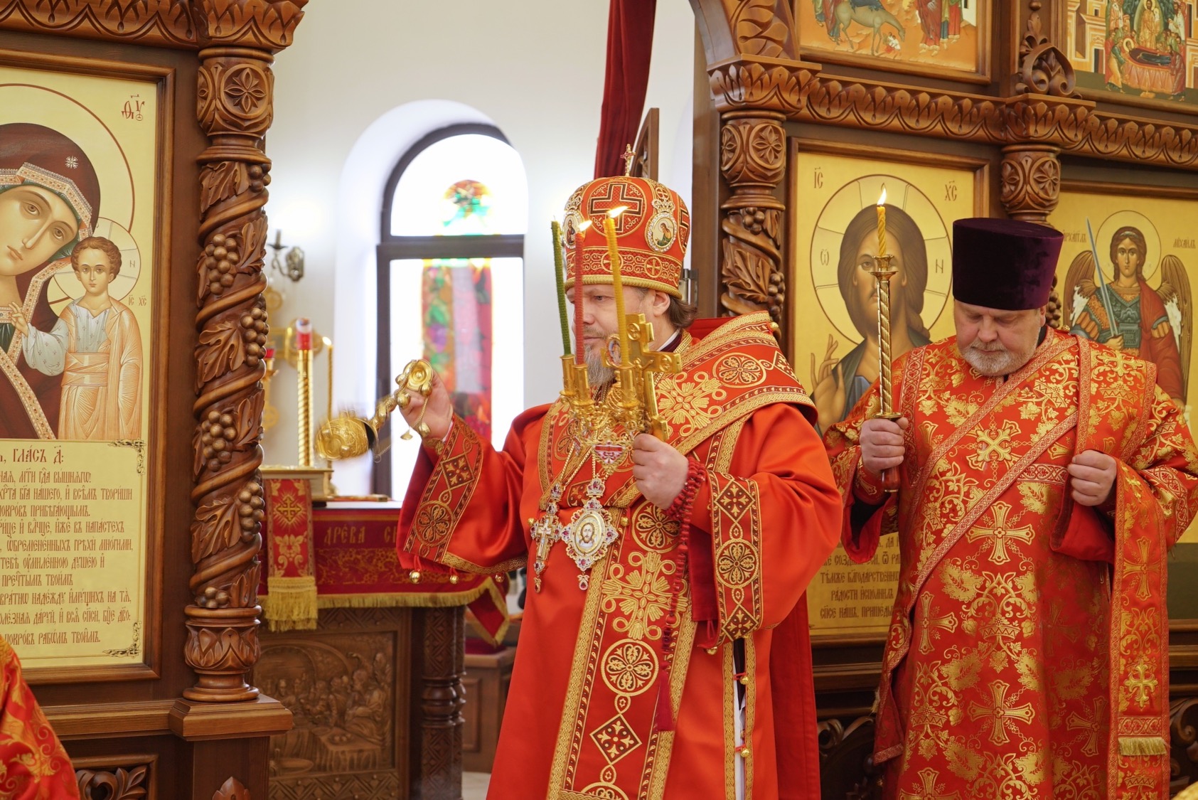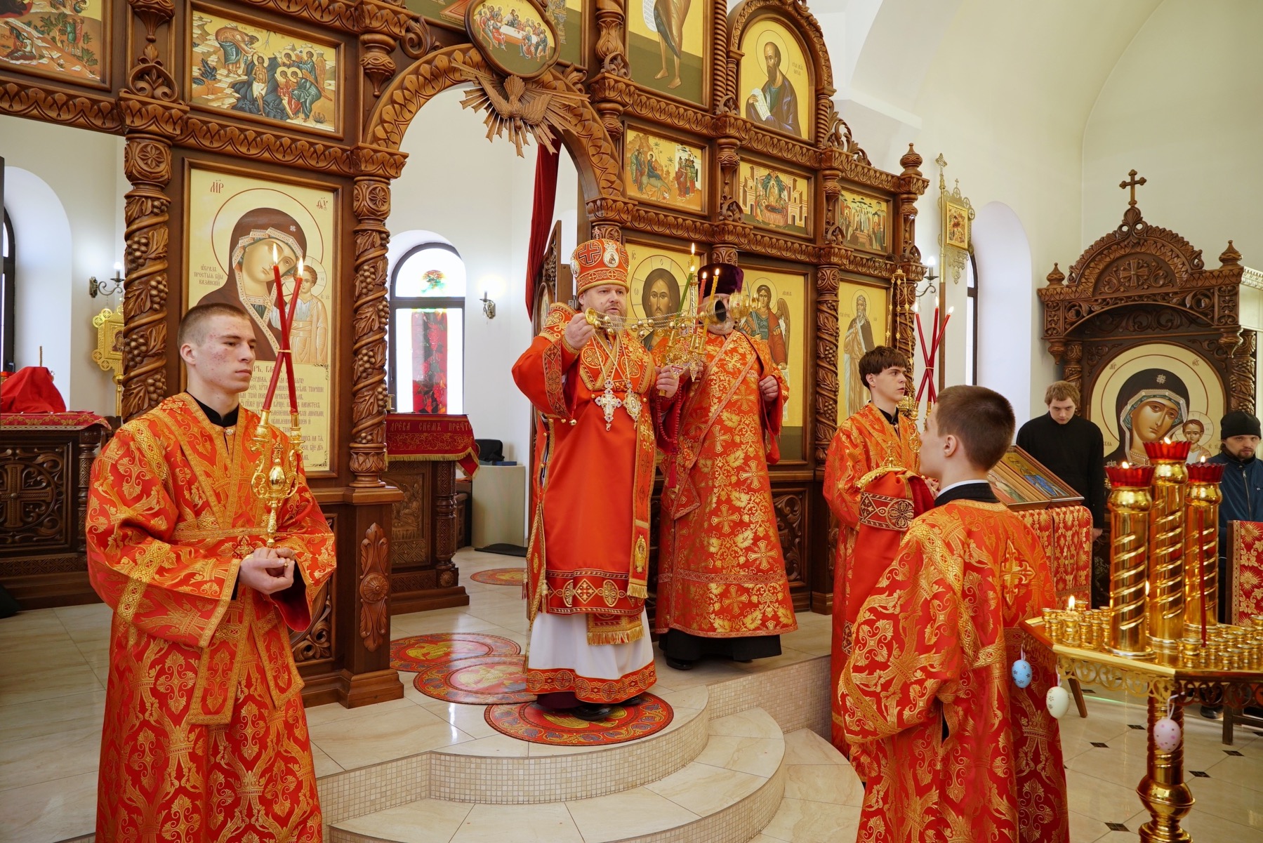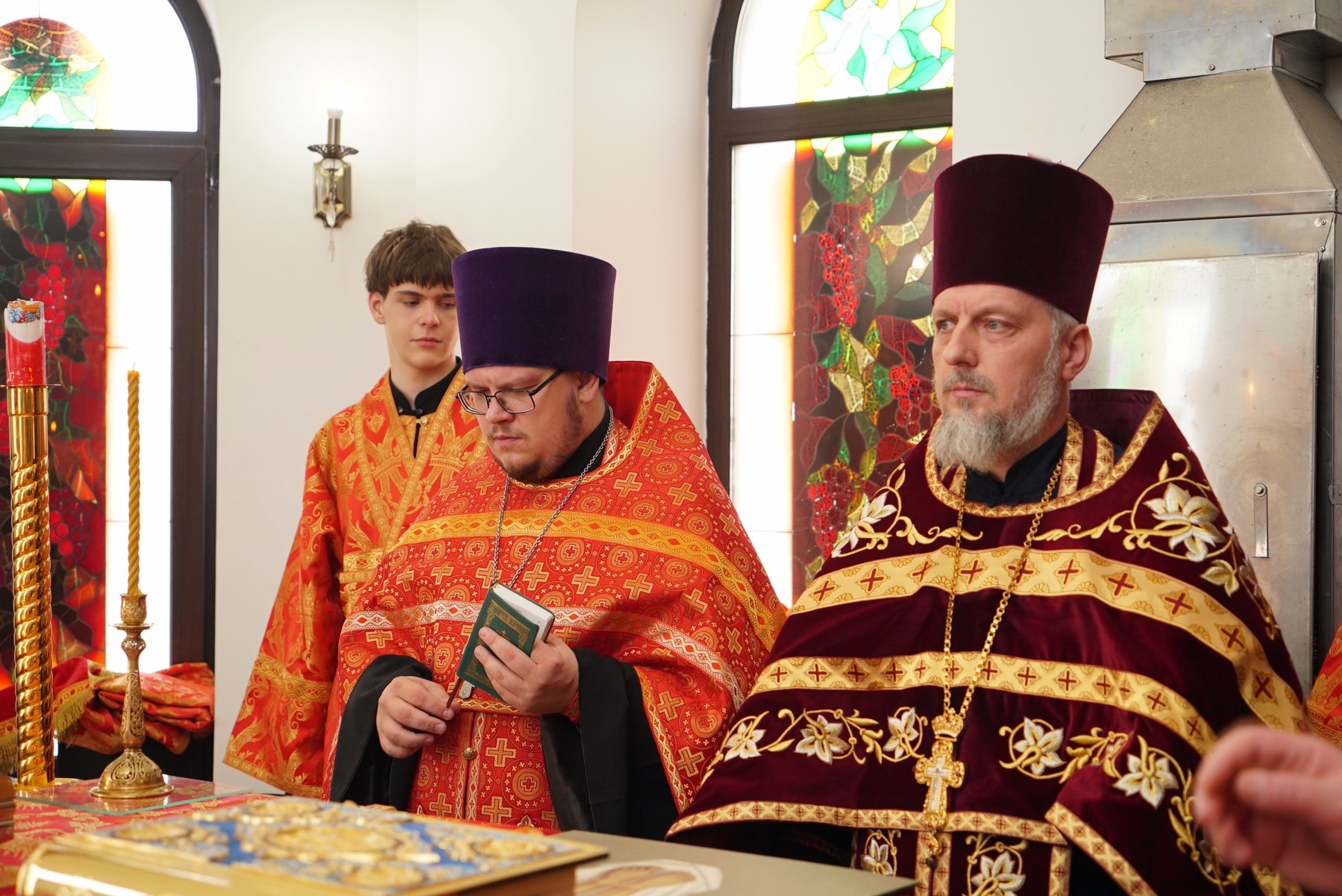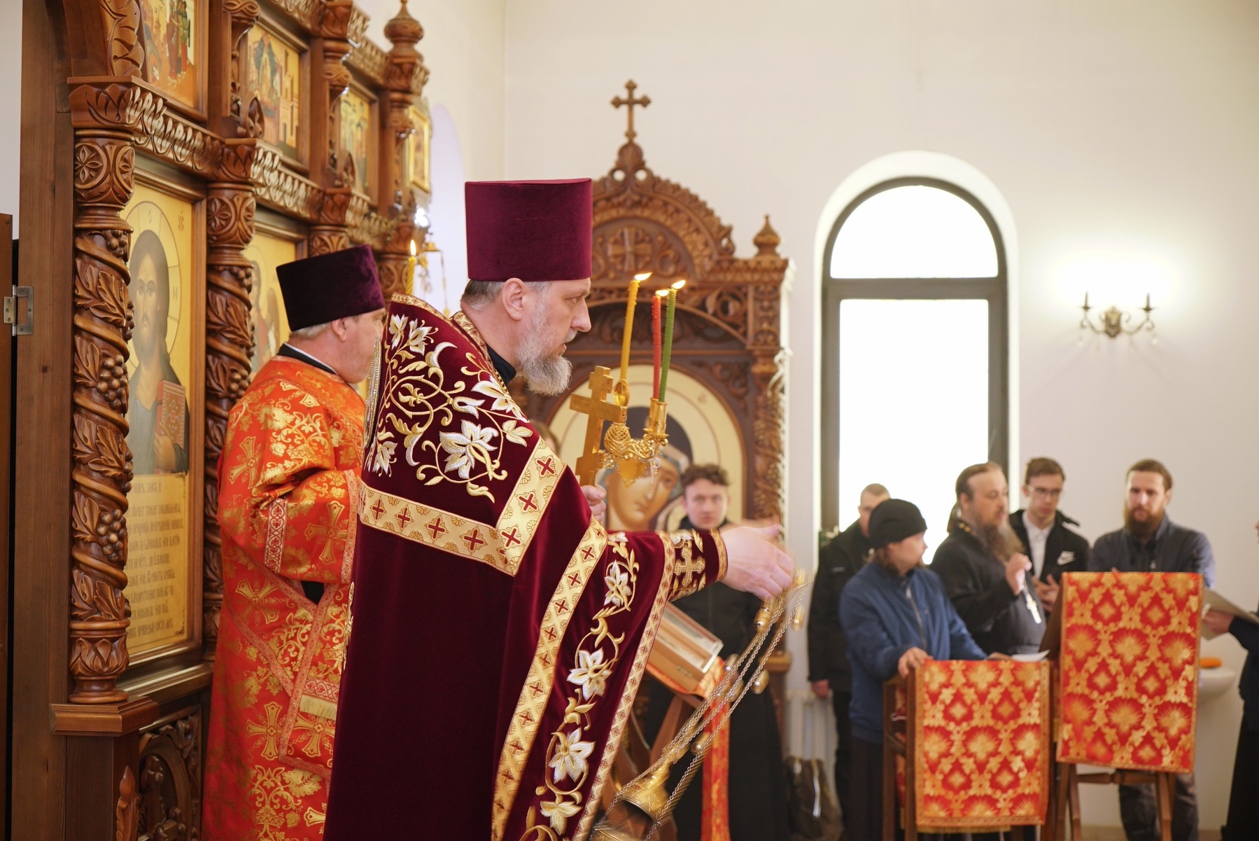Преосвященному владыке сослужили: ключарь Успенского кафедрального собора протоиерей Александр Петров, настоятель храма иерей Даниил Тишков, иерей Иоанн Макаров, протодиакон Вадим Шпак.