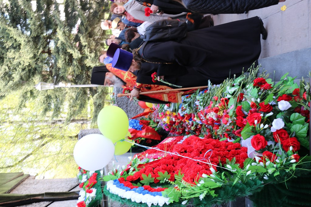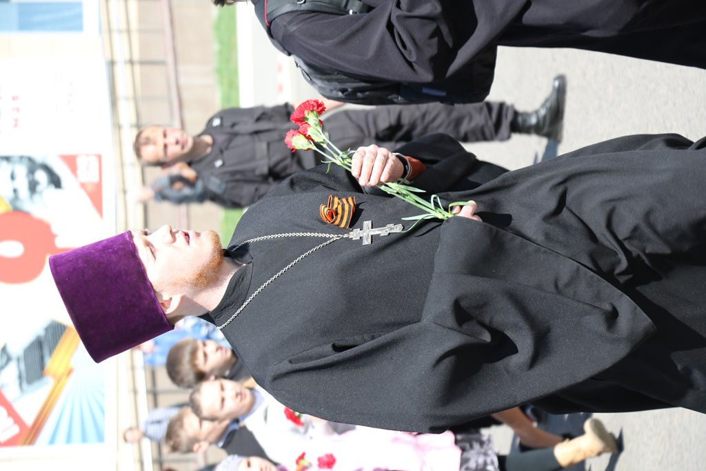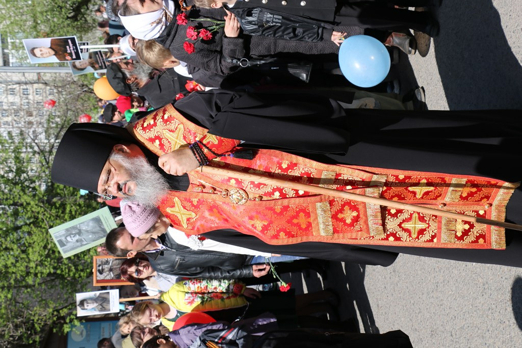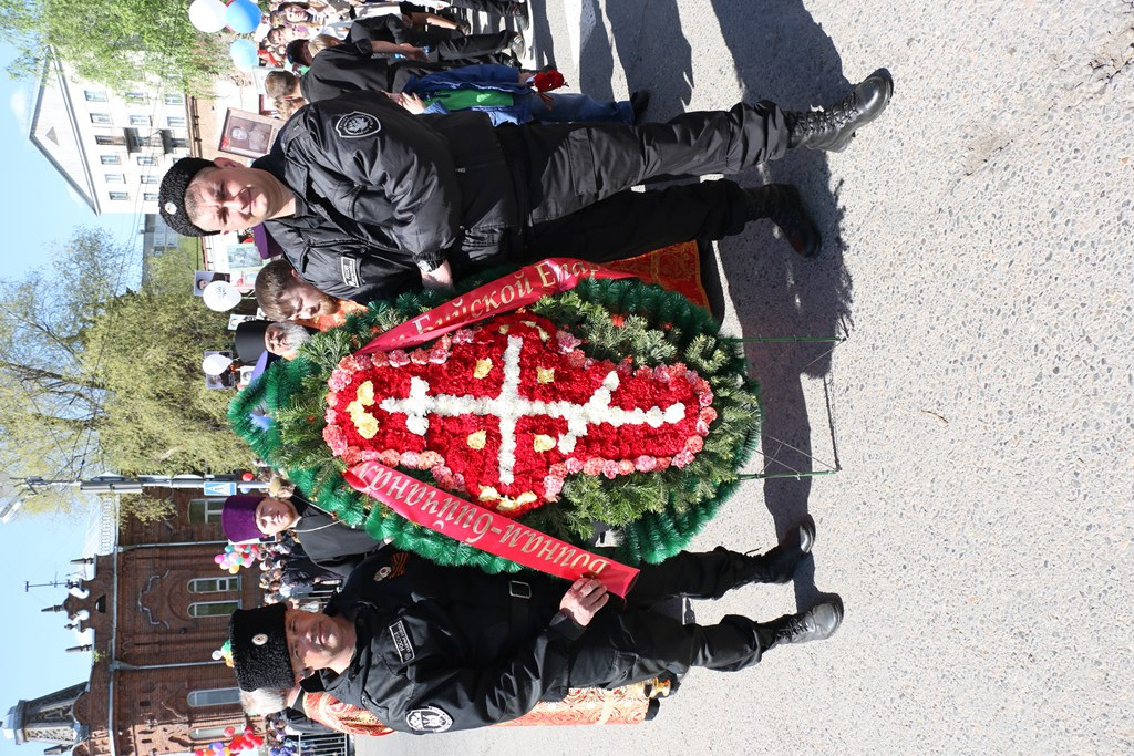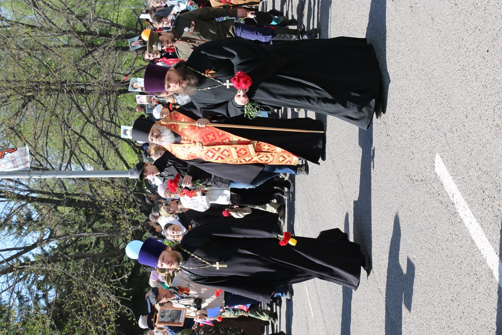 Во время шествия колонны владыка совместно с духовенством совершил панихиду о упокоении всех воинов павших на поле боя. Затем состоялось возложение цветов к мемориалу.