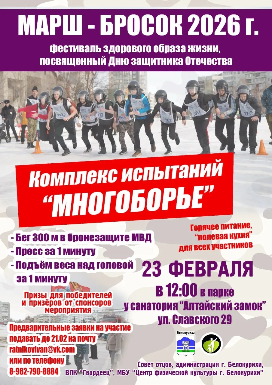 В программе был запланирован марш-бросок в полном обмундировании МВД, пресс за 1 минуту и подъем веса над головой за 1 минуту. Участвовали разные возрастные категории. Организаторами данного мероприятия выступили Администрация города Белокурихи, Совет отцов города, в который с этого года входит благочинный Белокурихинского округа иерей Роман Третьяков, ВПК «Гвардеец» под руководством атамана Белокурихинского казачьего отдела Овсиенко Вячеслава Николаевича, казаки Белокурихинского казачьего отдела, МБУ «Центр физической культуры города Белокурихи», Пантелеимоновский собор города Белокурихи.