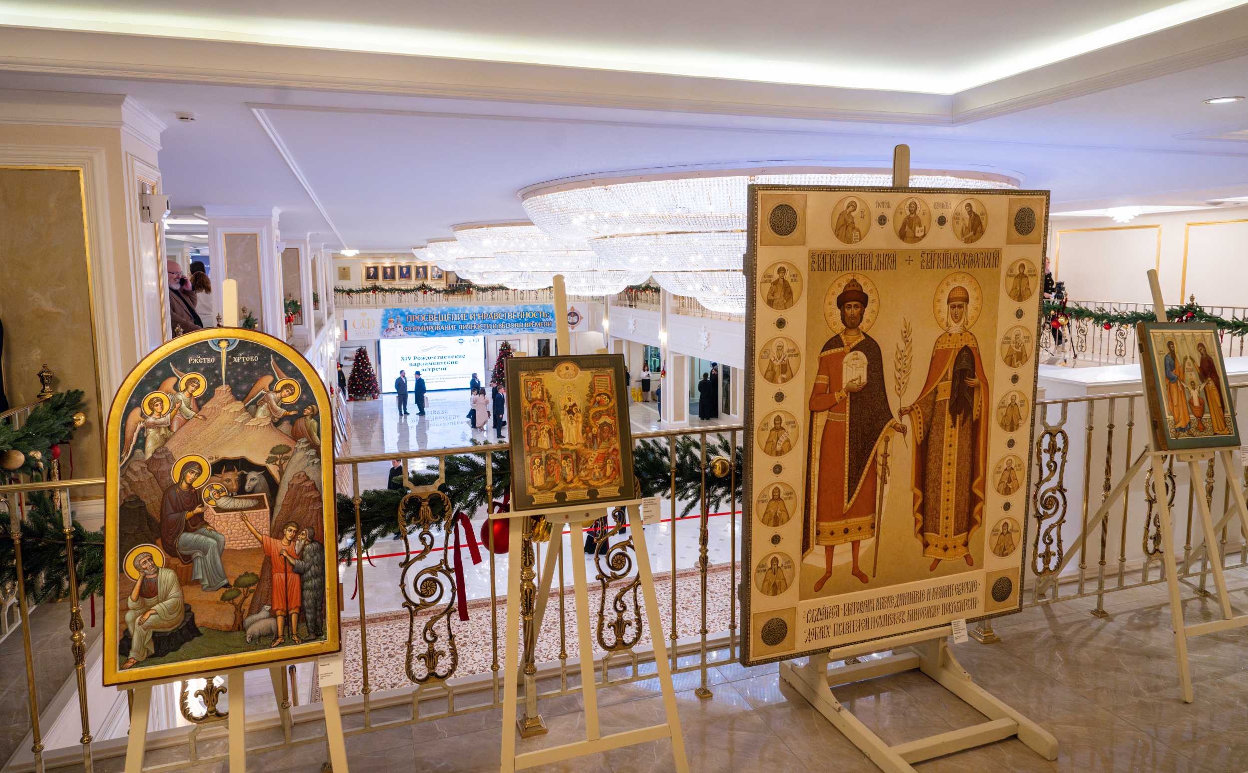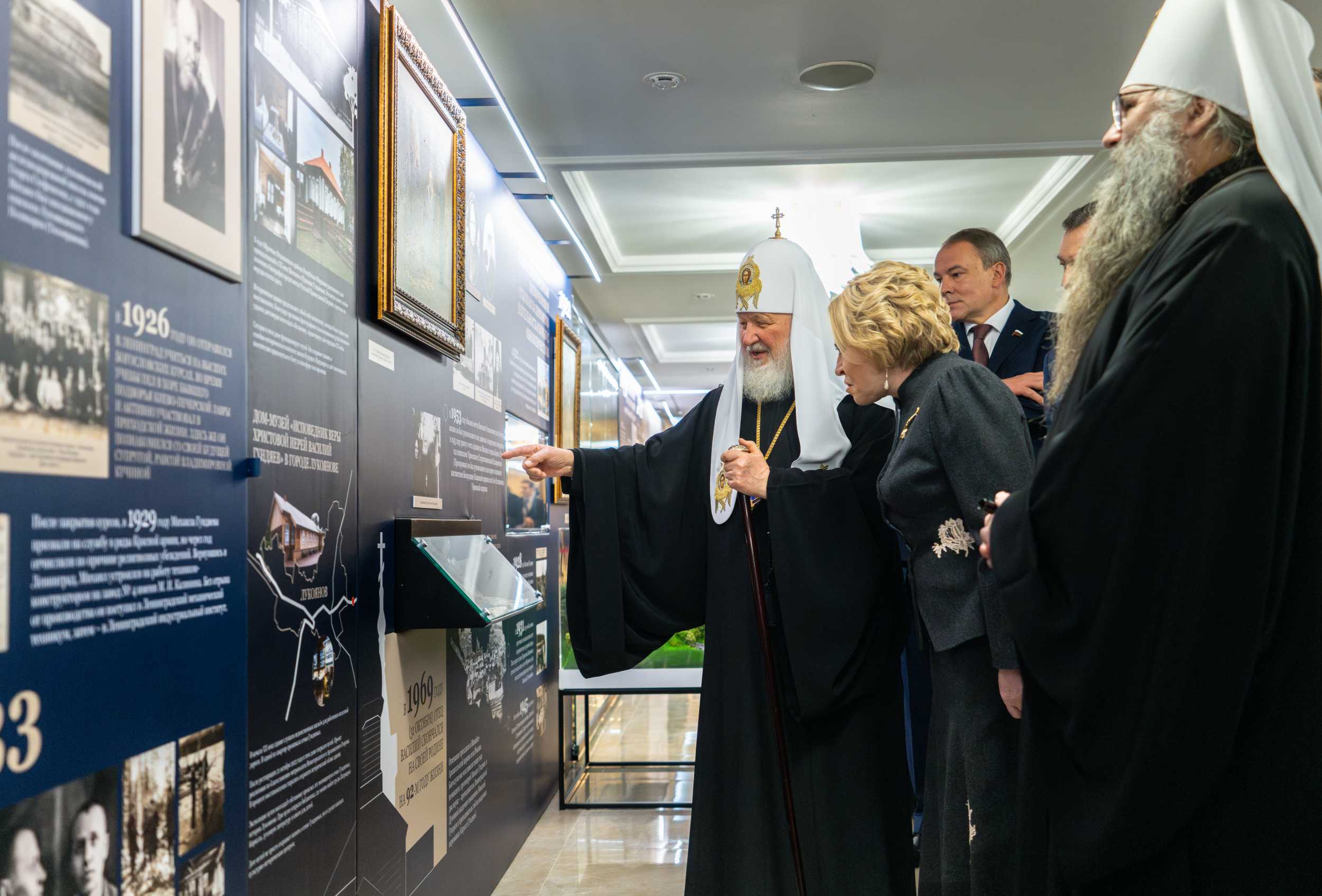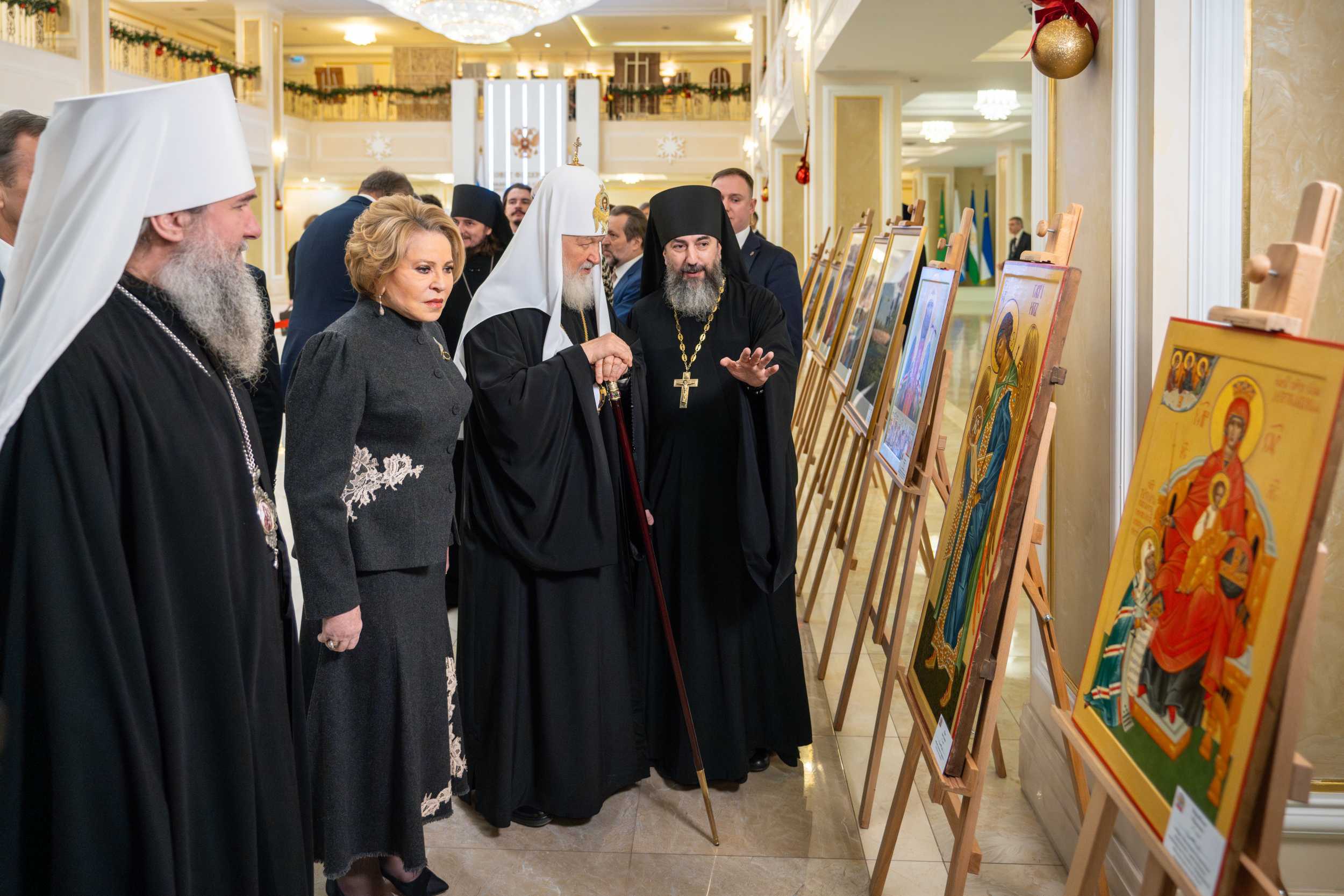 На втором этаже здания Совета Федерации Святейший Владыка осмотрел выставку «Люди Церкви: история одного рода», приуроченную к 80-летию Его Святейшества, и выставку проекта «Возвращение восстановленных икон Донбасса». Проект организован Советом Федерации совместно с Владимирским государственным университетом имени А.Г. и Н.Г. Столетовых. На выставке представлены восстановленные иконы из Петропавловского кафедрального собора г. Луганска. В проекте участвуют студенты кафедры дизайна, изобразительного искусства и реставрации ВлГУ из Донецкой и Луганской Народных Республик, Пермского края, Архангельской, Владимирской, Нижегородской, Ивановской областей.