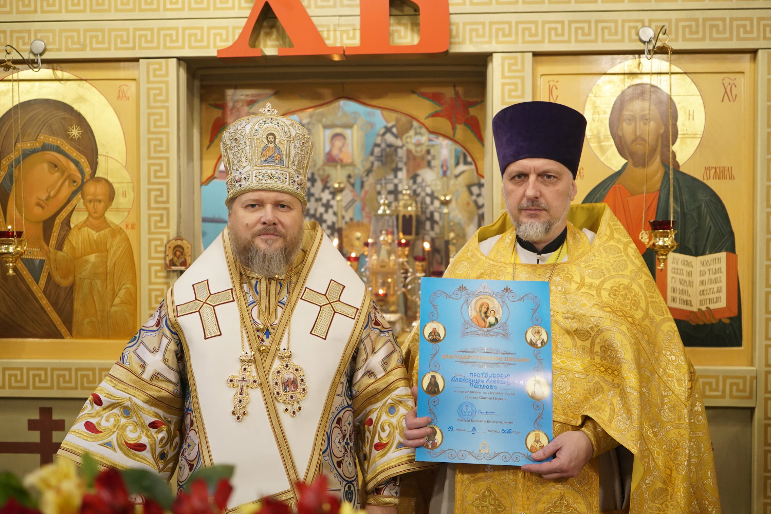 Преосвященный Серафим вручил протоиерею Александру Петрову Благодарственное письмо в связи с 25-летием священнической хиротонии.