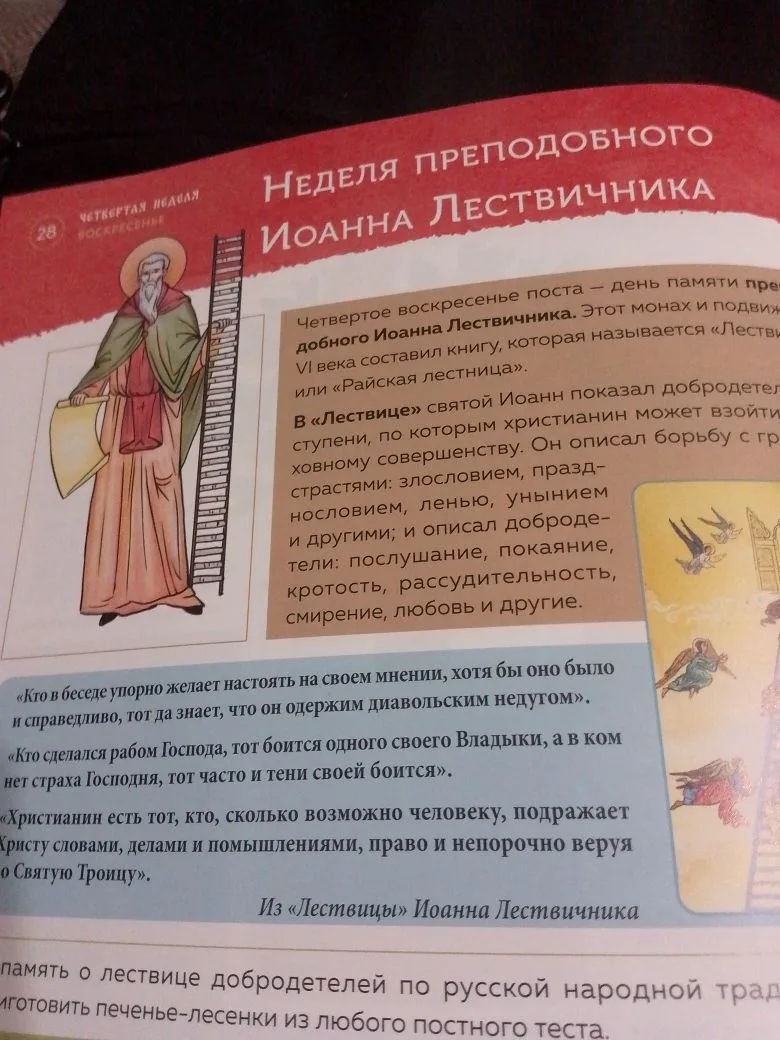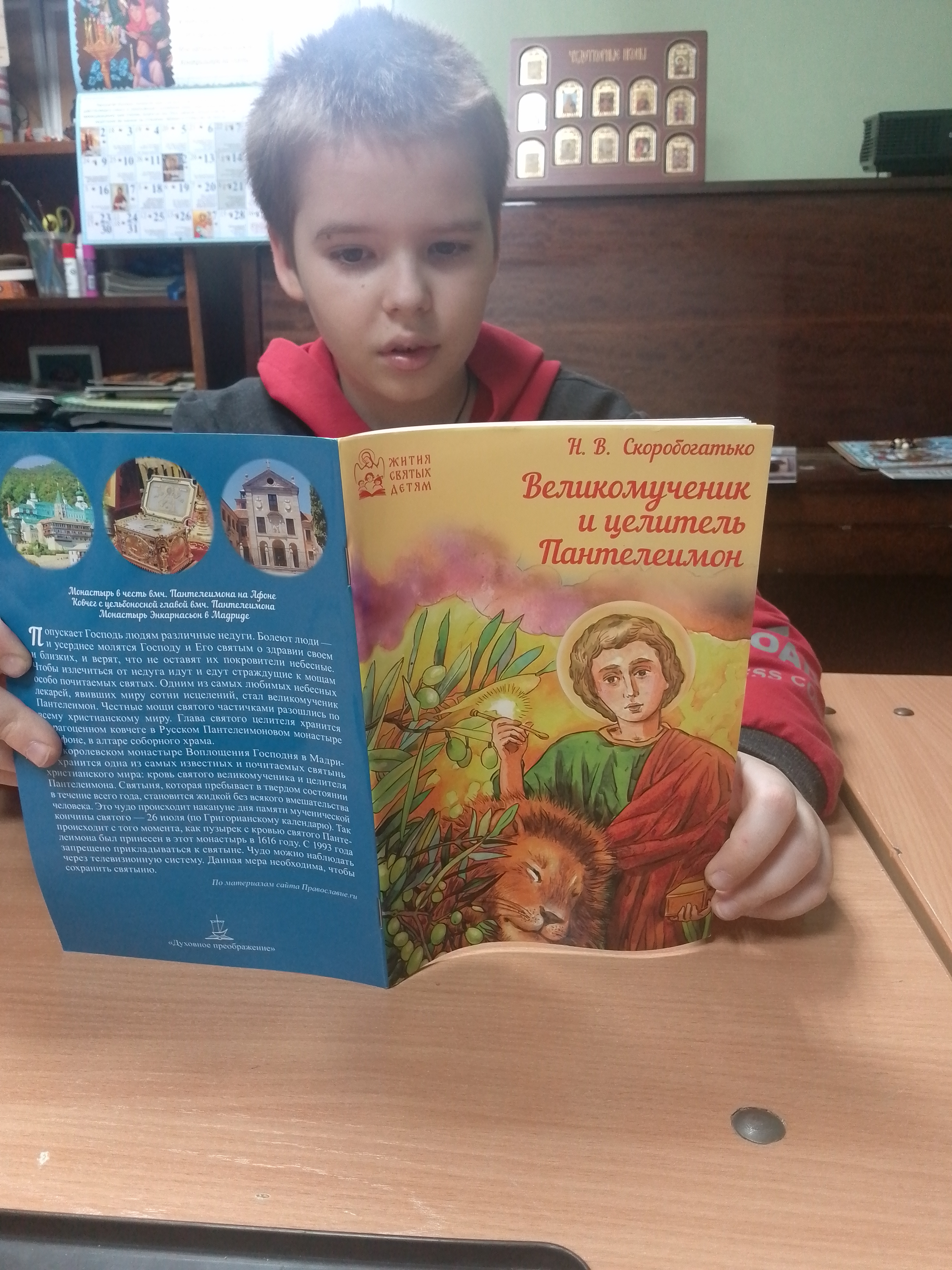 Один из ребят, по имени Степан, с удовольствием читал житие святого великомученика и целителя Пантелеимона. На занятии дети прочитали о праздновании дня 40 Севастийских мучеников на Руси и по цепочке изучили псалом 40-й из детского православного календаря «Егорушка». Из книги «Великий пост» узнали о Неделе Иоанна Лествичника, также празднуемой сегодня.