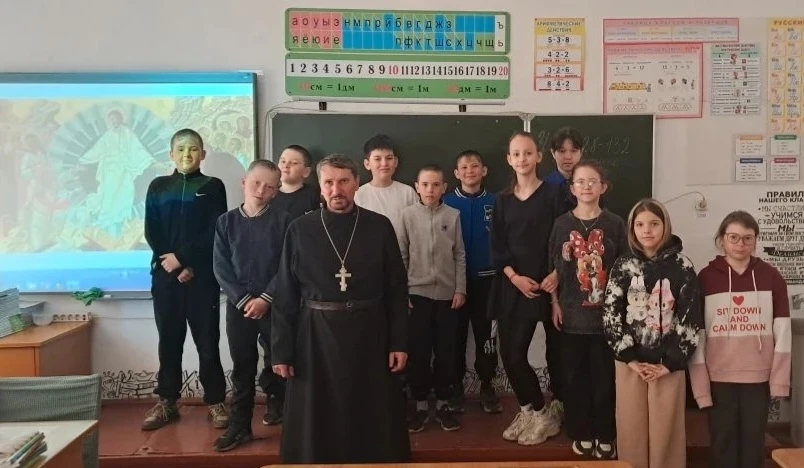 Батюшка провел урок в четвертом классе, посвященный Светлому Христову Воскресению.