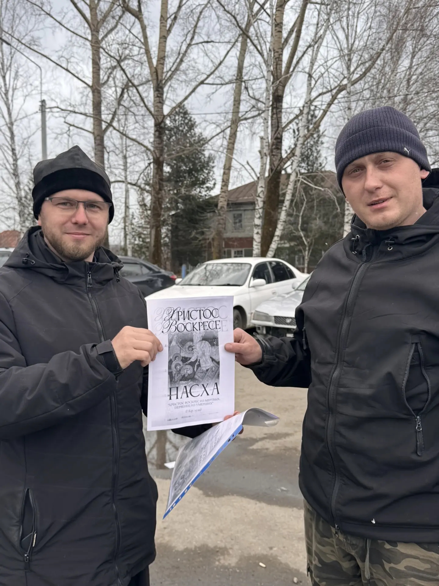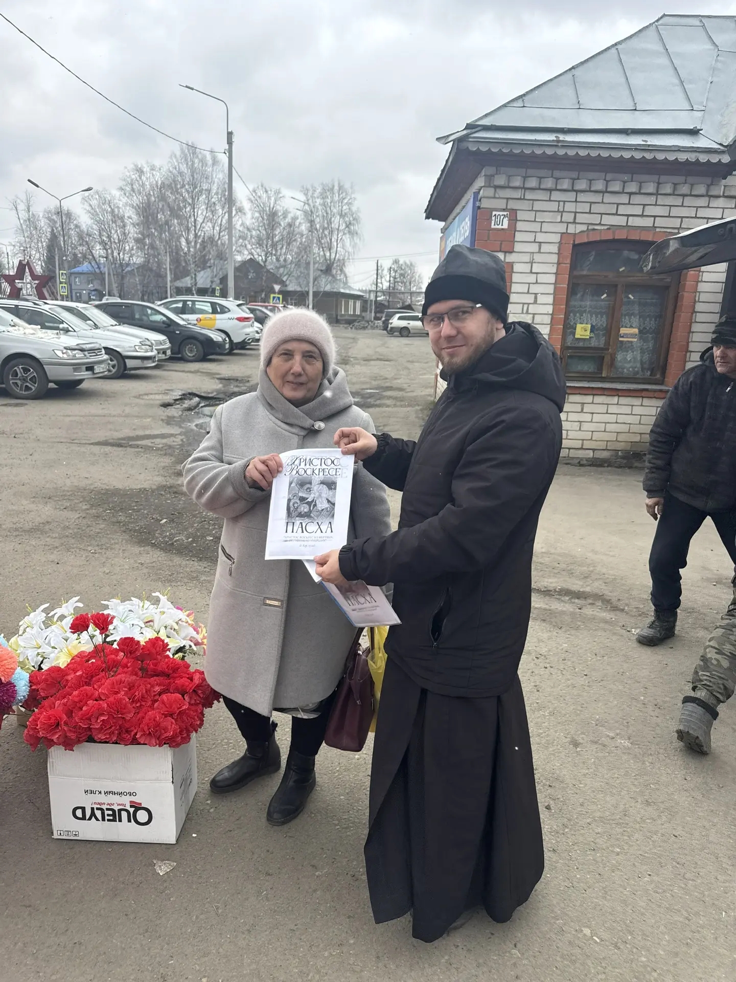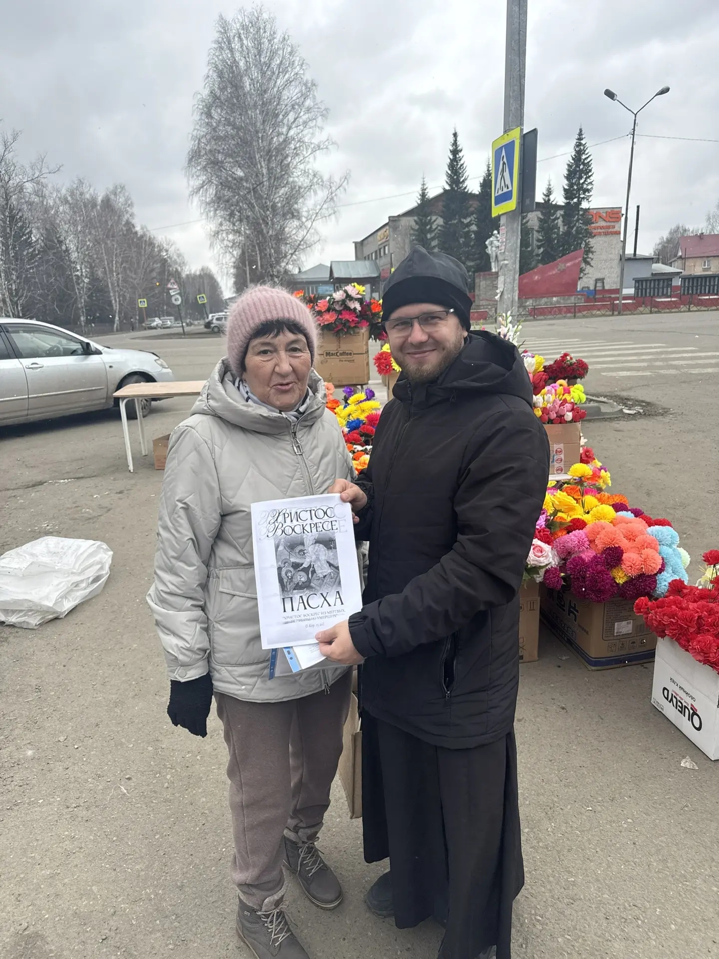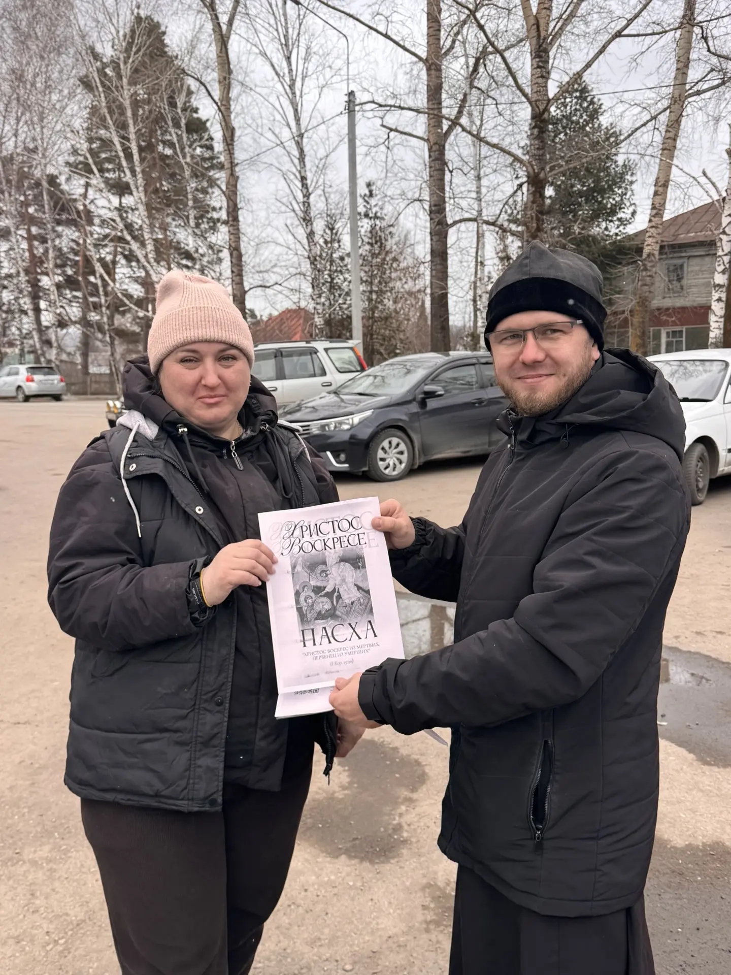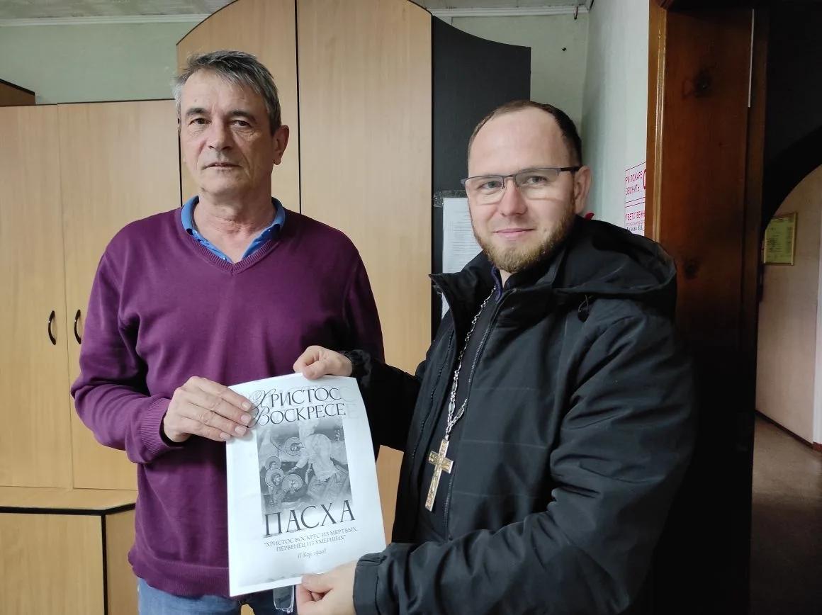 Батюшка раздал буклеты о Пасхе прохожим на улице и сотрудникам отдела Росгвардии по Красногорскому району.