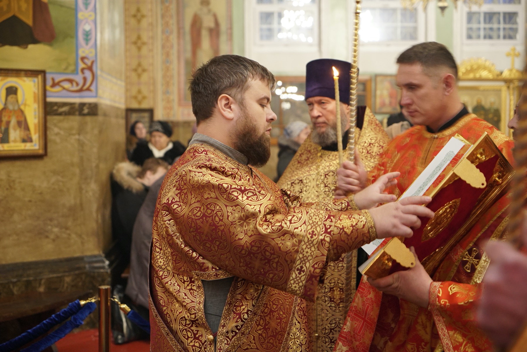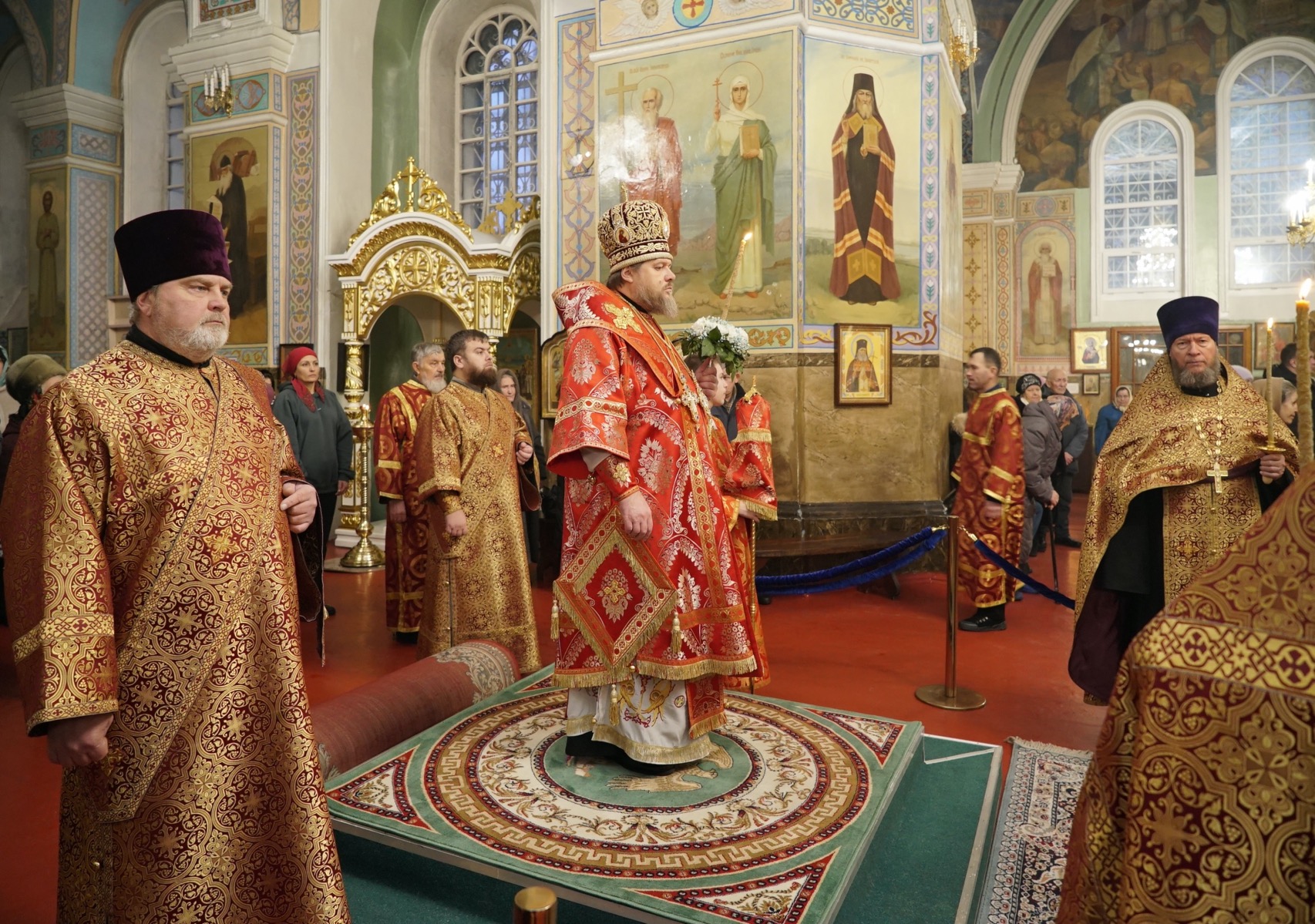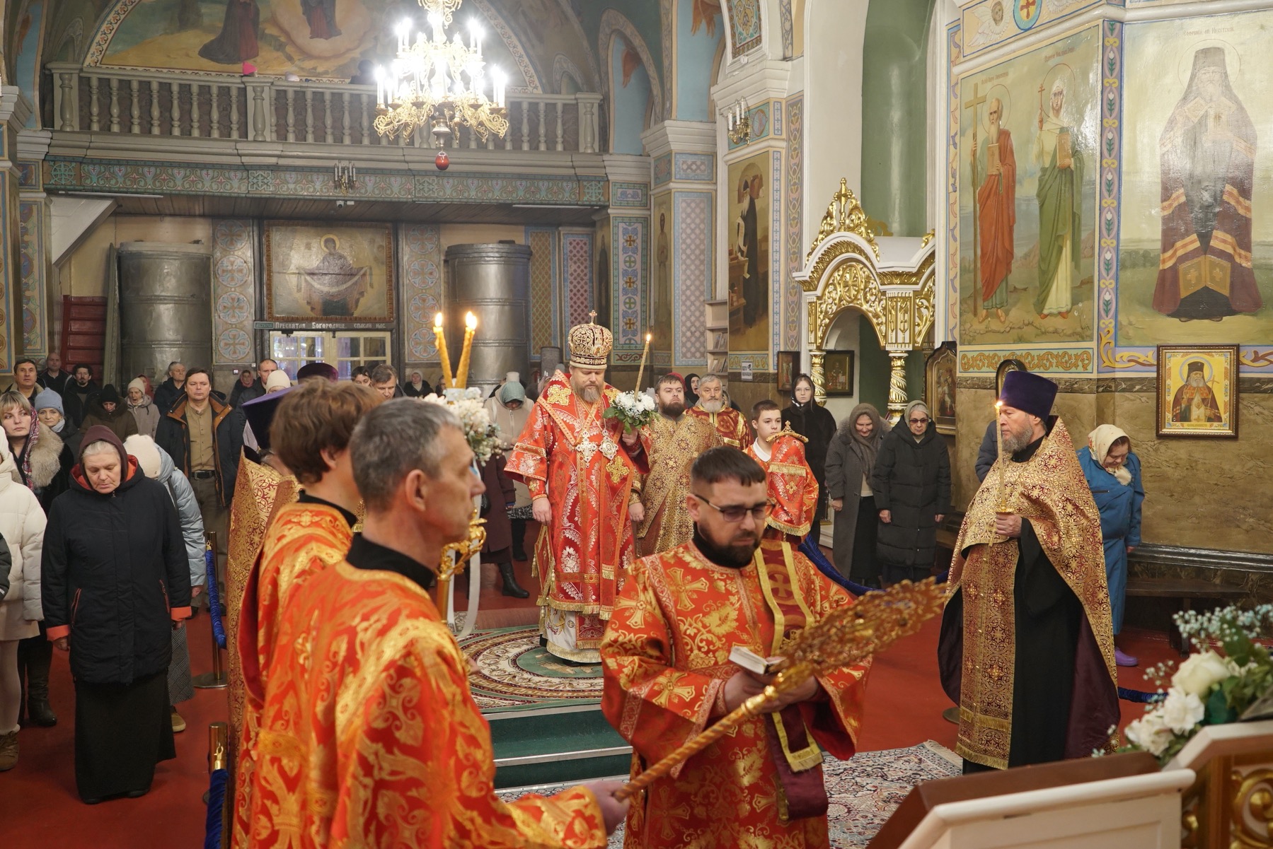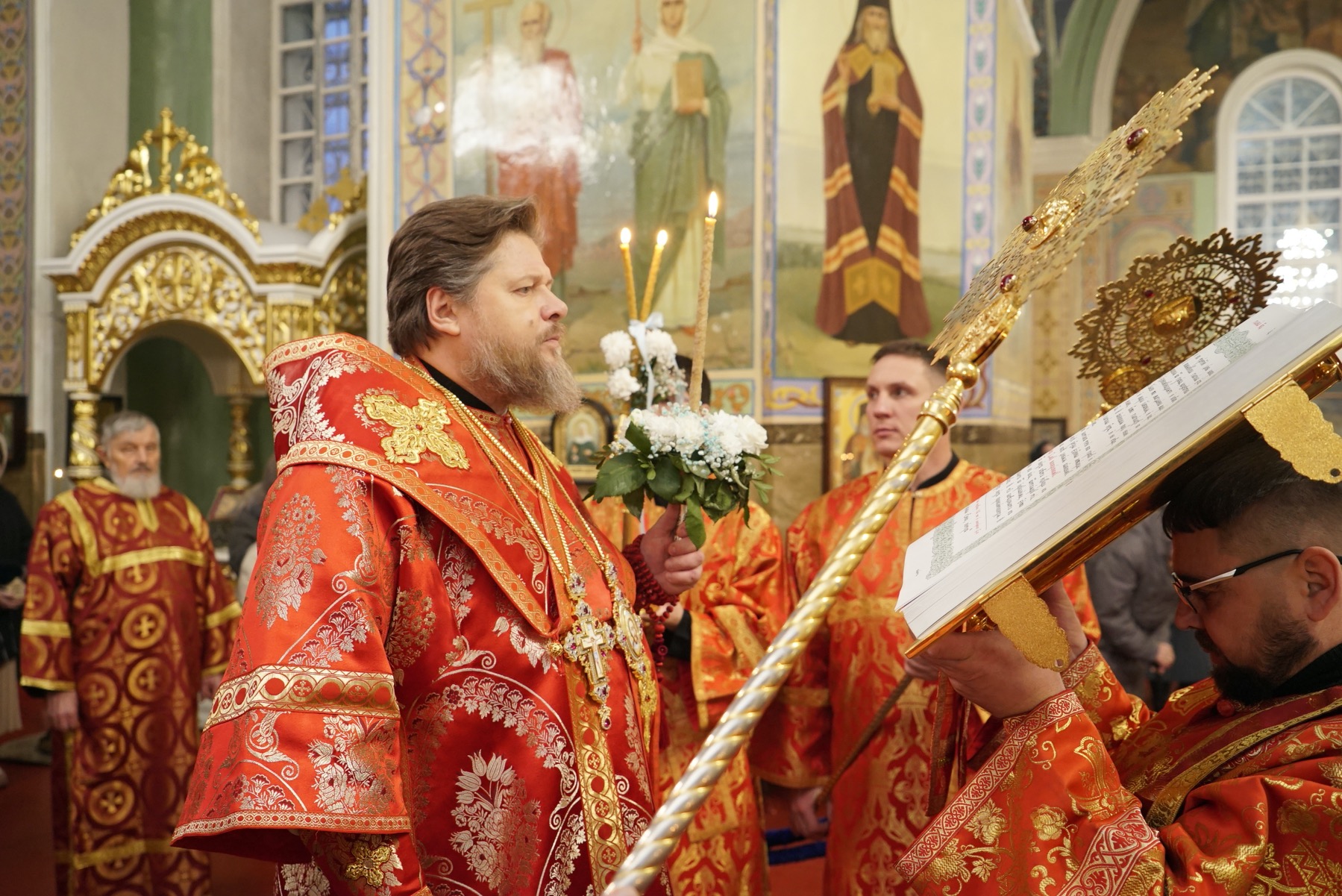 Его Преосвященству сослужили: ключарь собора протоиерей Александр Петров, протоиерей Владимир Ащеулов, иерей Иоанн Шкуропацкий, диакон Вадим Шпак, диакон Никита Гологузов, диакон Артемий Волков.