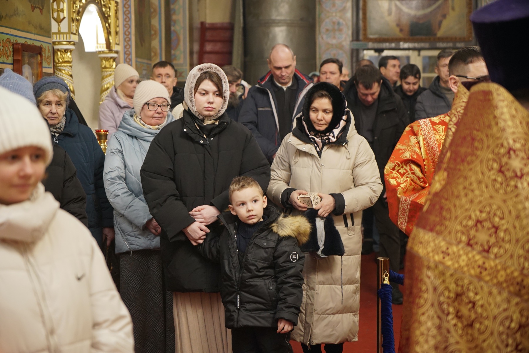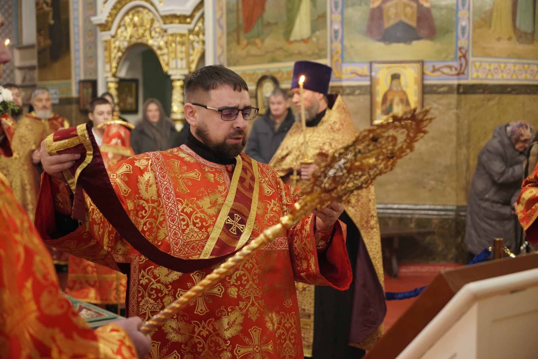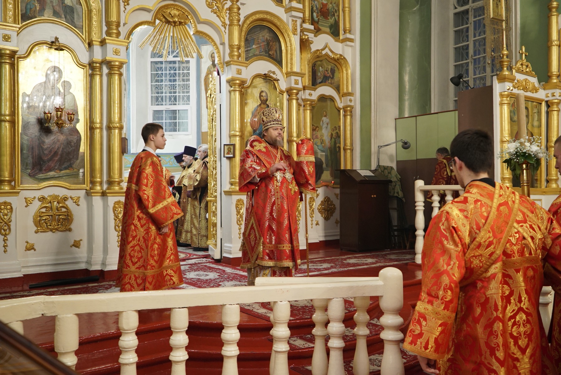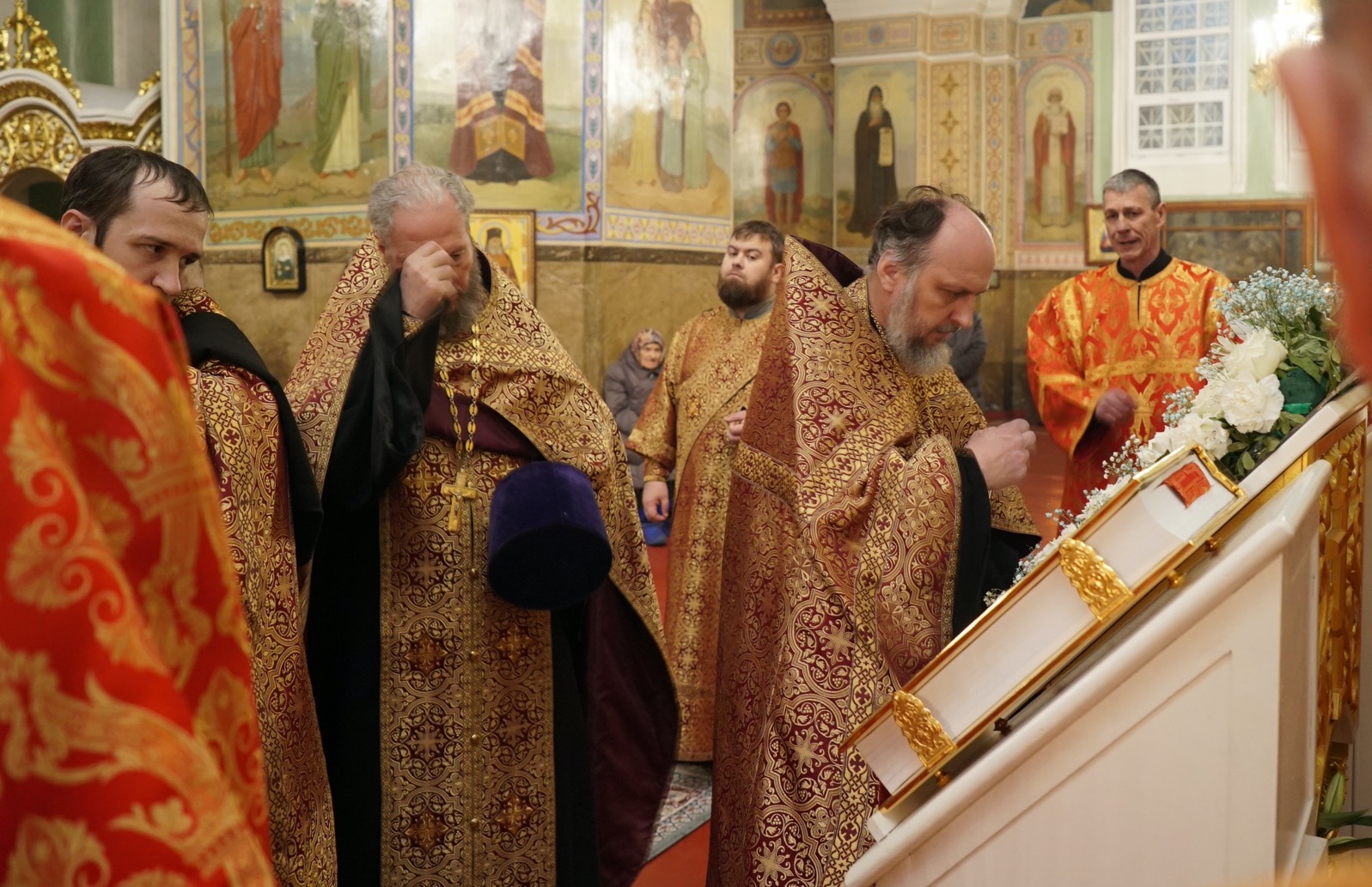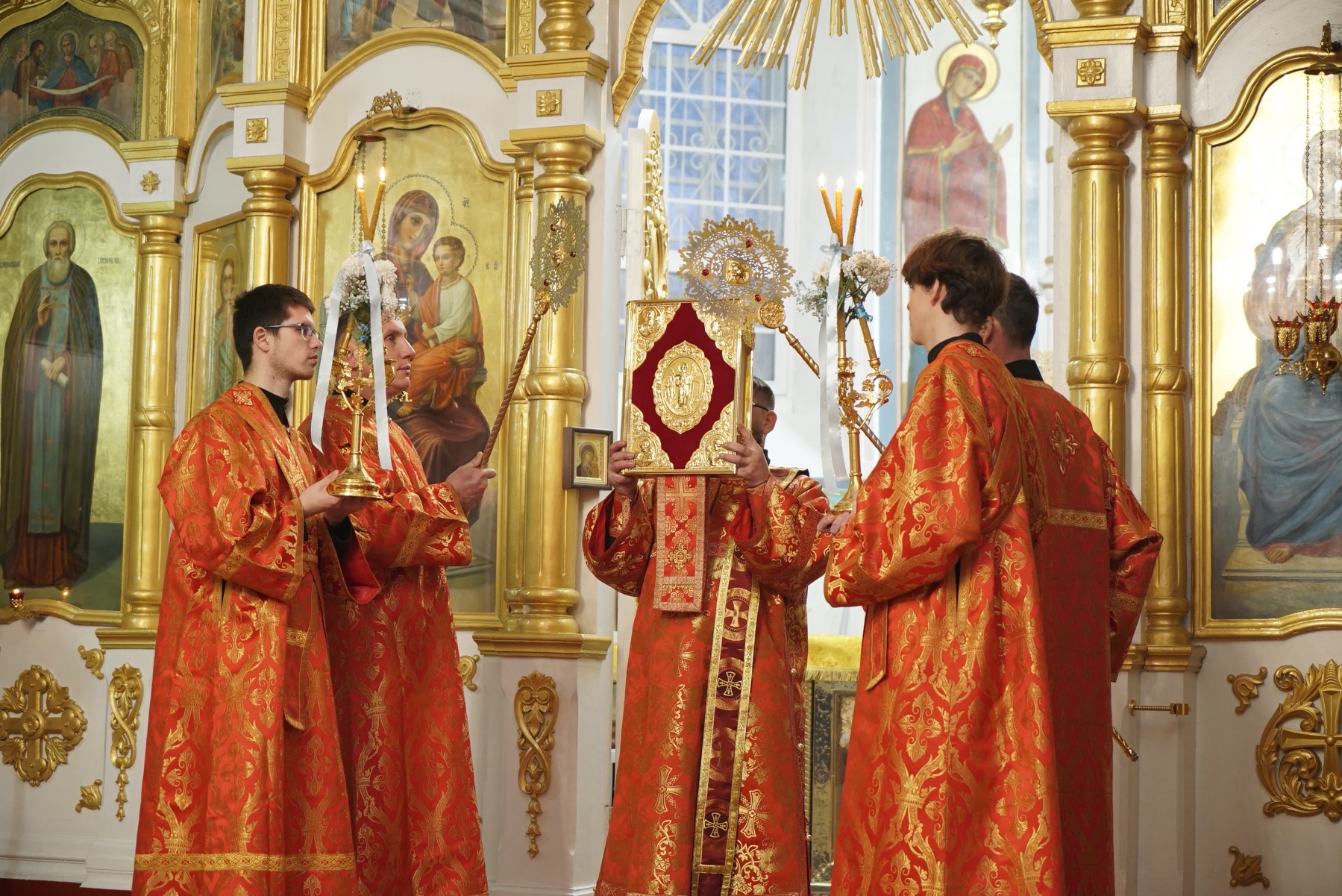 Его Преосвященству сослужили: ключарь собора протоиерей Александр Петров, протоиерей Владимир Ащеулов, иерей Иоанн Шкуропацкий, диакон Вадим Шпак, диакон Никита Гологузов, диакон Артемий Волков.