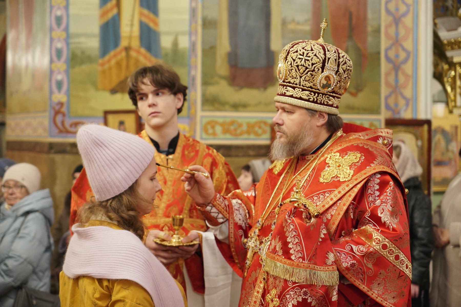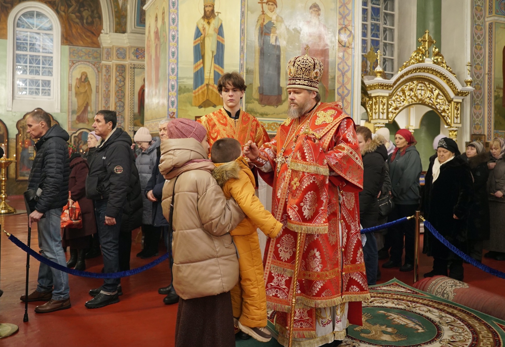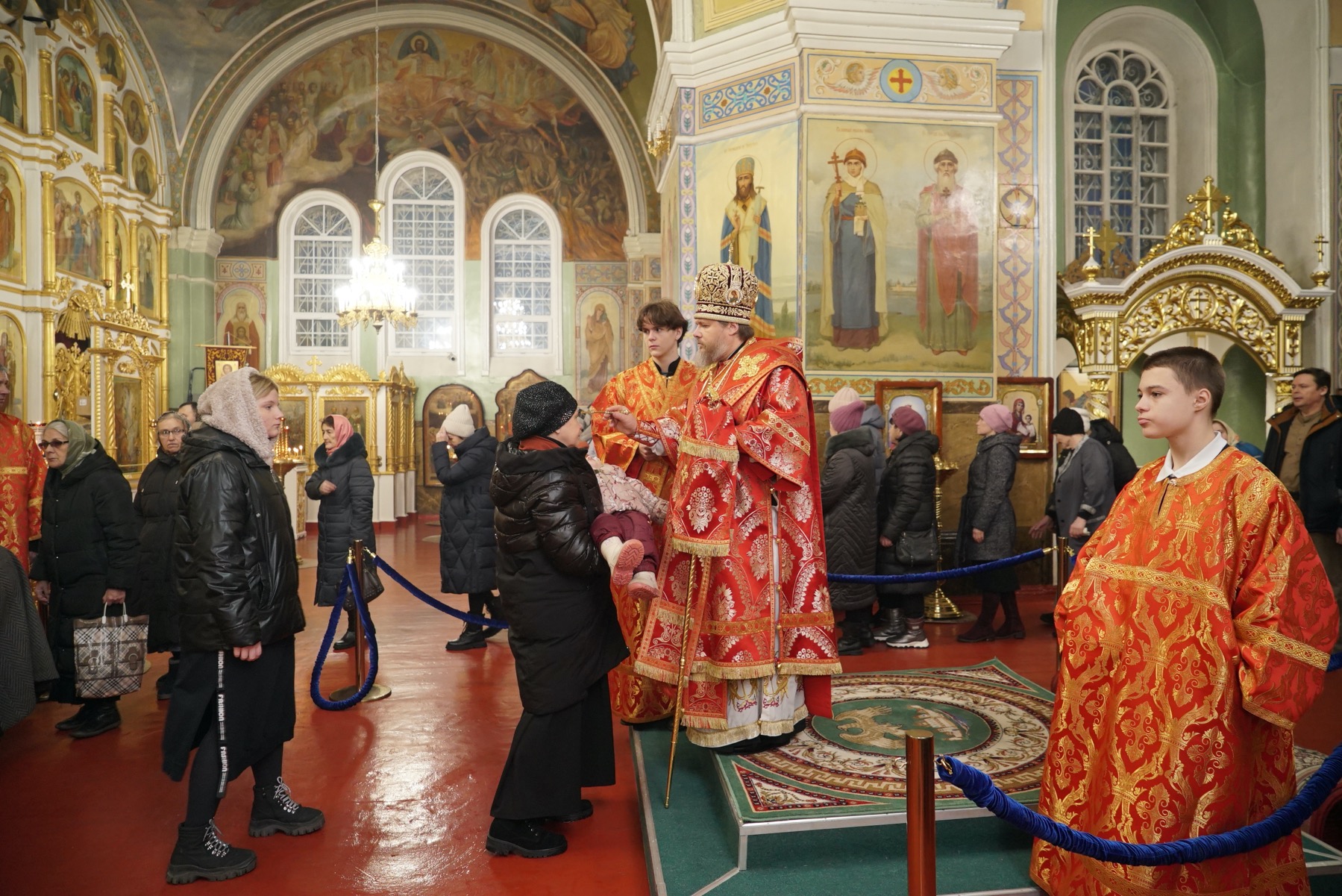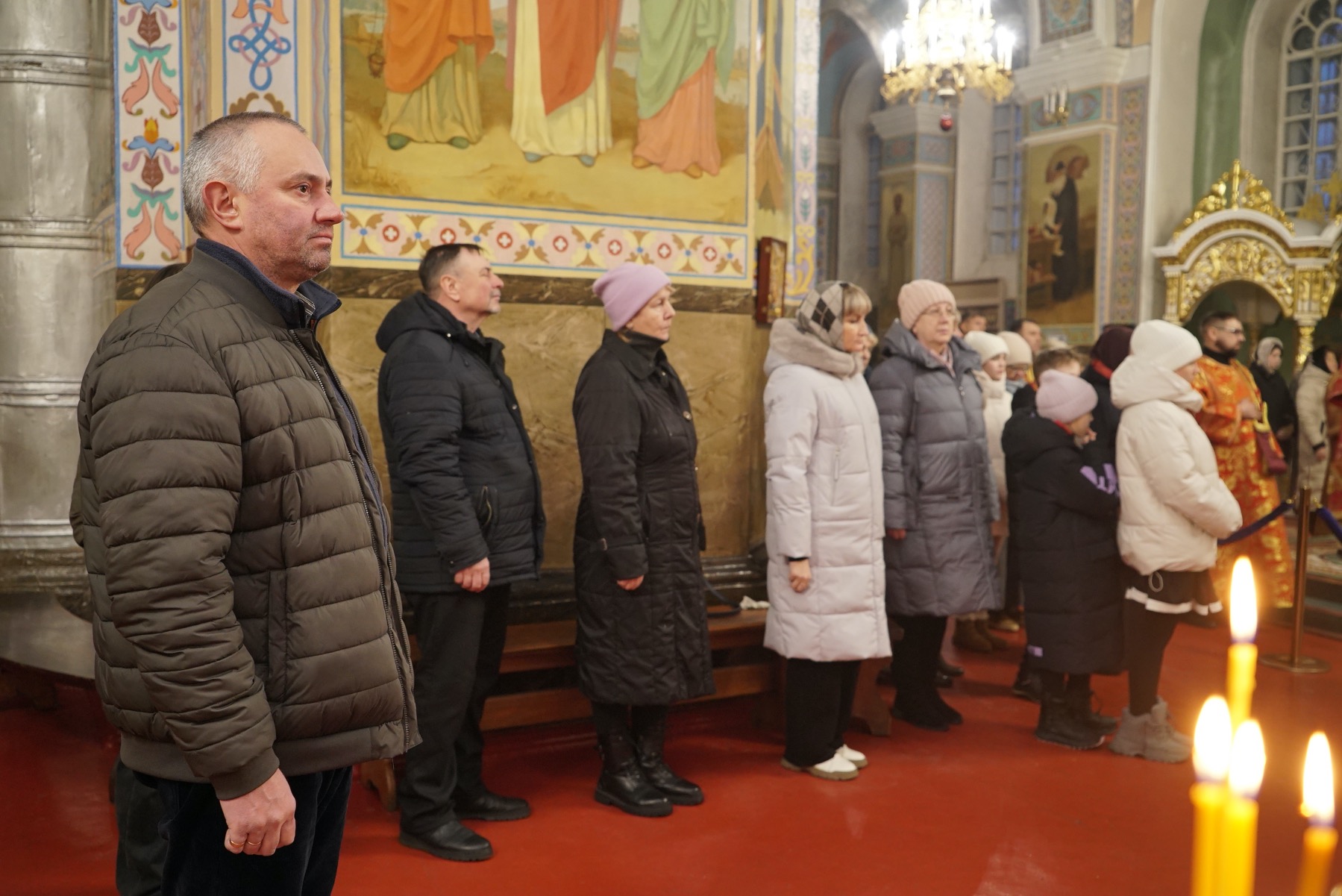 Его Преосвященству сослужили: ключарь собора протоиерей Александр Петров, протоиерей Владимир Ащеулов, иерей Иоанн Шкуропацкий, диакон Вадим Шпак, диакон Никита Гологузов, диакон Артемий Волков.