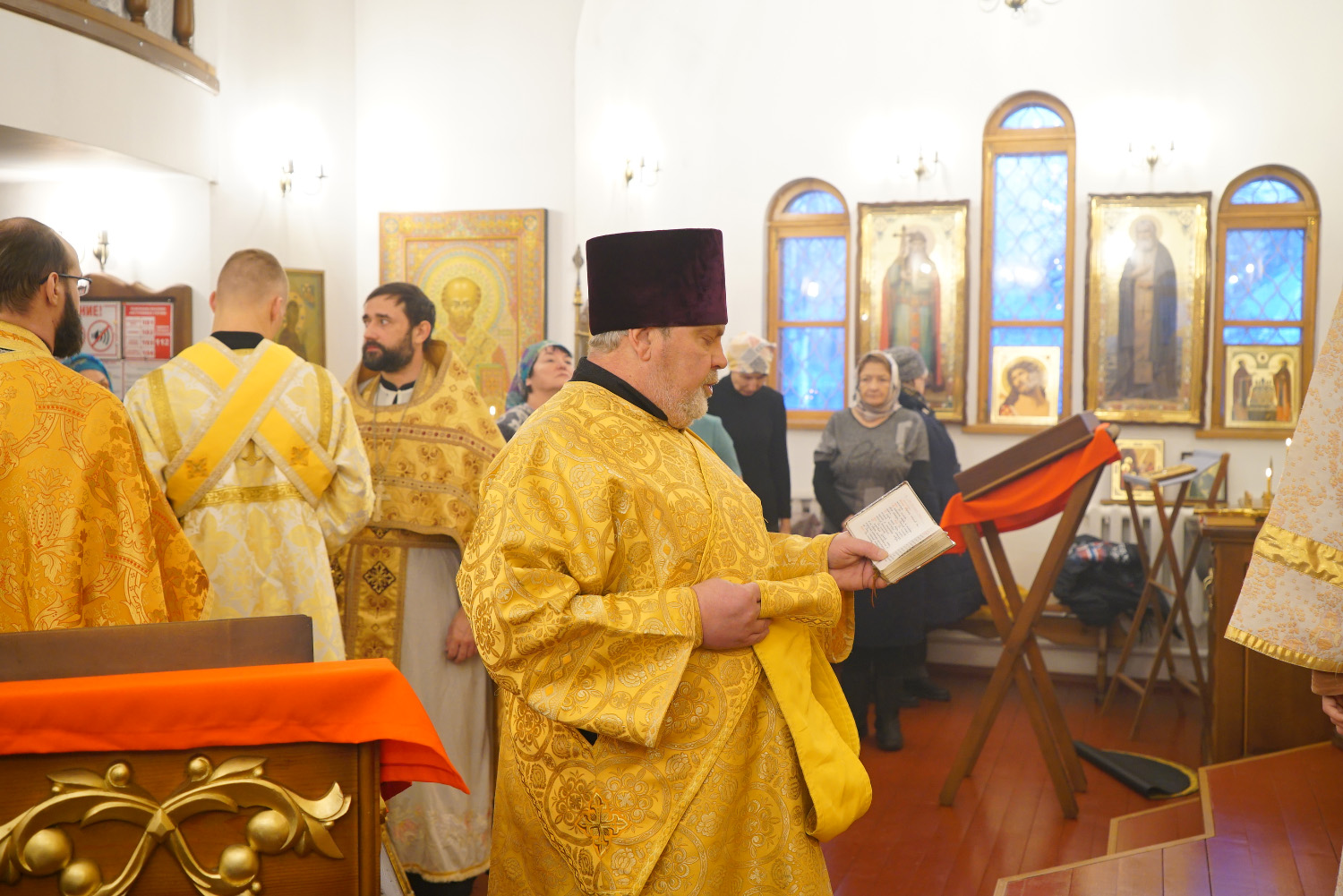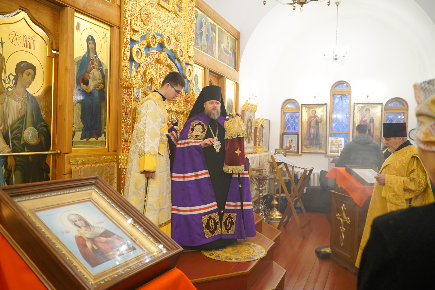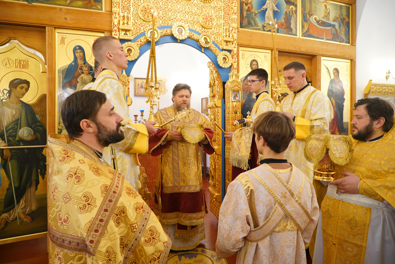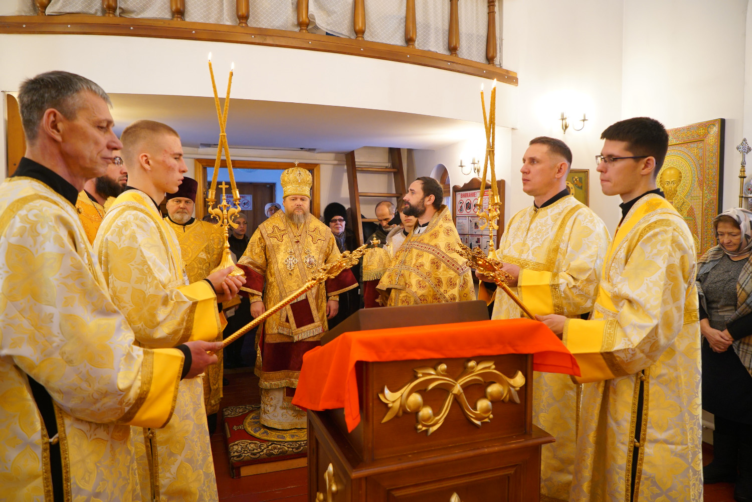 Его Преосвященству сослужили: настоятель храма иерей Герман Ходаковский, иерей Димитрий Щербаков, иерей Иоанн Ходаковский (Новосибирская митрополия), диакон Вадим Шпак.