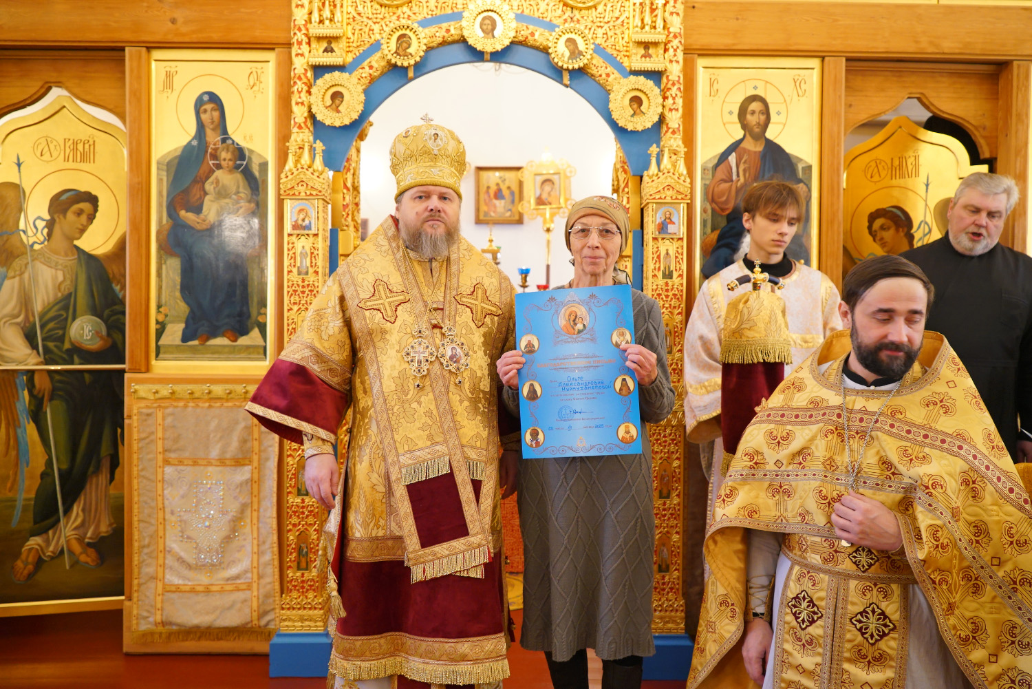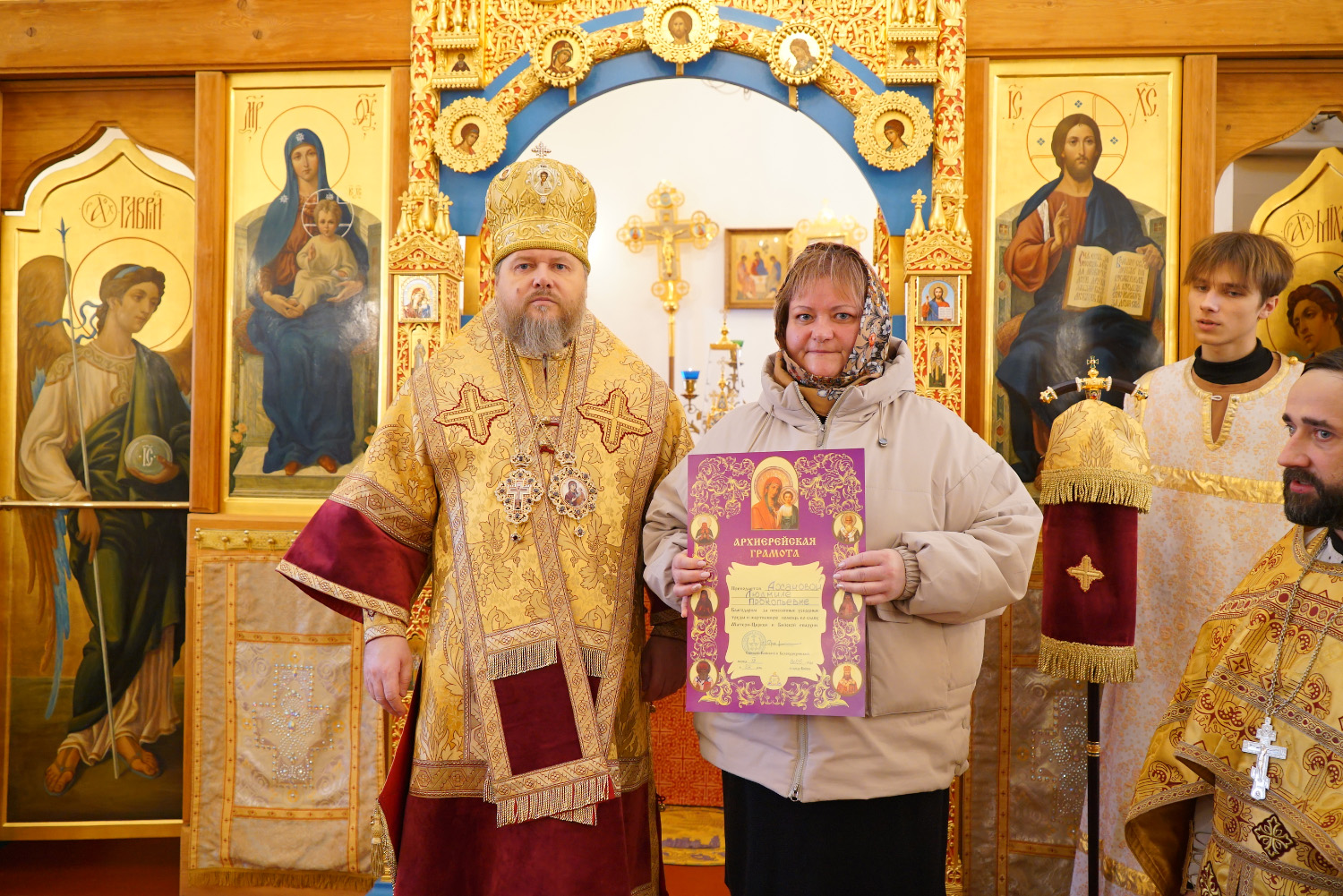 Затем состоялось награждение Архиерейскими грамотами и Благодарственными письмами настоятеля и активных прихожан храма святой мученицы Татианы.