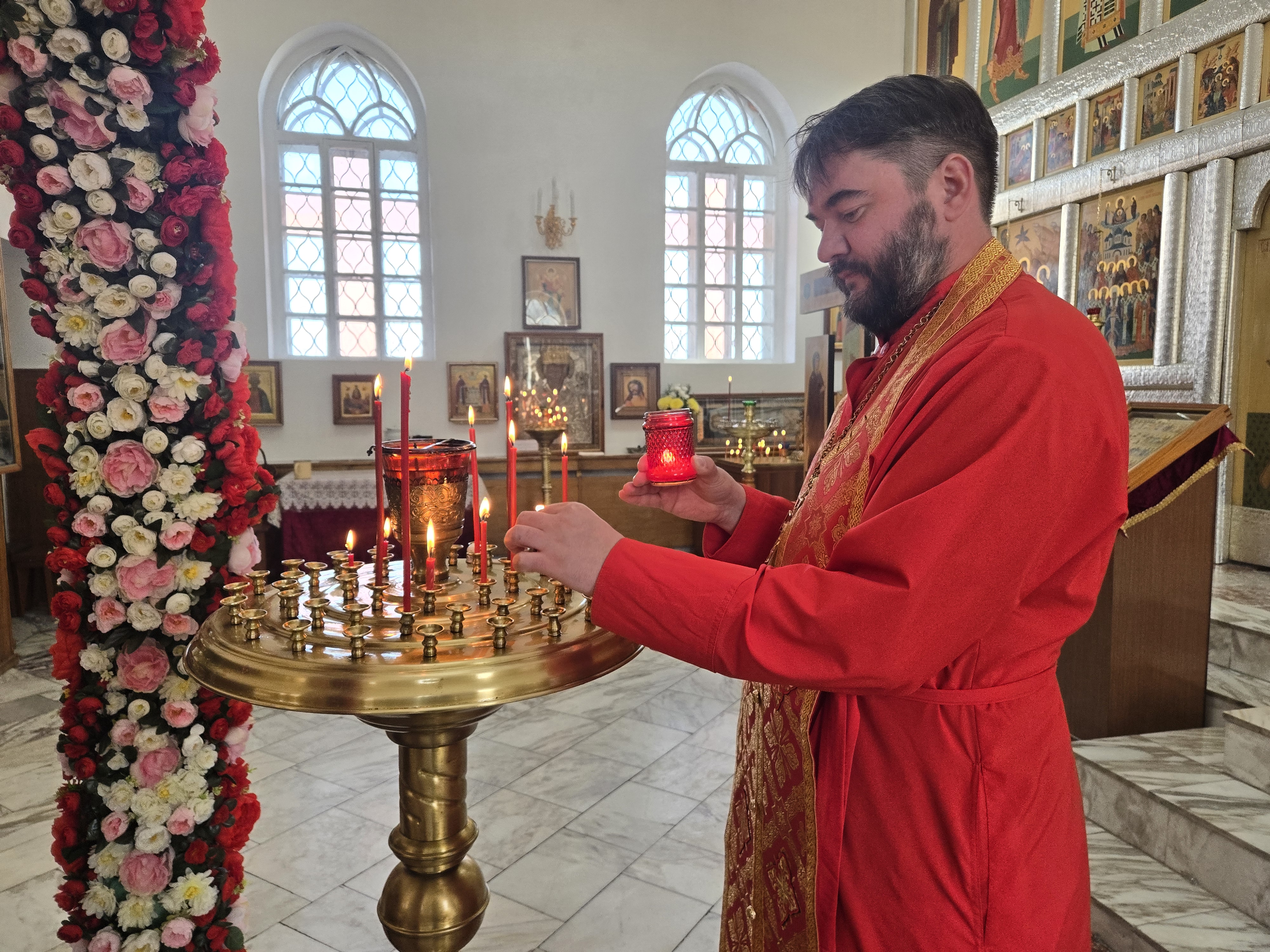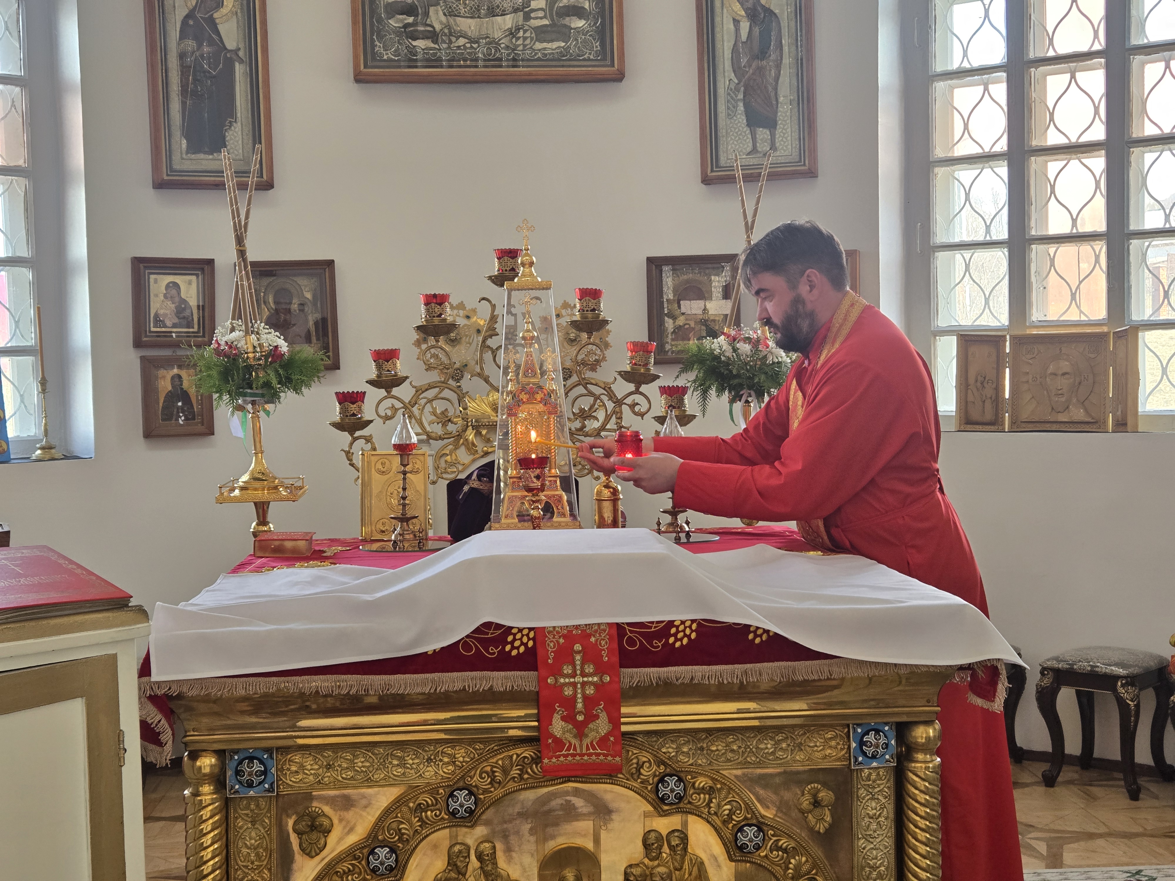Ключарь Пантелеимоновского собора, благочинный Белокурихинского округа иерей Роман Третьяков принял святыню и возжег все лампады и свечи от Благодатного огня.