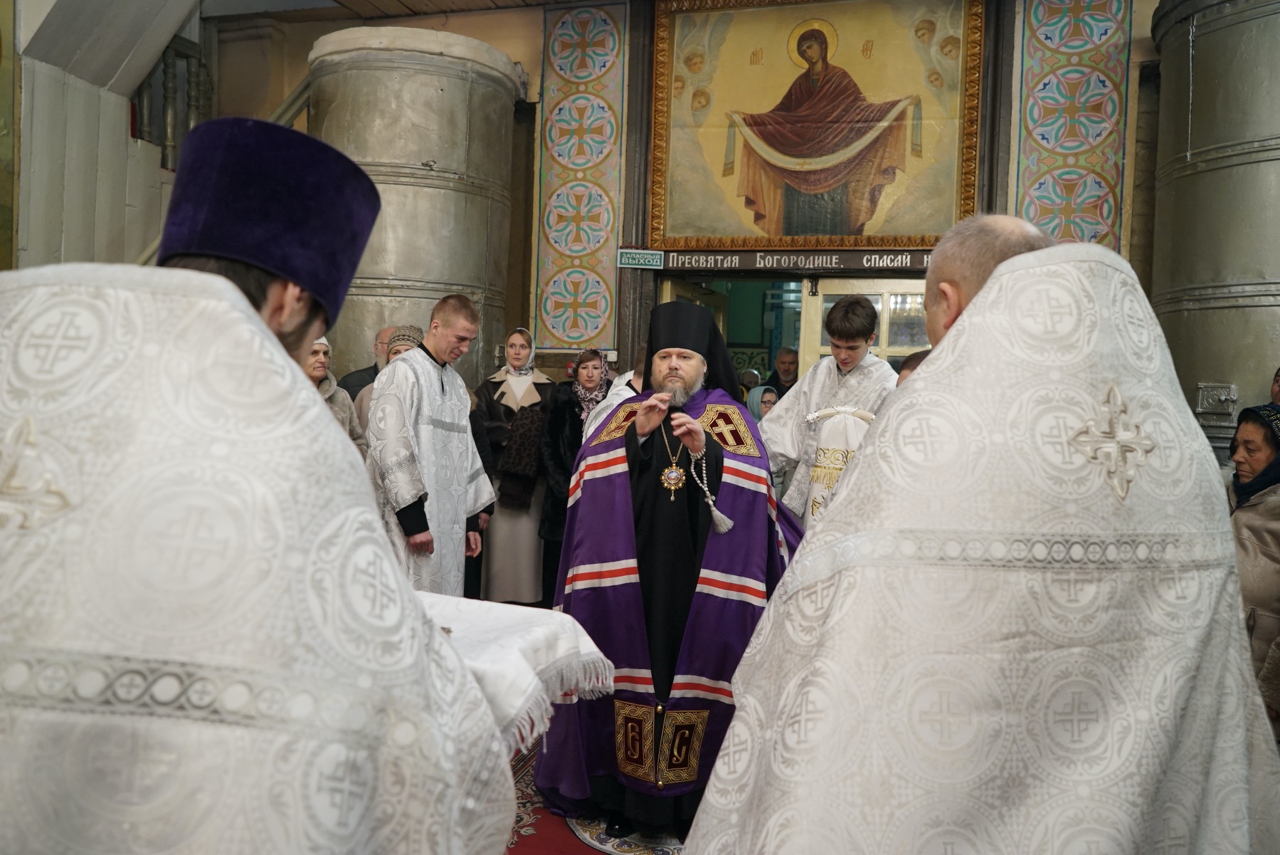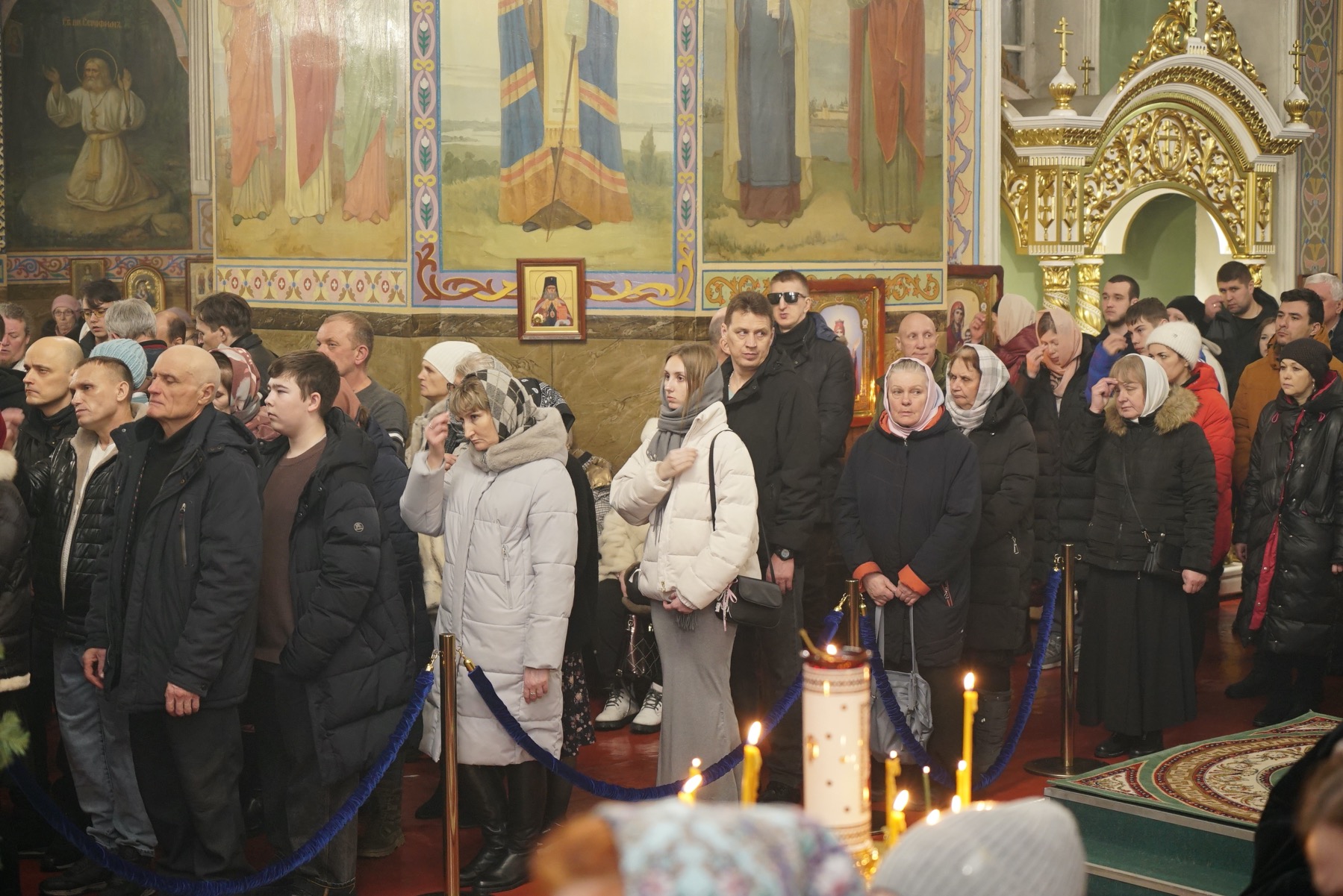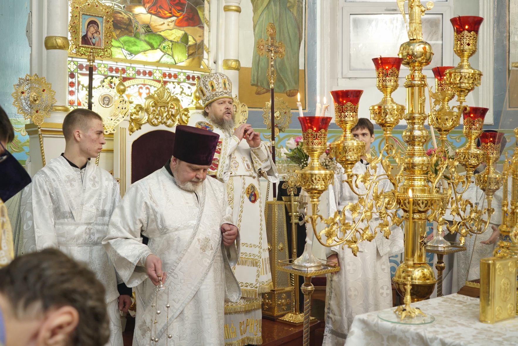 Преосвященному владыке сослужили: ключарь собора протоиерей Александр Петров, иерей Иоанн Шкуропацкий, иерей Сергий Казанцев, диакон Вадим Шпак, диакон Никита Гологузов.