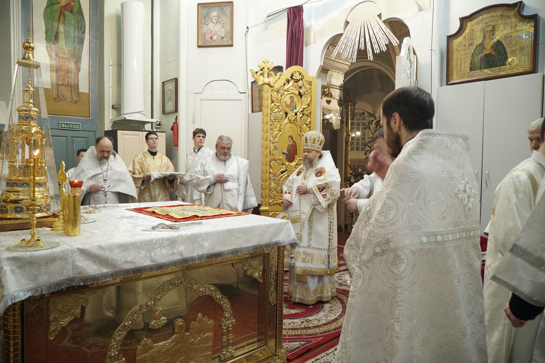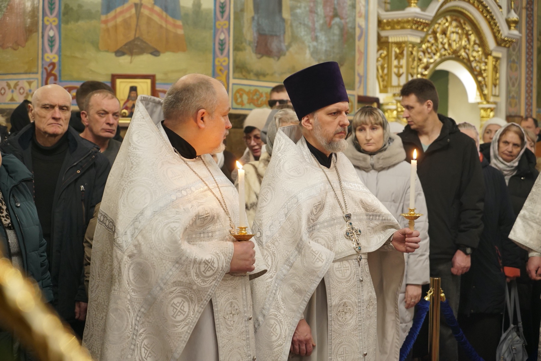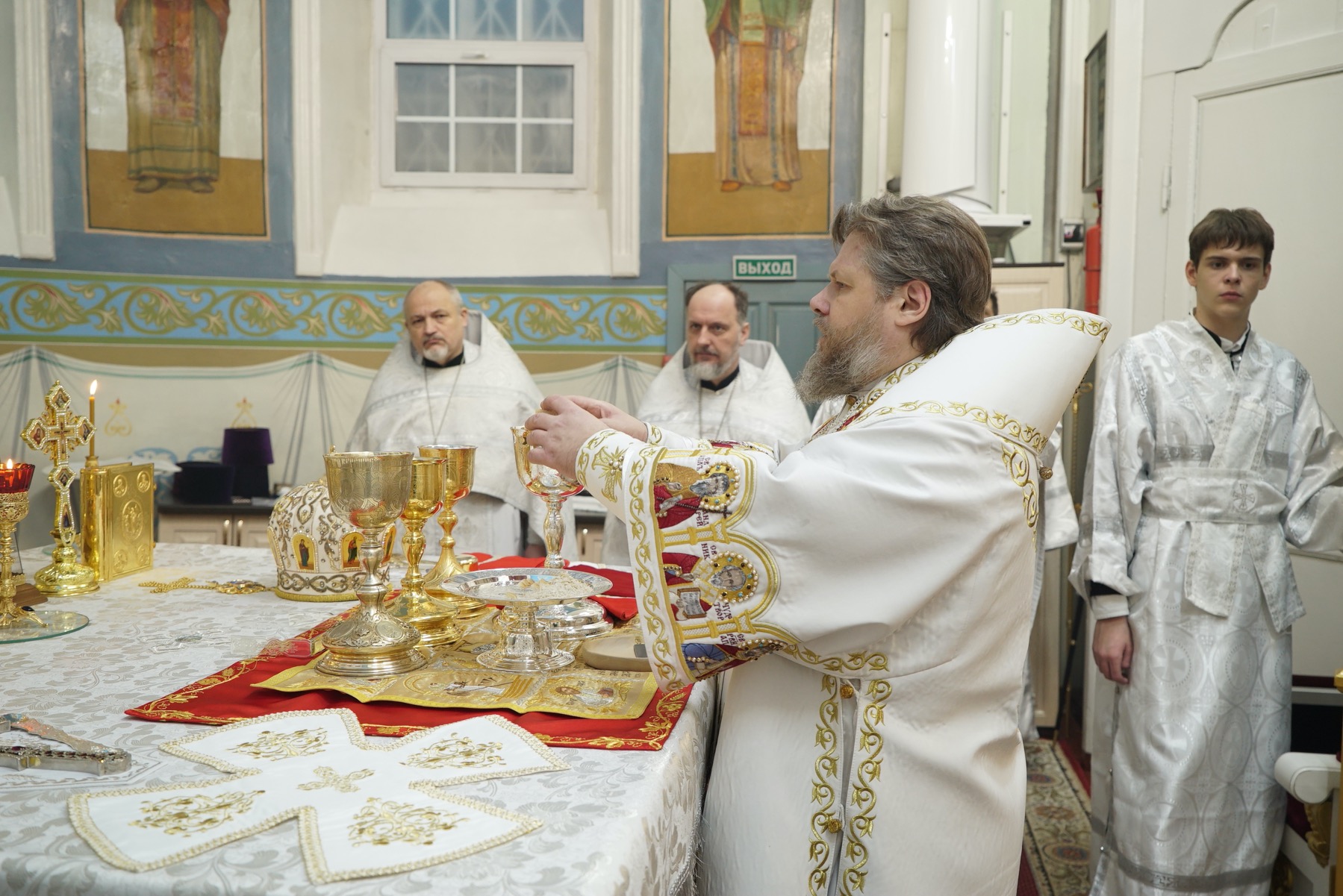 Преосвященному владыке сослужили: ключарь собора протоиерей Александр Петров, иерей Иоанн Шкуропацкий, иерей Сергий Казанцев, диакон Вадим Шпак, диакон Никита Гологузов.
