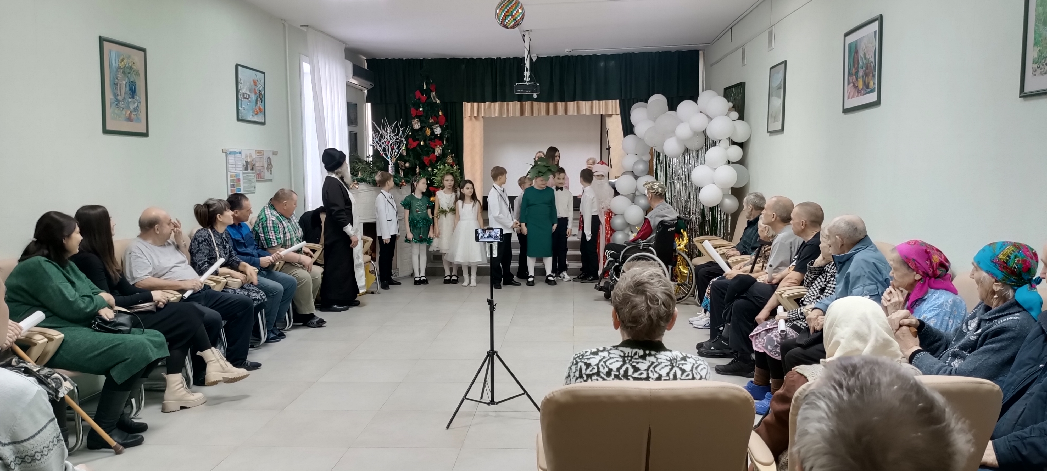 В праздник Рождества Христова настоятель Покровского храма Свято-Макарьевской монашеской общины вместе с воспитанниками воскресной школы и их родителями посетил дом-интернат для престарелых и инвалидов