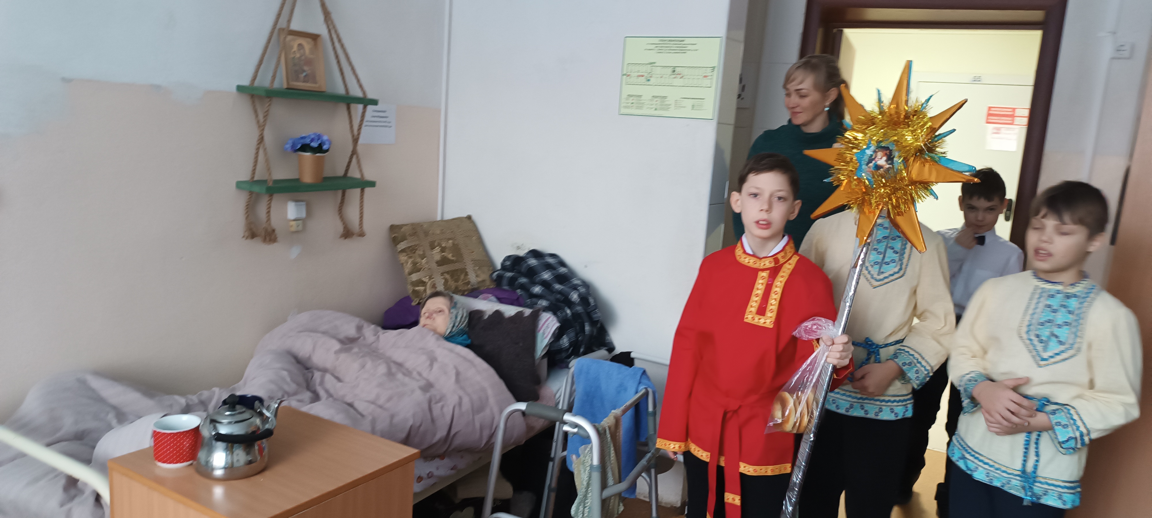 Отец Макарий поздравил всех с праздником и окропил святой водой. Дети раздавали конфеты. Проживающих, которые не могут передвигаться самостоятельно, дети поздравили в комнатах праздничными песнопениями и колядками.