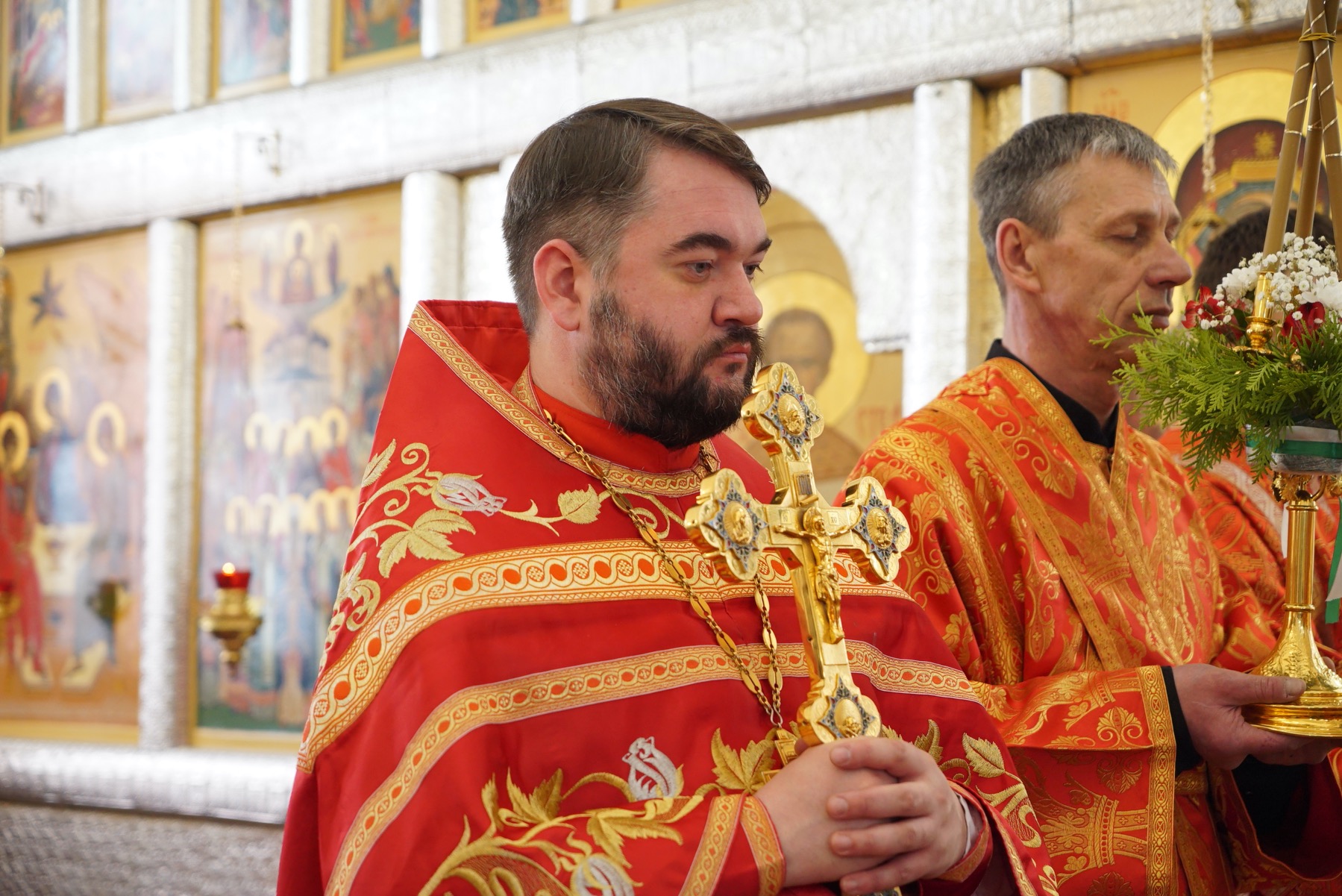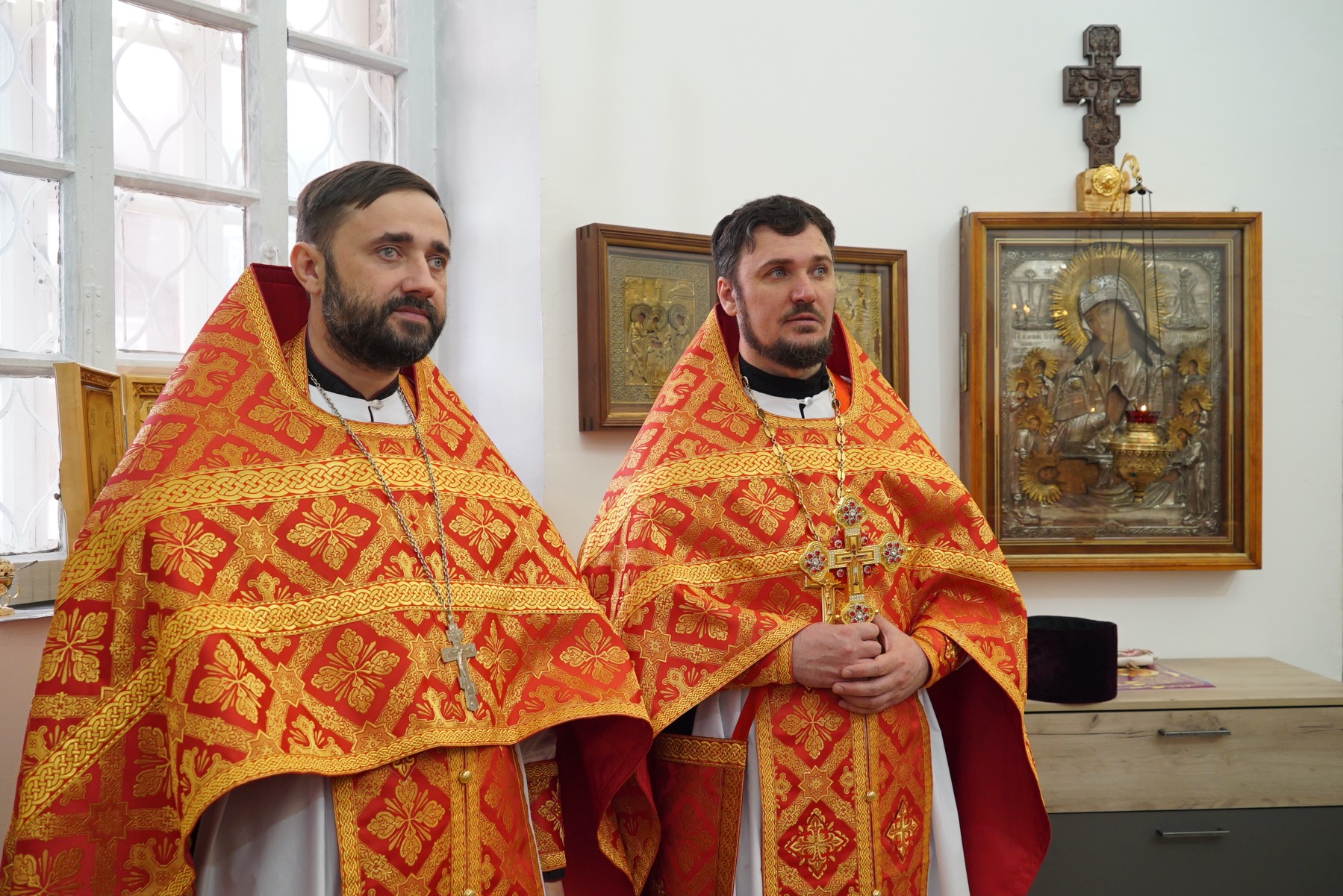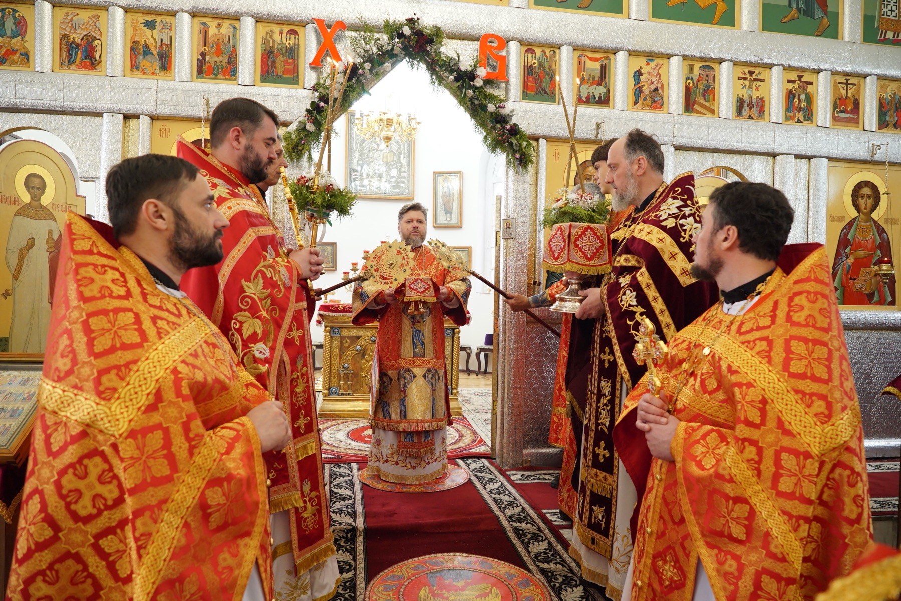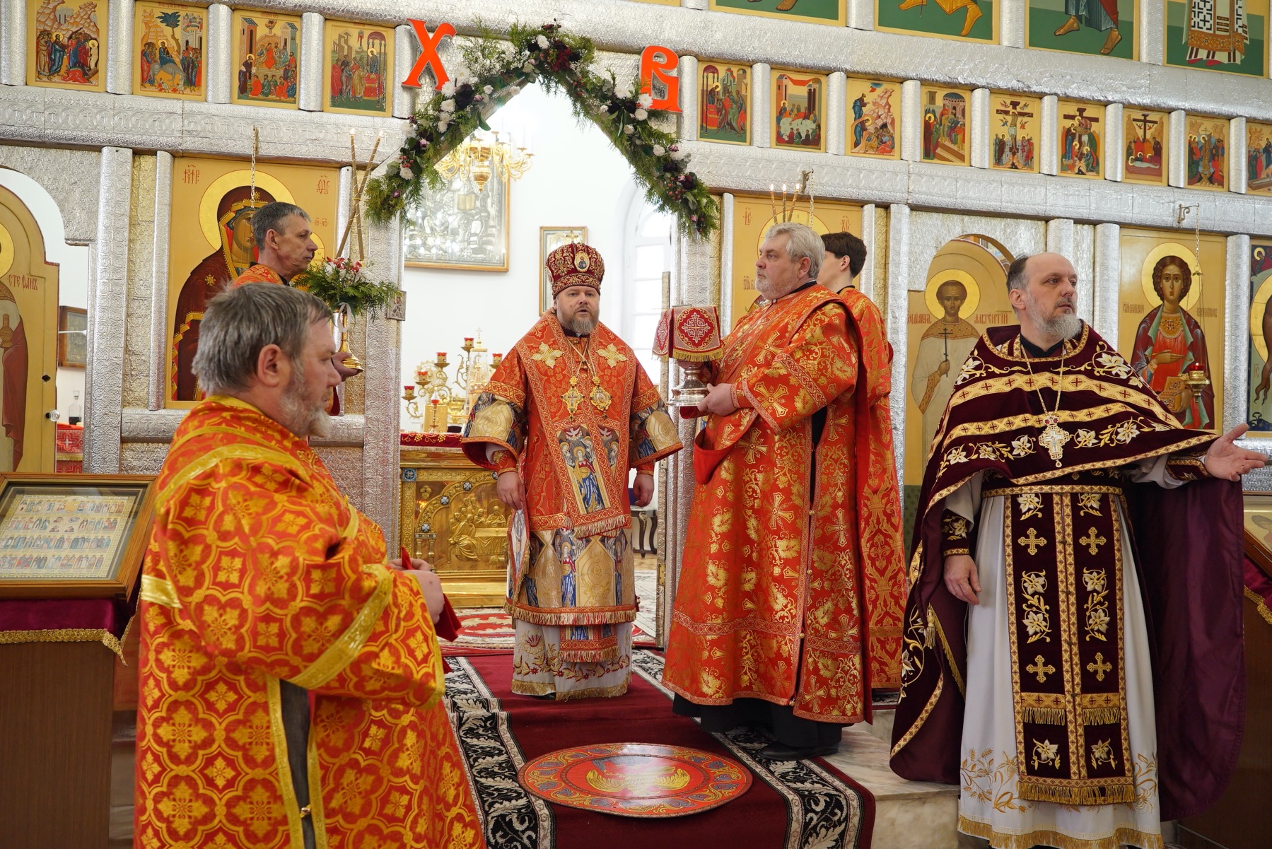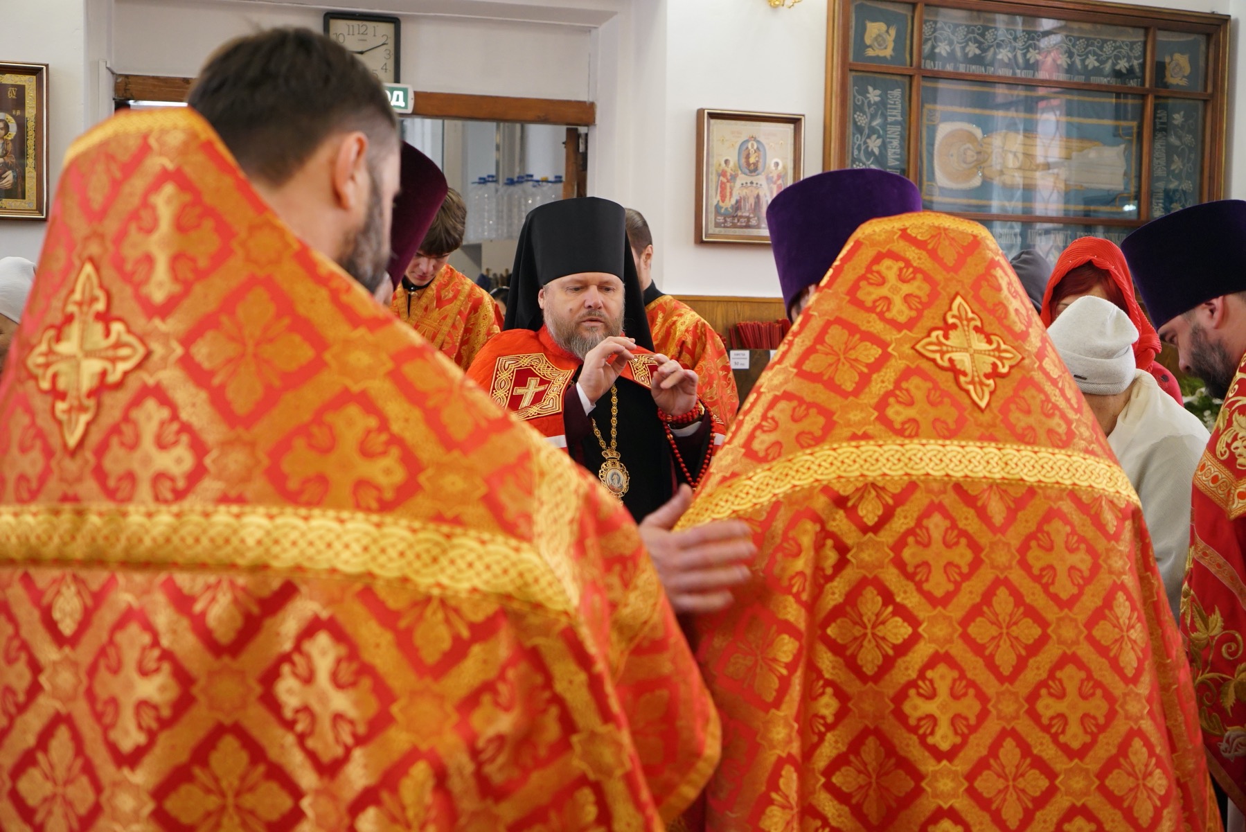 Его Преосвященству сослужили: ключарь Успенского кафедрального собора протоиерей Александр Петров, ключарь Пантелеимоновского собора иерей Роман Третьяков, иерей Андрей Новиков, иерей Герман Ходаковский, протодиакон Вадим Шпак, диакон Андрей Поповичев.