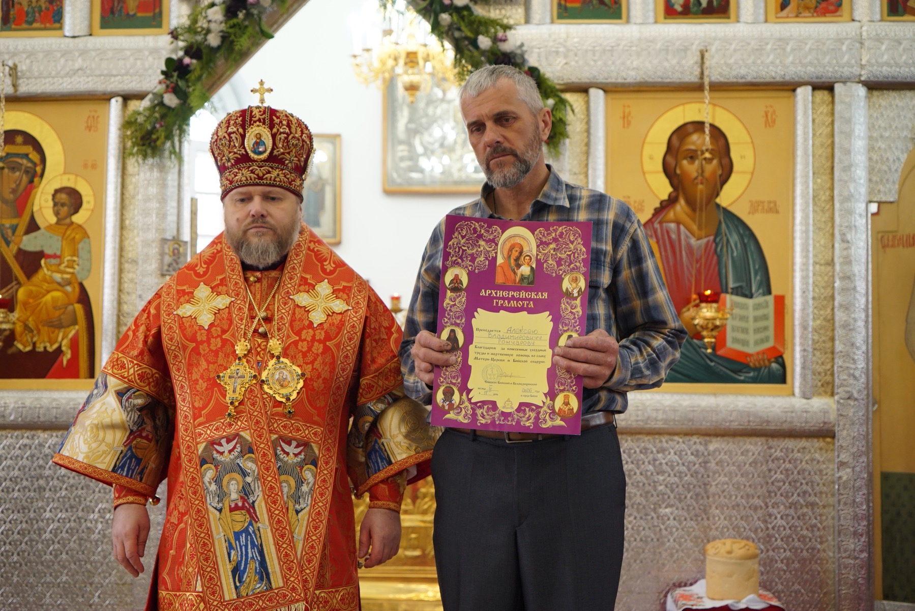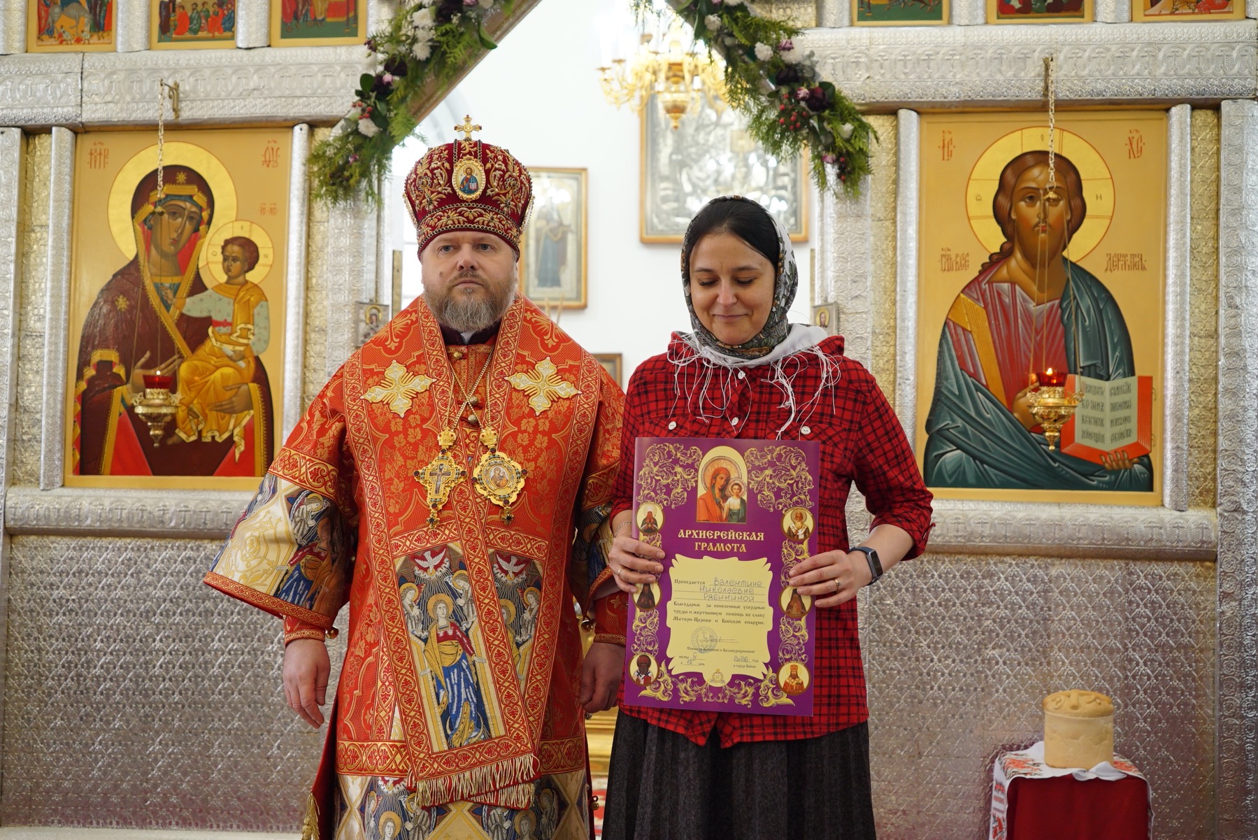 В завершение праздничного богослужения архипастырь обратился к сослужащему духовенству и всем молящимся со святительским словом, посвященным празднику Светлого Христова Воскресения, а затем наградил активных прихожан собора Архиерейскими грамотами и Благодарственными письмами.