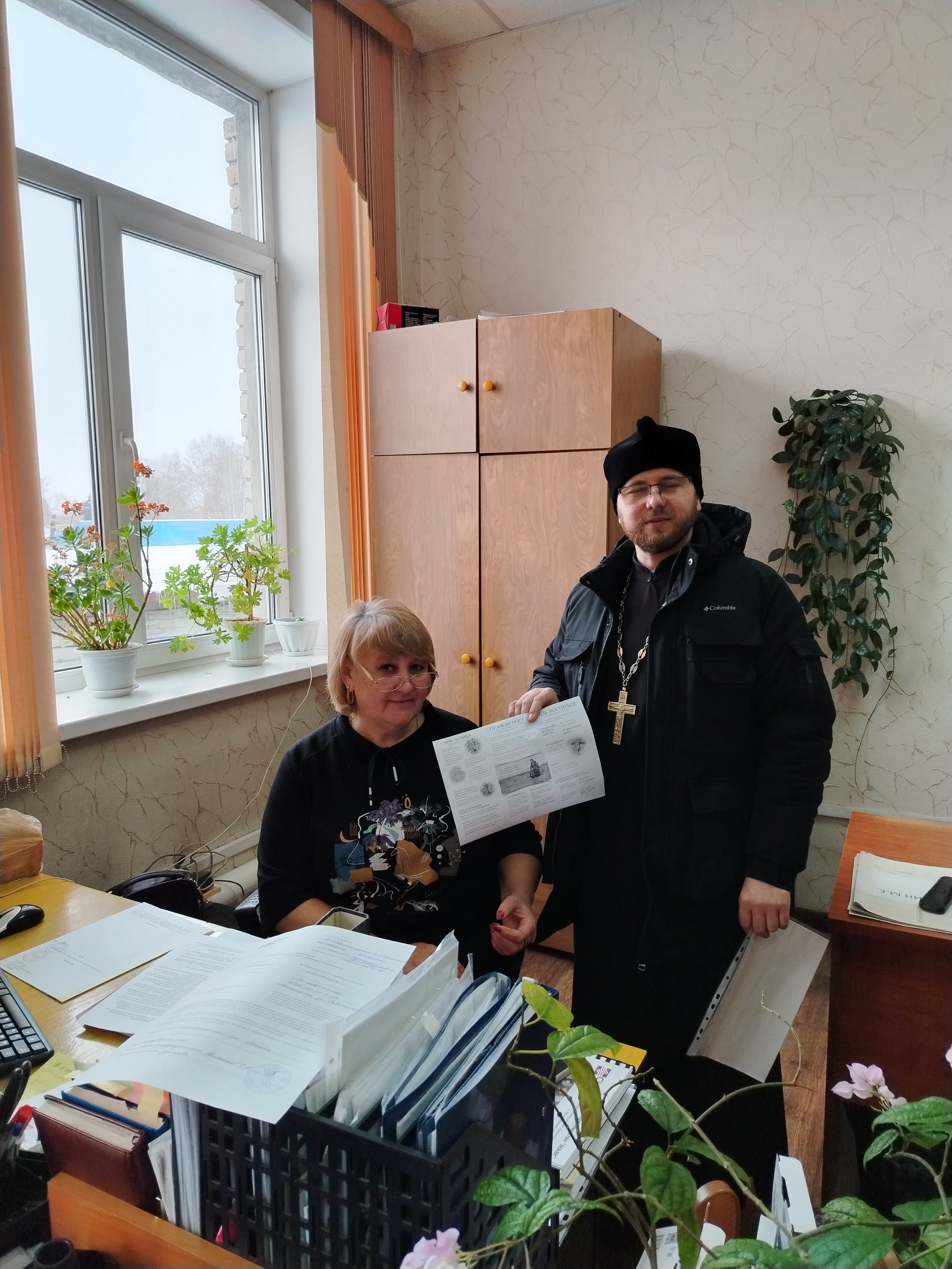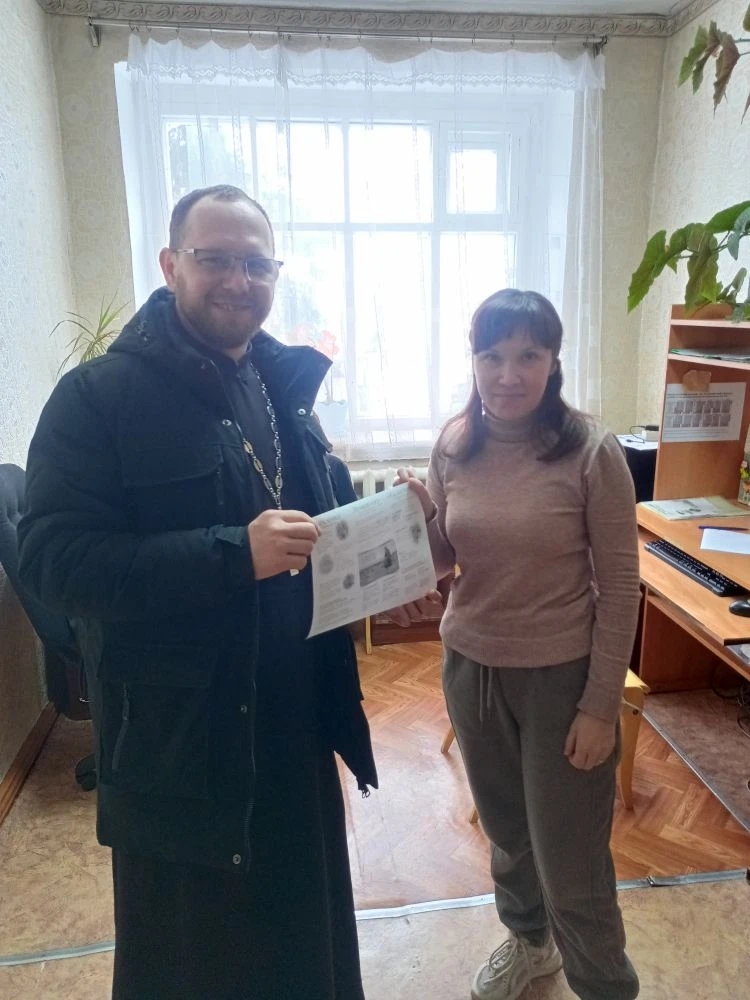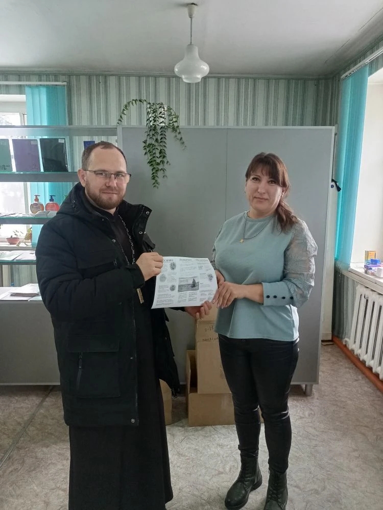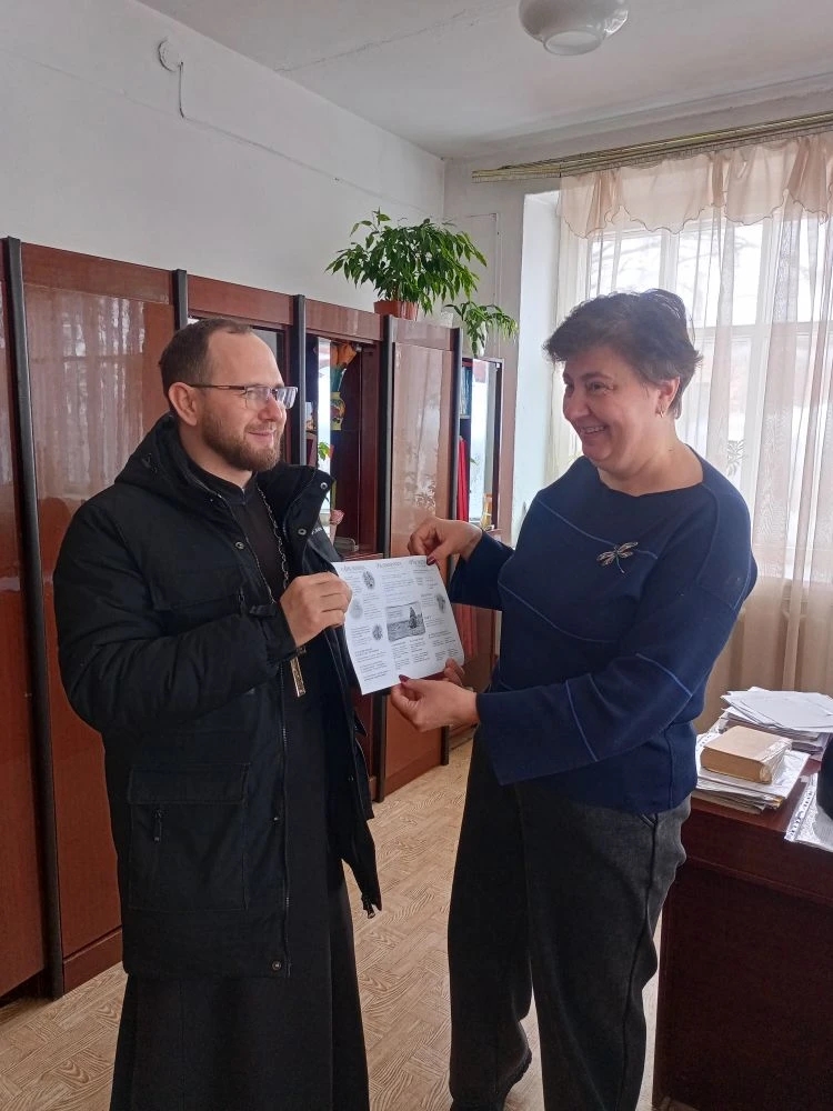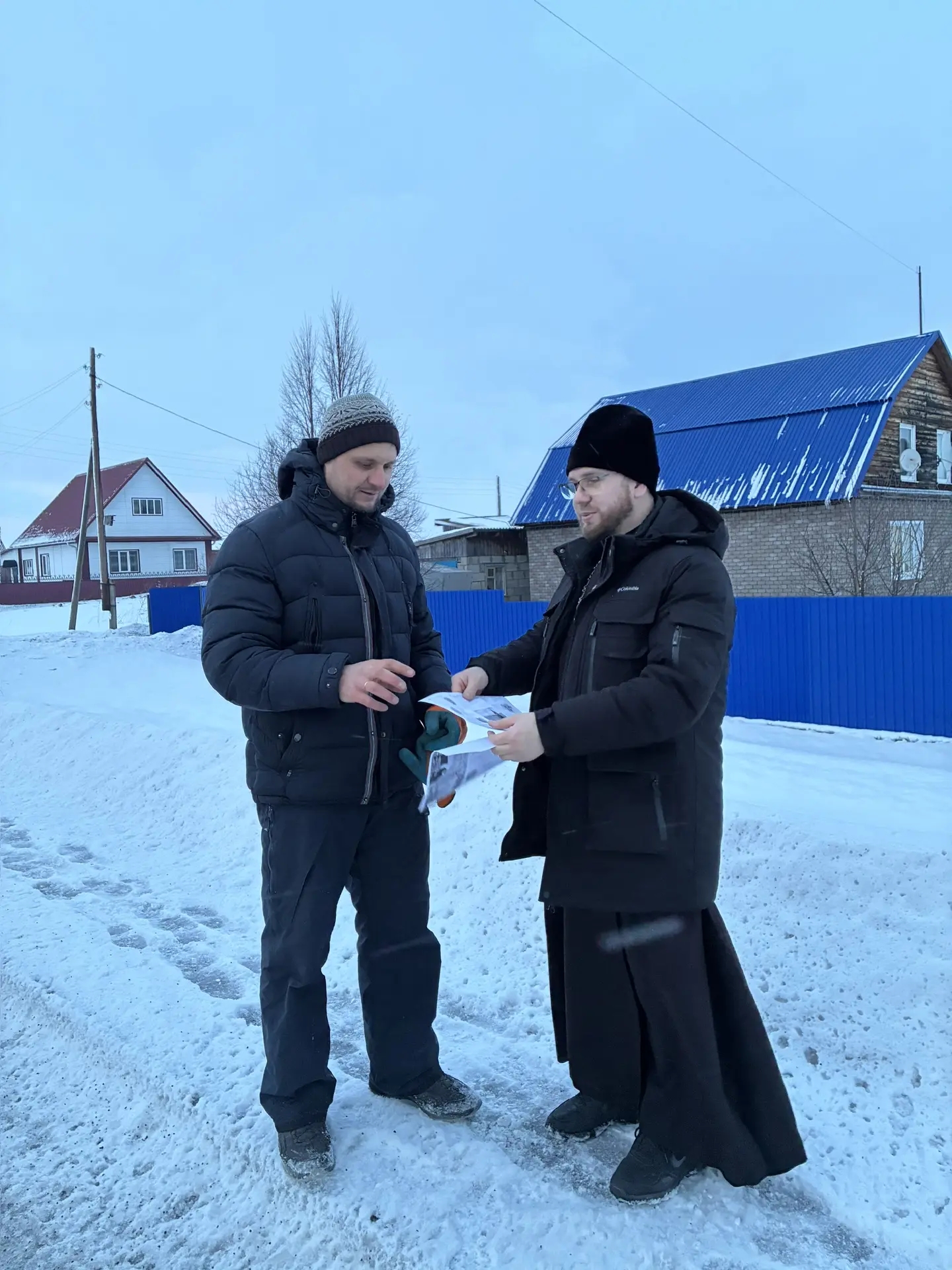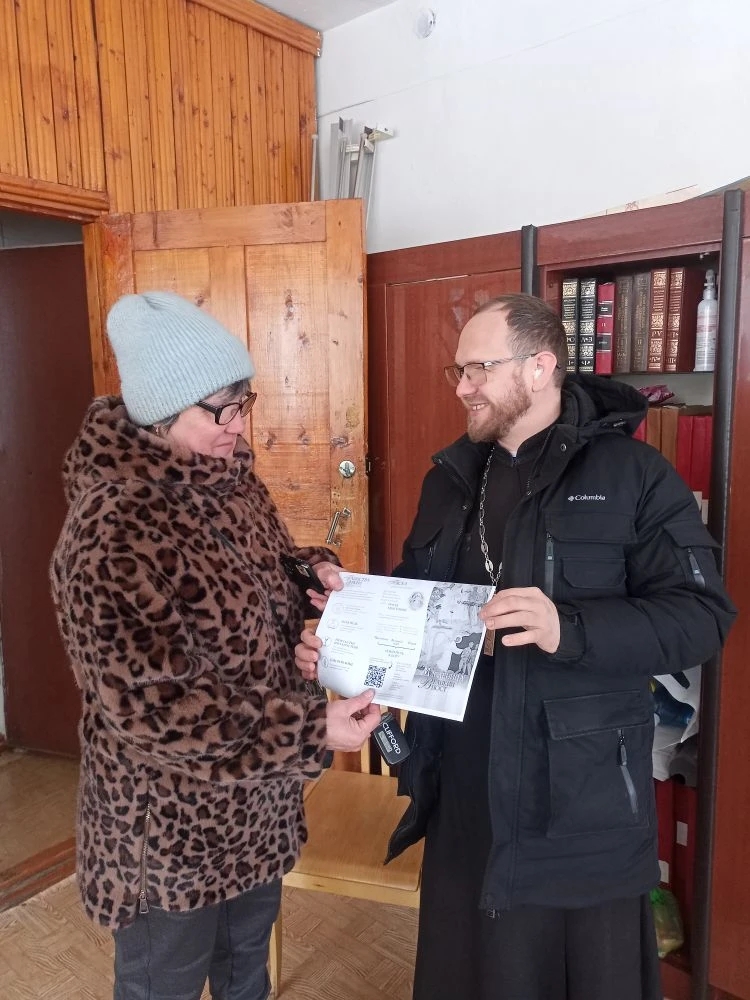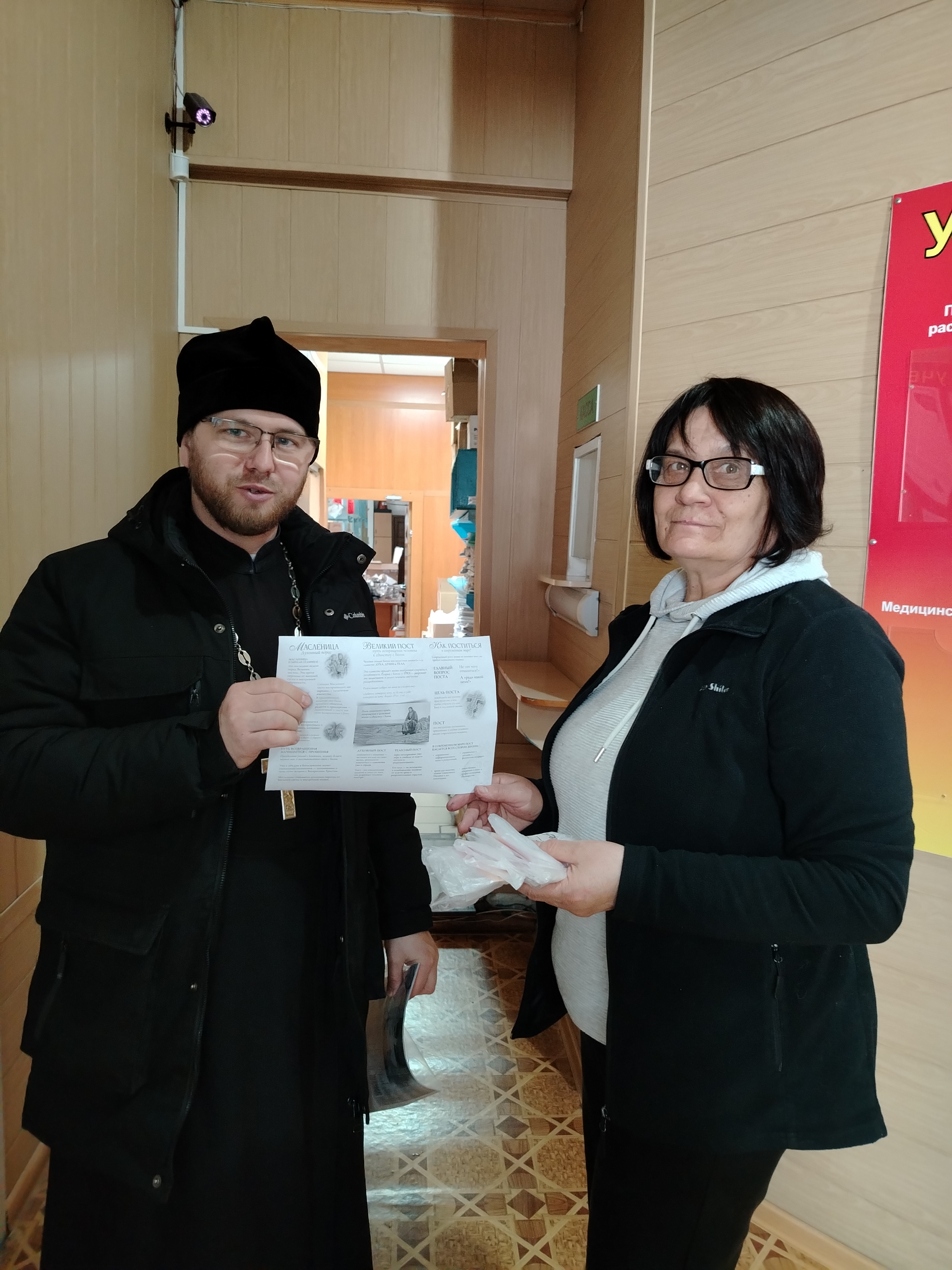 Батюшка раздавал буклеты, посвященные Масленице и Великому посту, жителям села на улицах, а также в различных организациях.