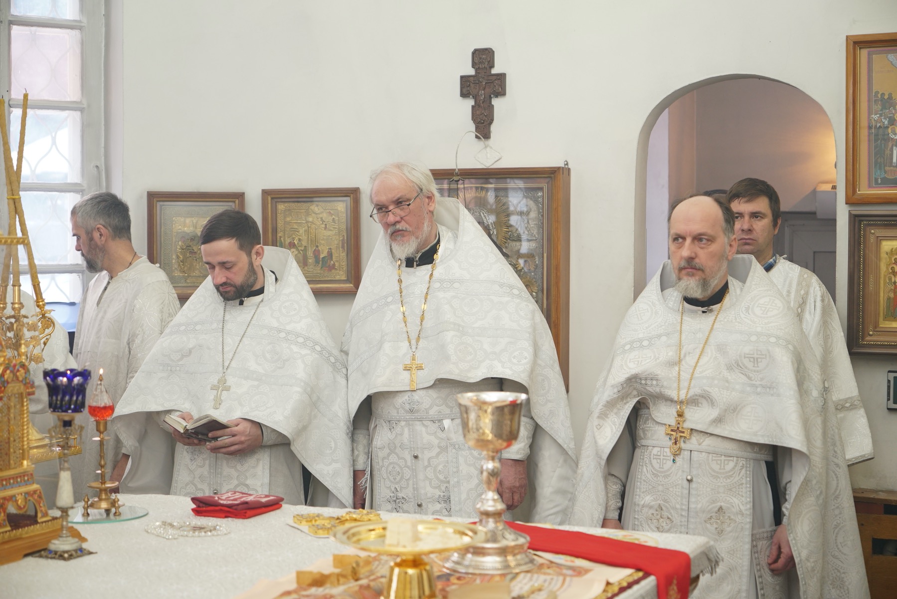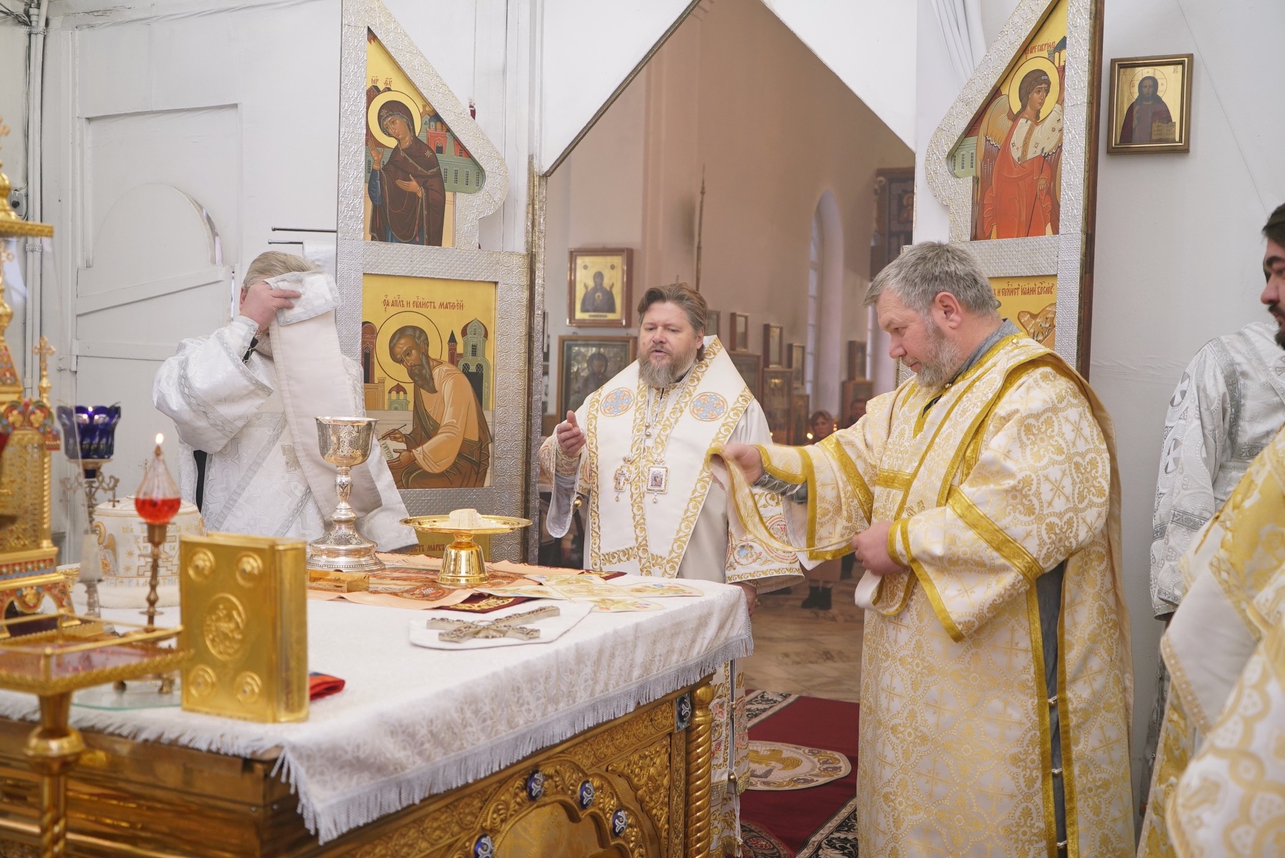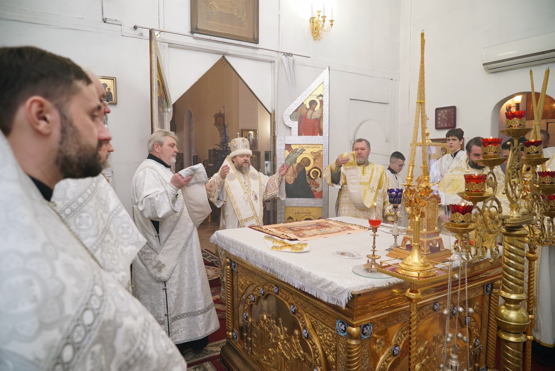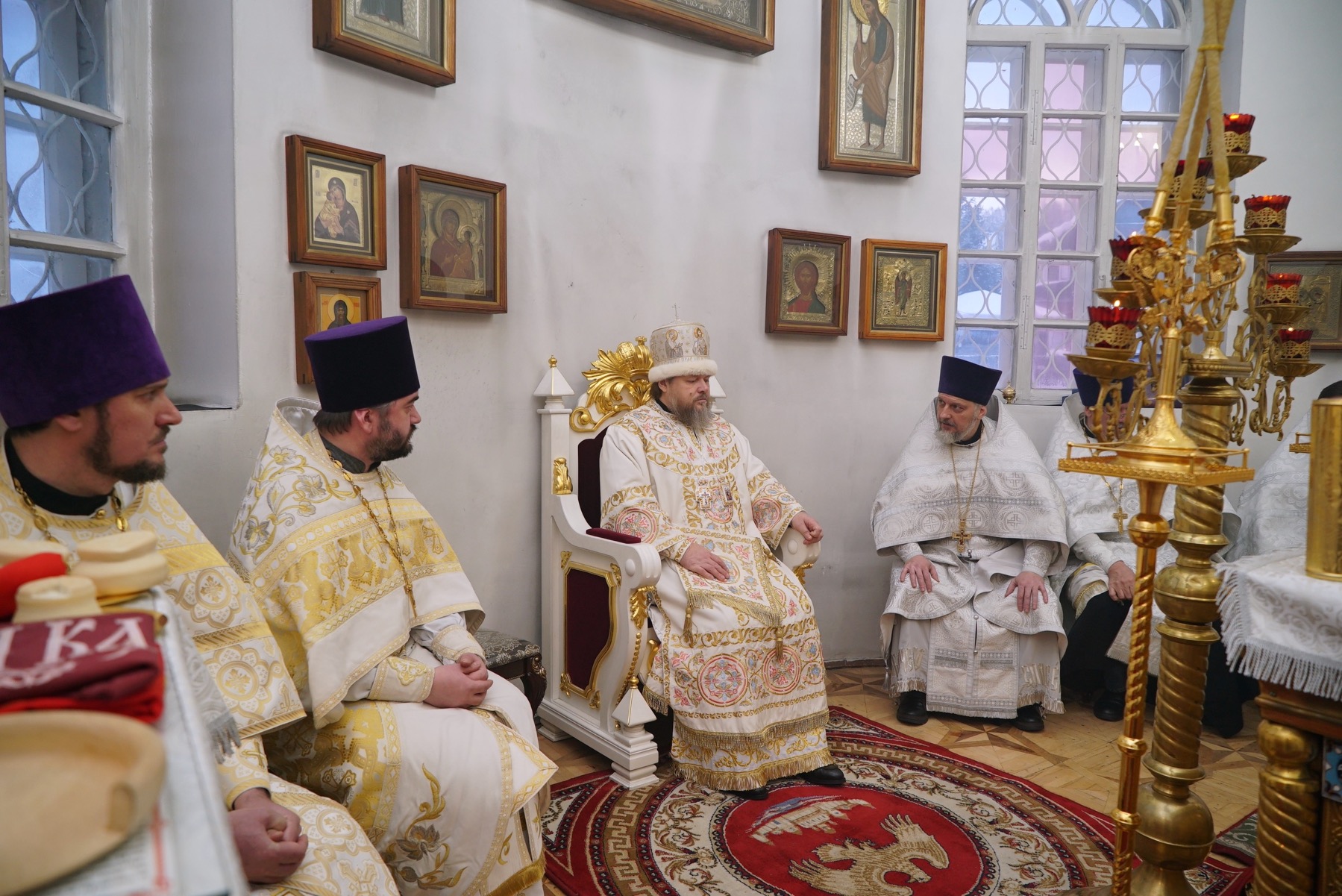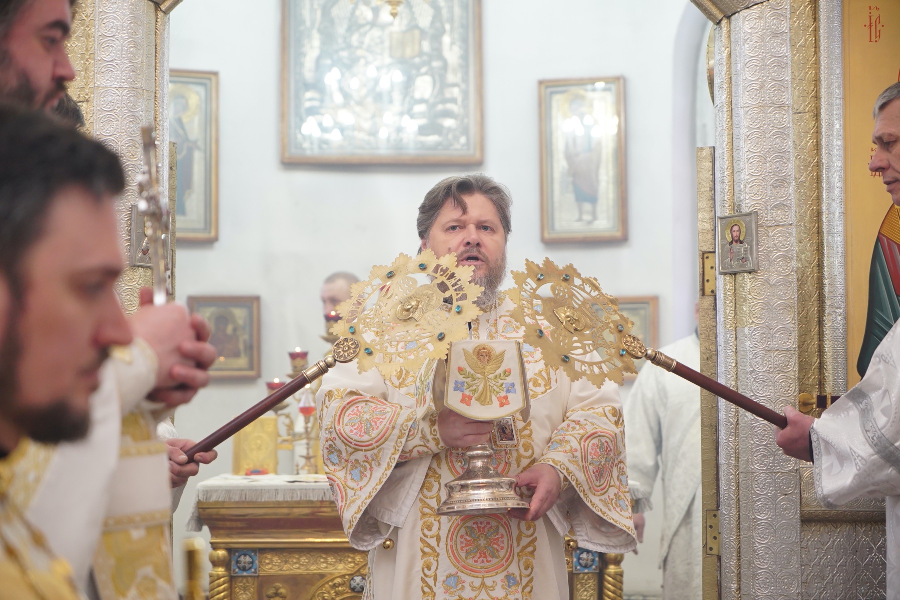 Преосвященному владыке сослужили: ключарь Успенского кафедрального собора протоиерей Александр Петров, ключарь Пантелеимоновского собора иерей Роман Третьяков, иерей Виктор Пушкарев, иерей Андрей Новиков, иерей Герман Ходаковский, диакон Вадим Шпак, диакон Андрей Поповичев.