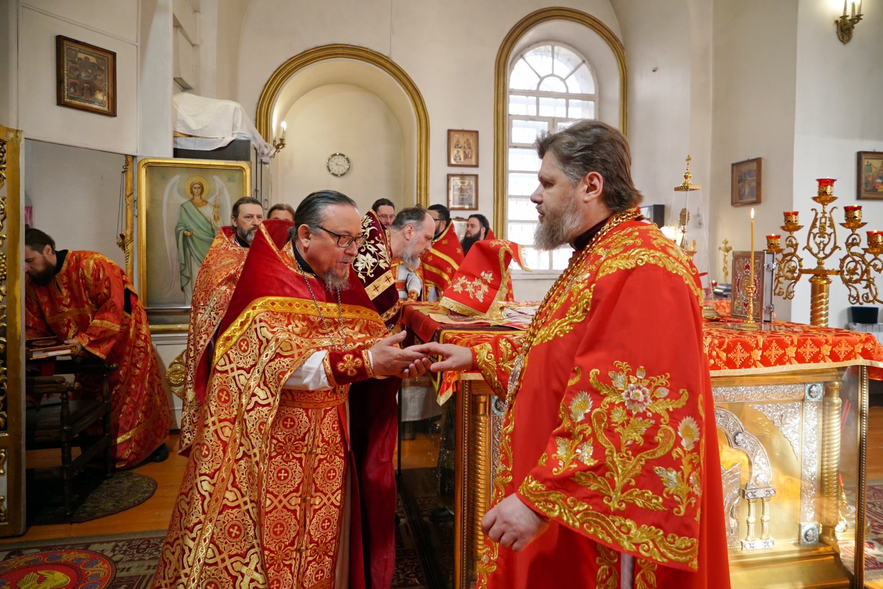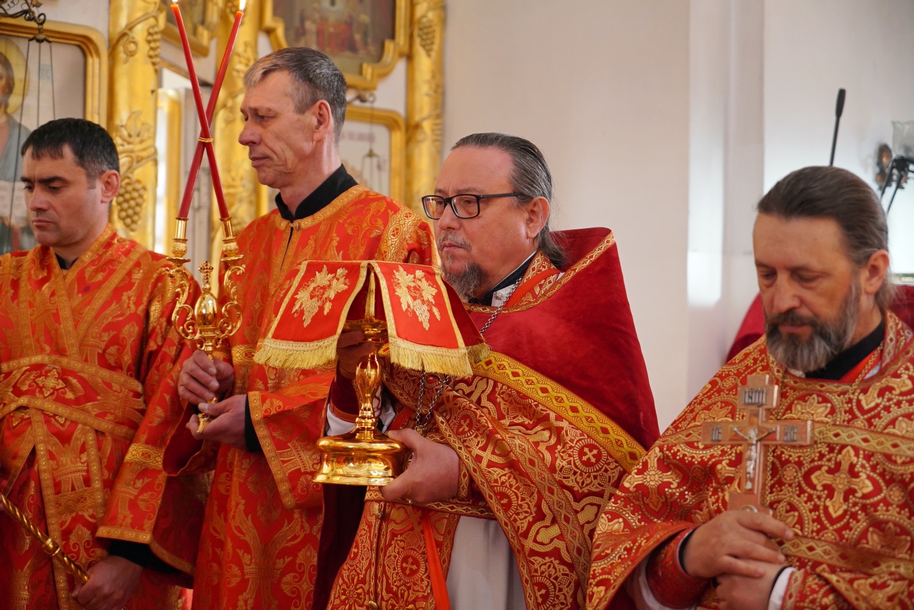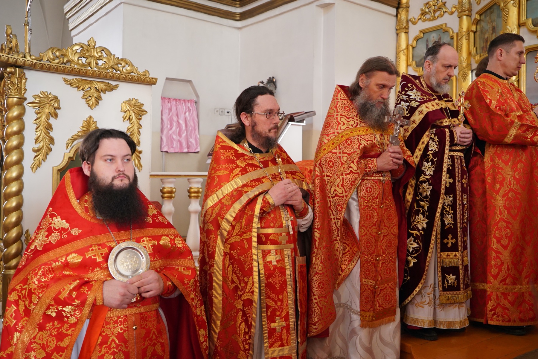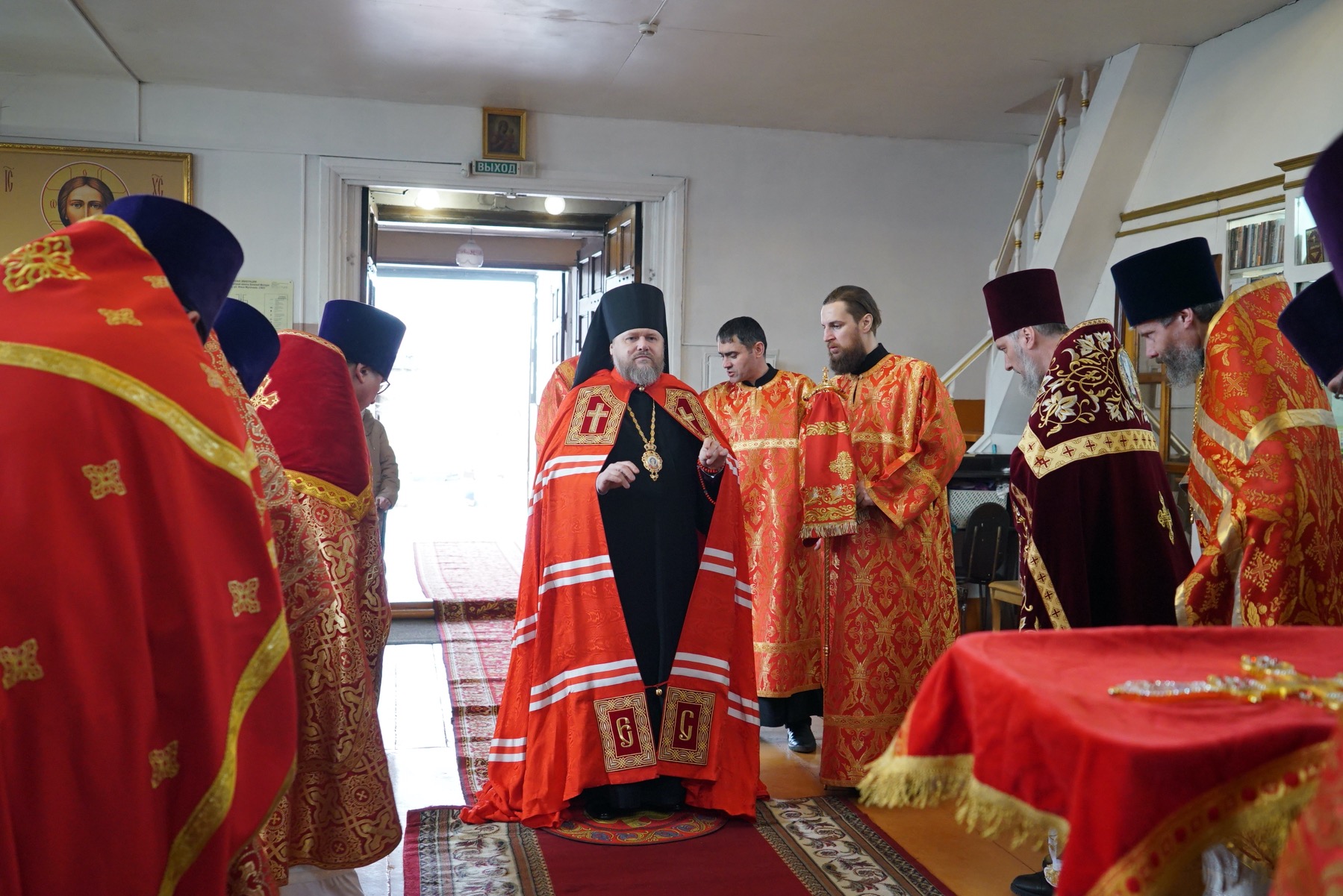 Его Преосвященству сослужили: настоятель храма протоиерей Валерий Замятин, протоиерей Александр Петров, иерей Евгений Щигрев, иерей Димитрий Харин, иерей Димитрий Камбалин, иерей Вадим Четвергов, иерей Василий Давыдкин, иерей Александр Лобанов, протодиакон Вадим Шпак, диакон Николай Геришенко.
