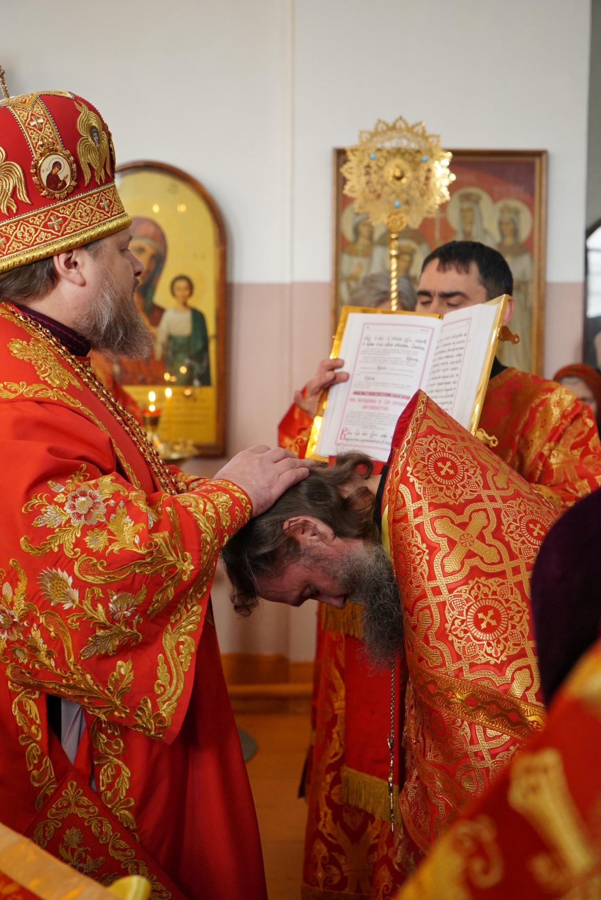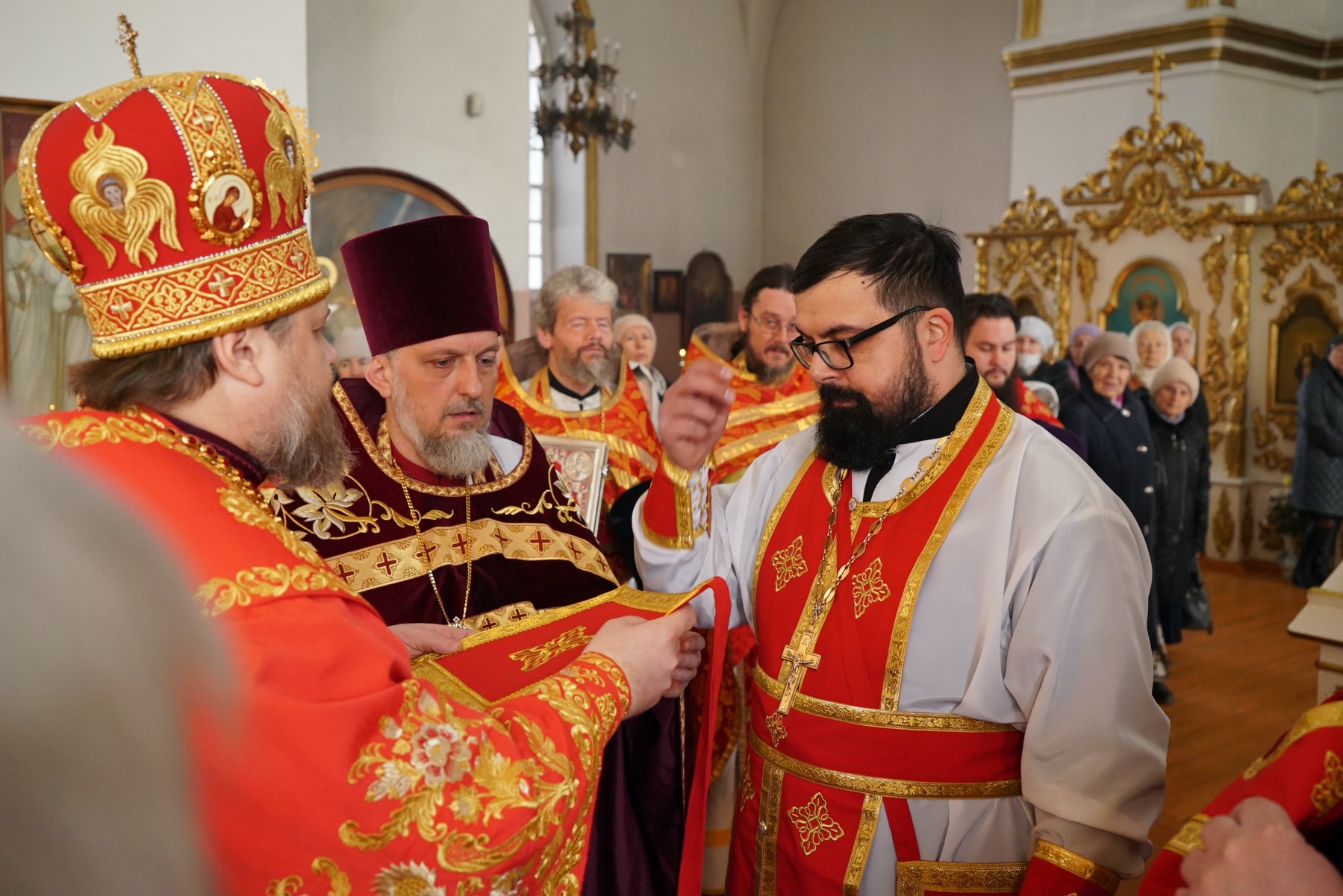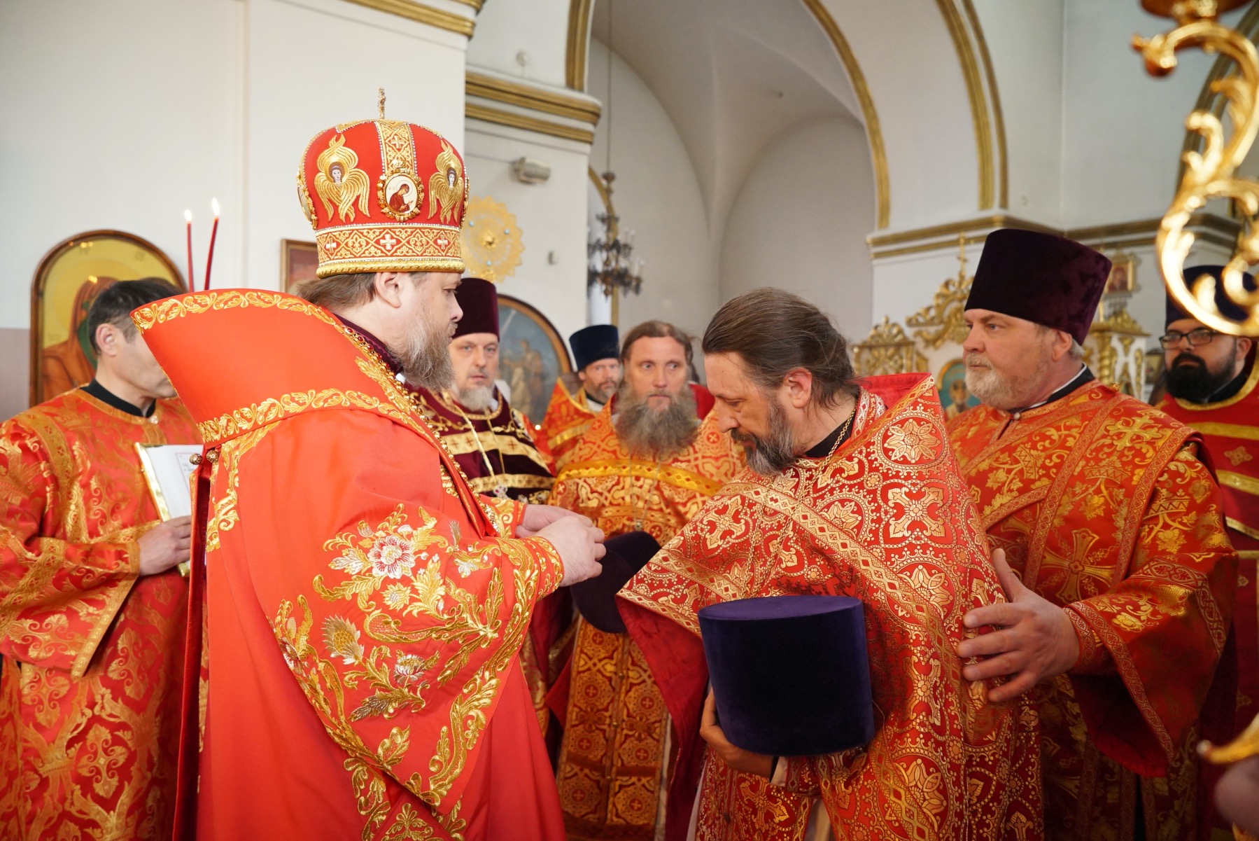 За богослужением Преосвященный Серафим возвел иерея Димитрия Харина и иерея Димитрия Камбалина в сан протоиерея, а также наградил правом ношения палицы иерея Вадима Четвергова и иерея Василия Давыдкина.