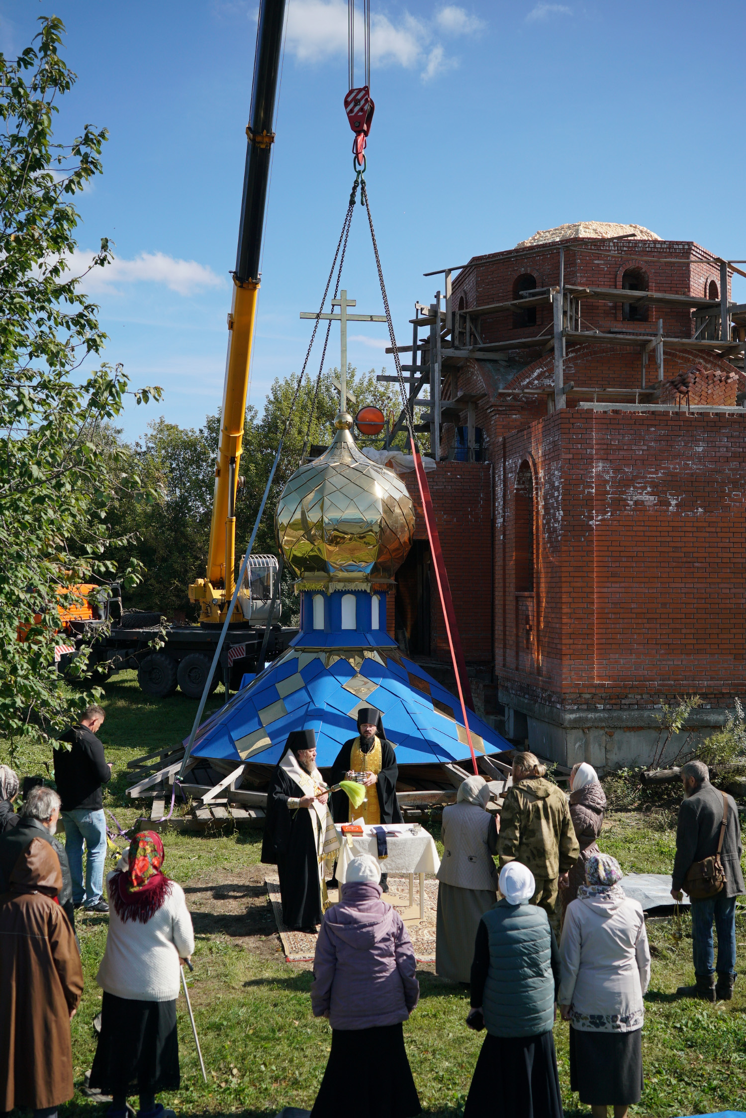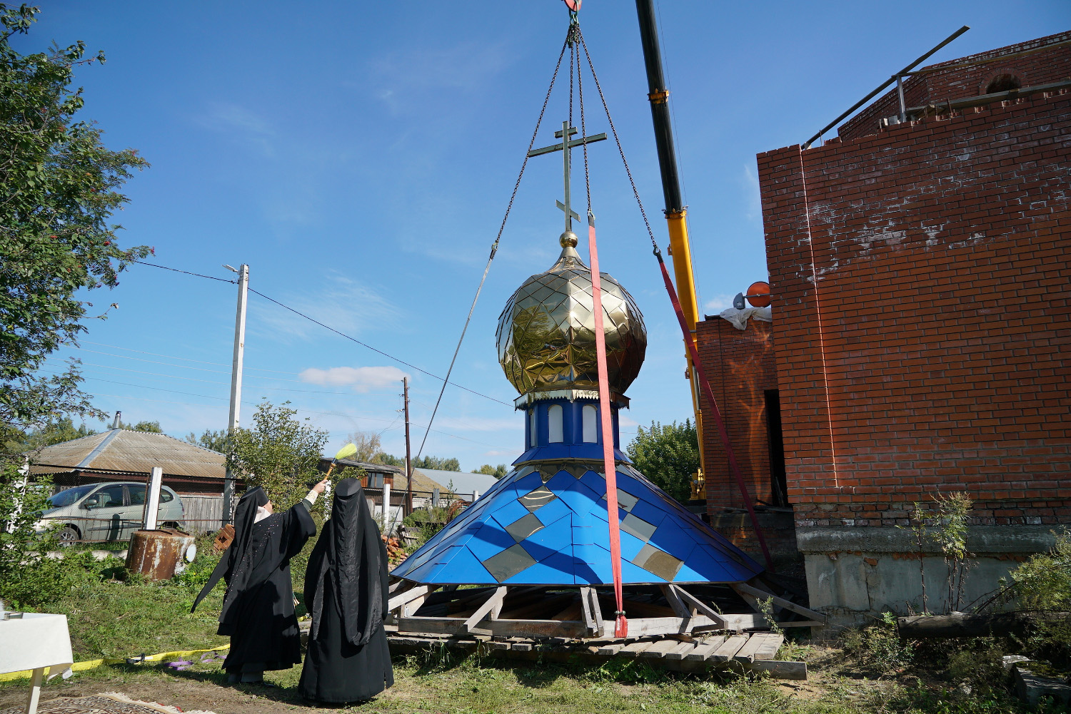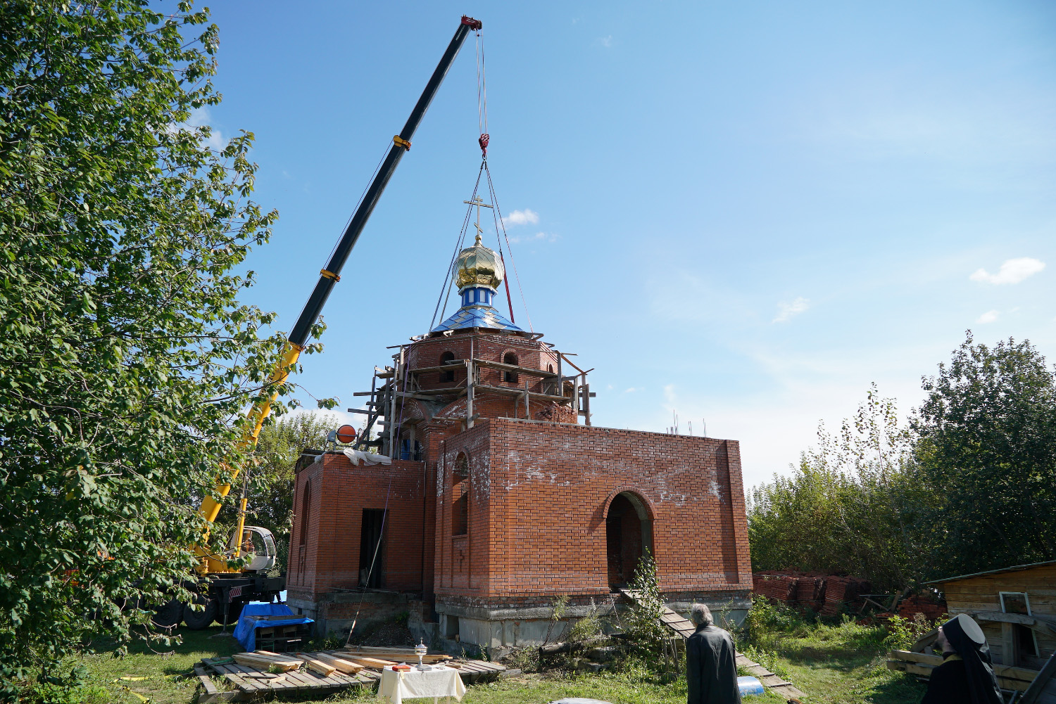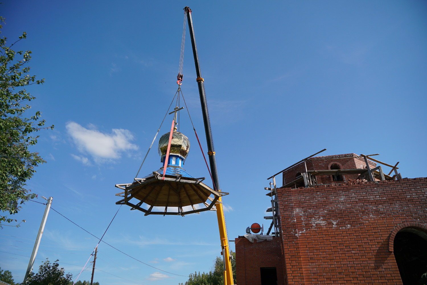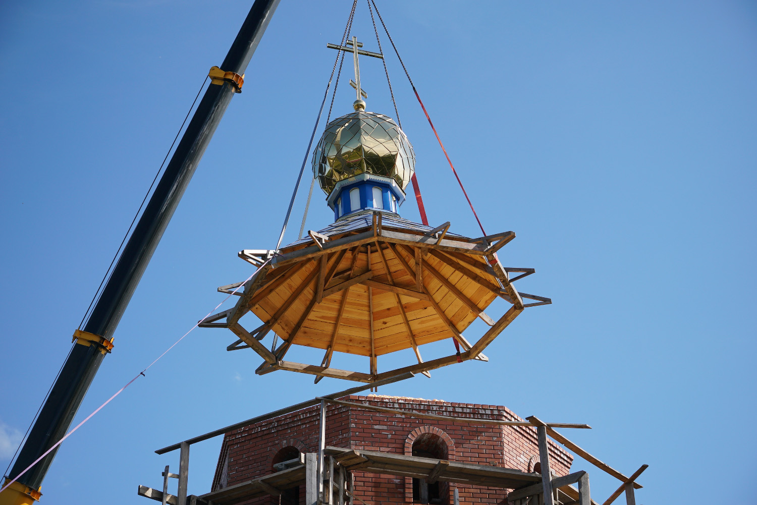 Затем конструкция, состоящая из купола с крестом и подкупольной части, была водружена с помощью подъемного крана на строящийся храм.