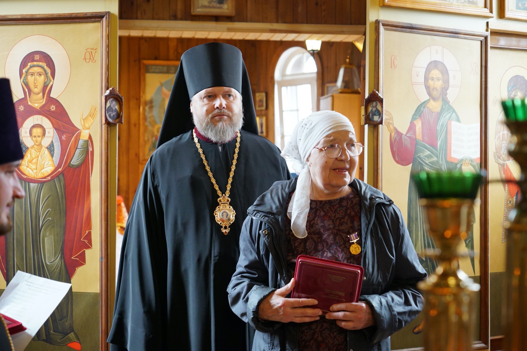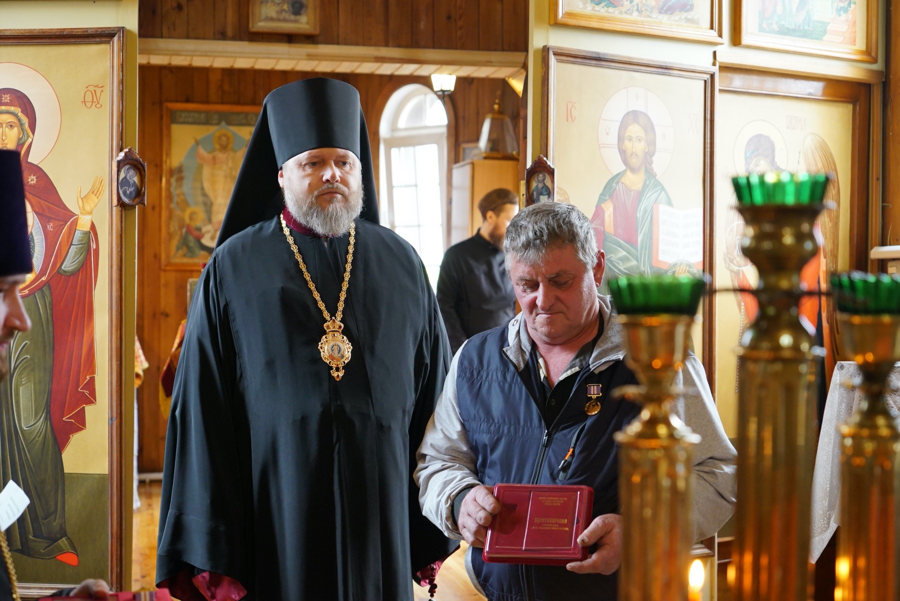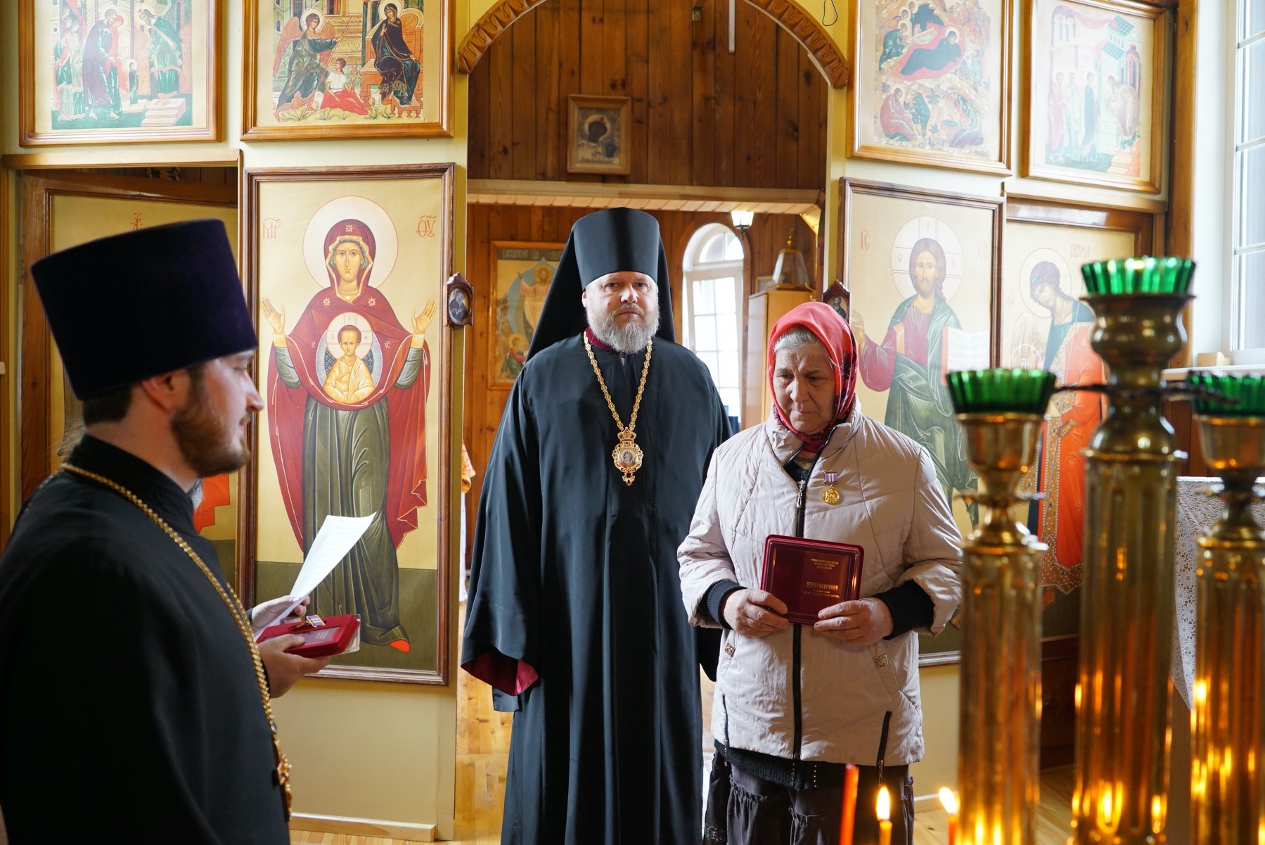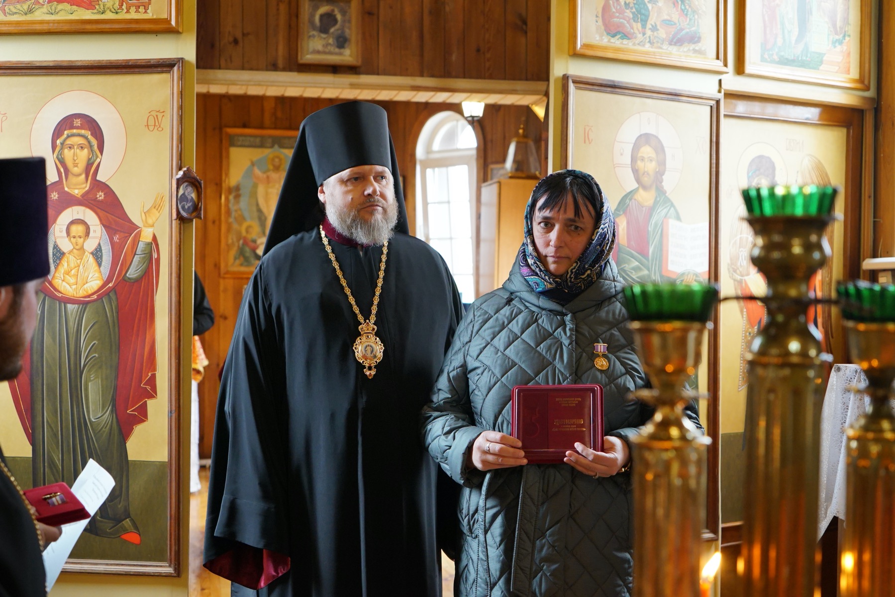 По окончании богослужения правящий архиерей наградил активных прихожан и работников храма юбилейными медалями к 10-летию образования Бийской епархии в составе Алтайской митрополии.