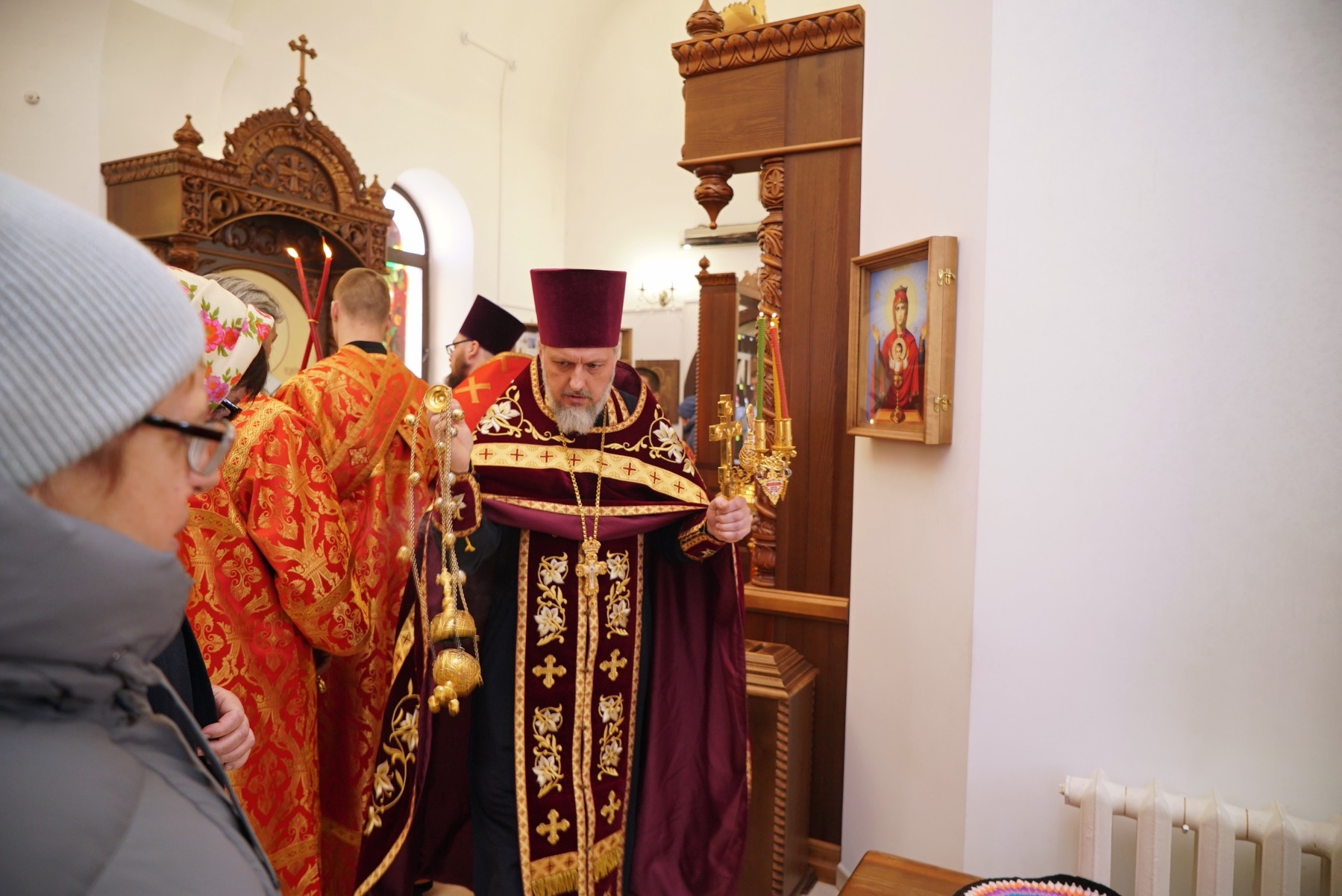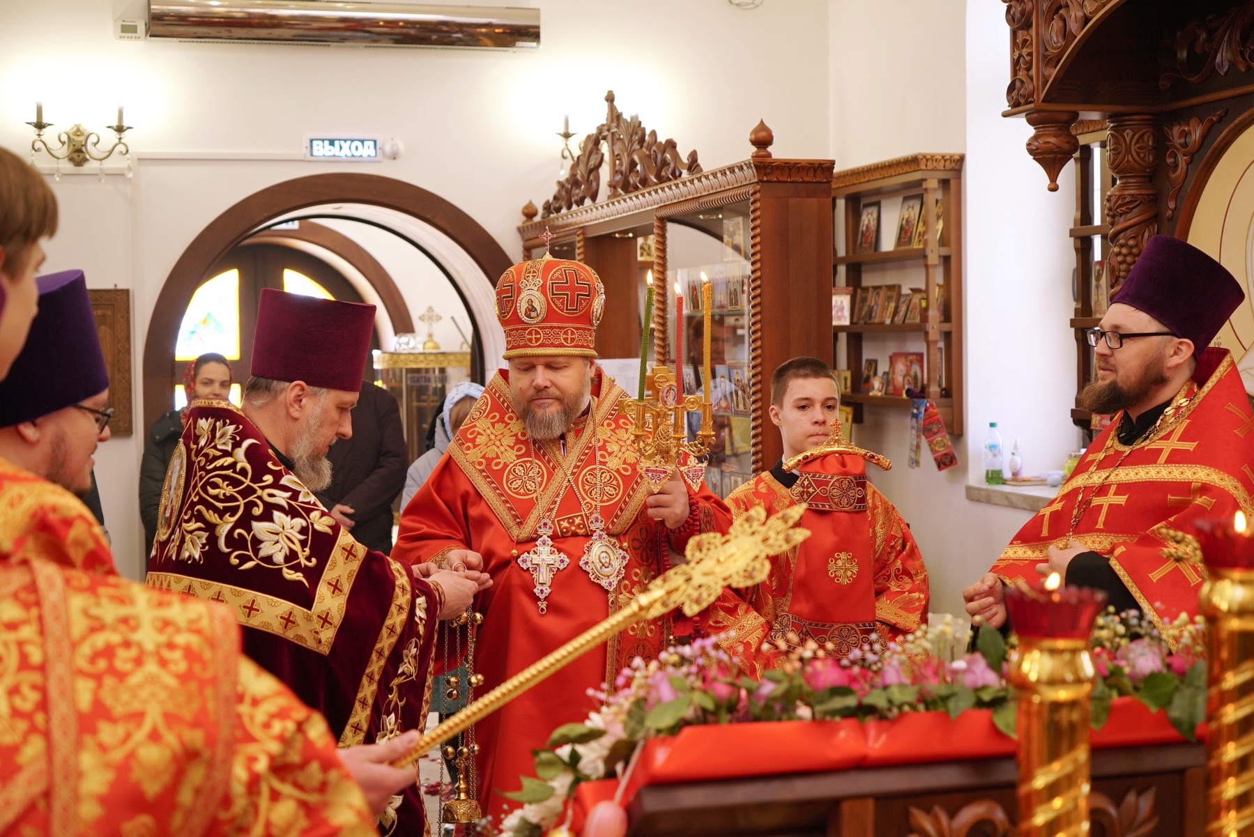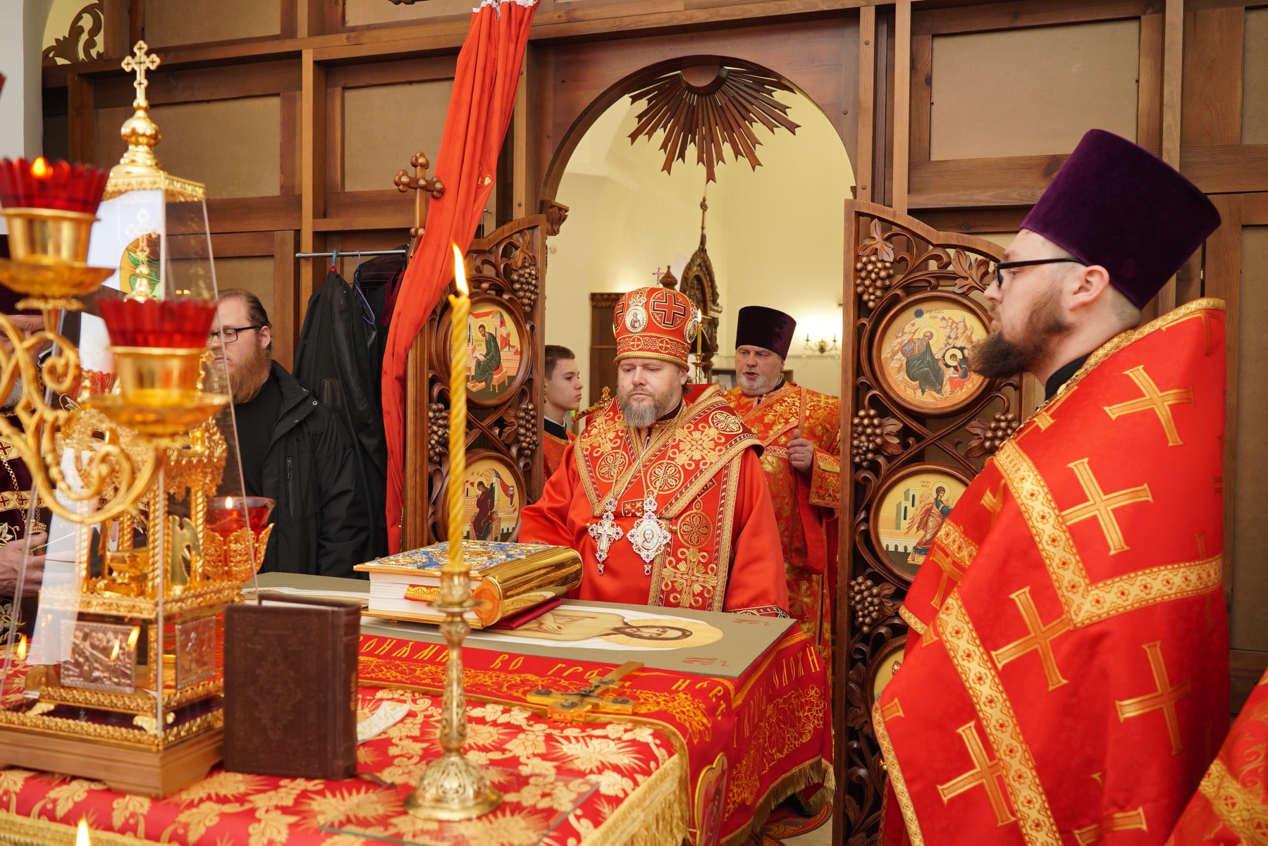 Преосвященному владыке сослужили: ключарь Успенского кафедрального собора протоиерей Александр Петров, настоятель храма иерей Даниил Тишков, иерей Иоанн Макаров, протодиакон Вадим Шпак.