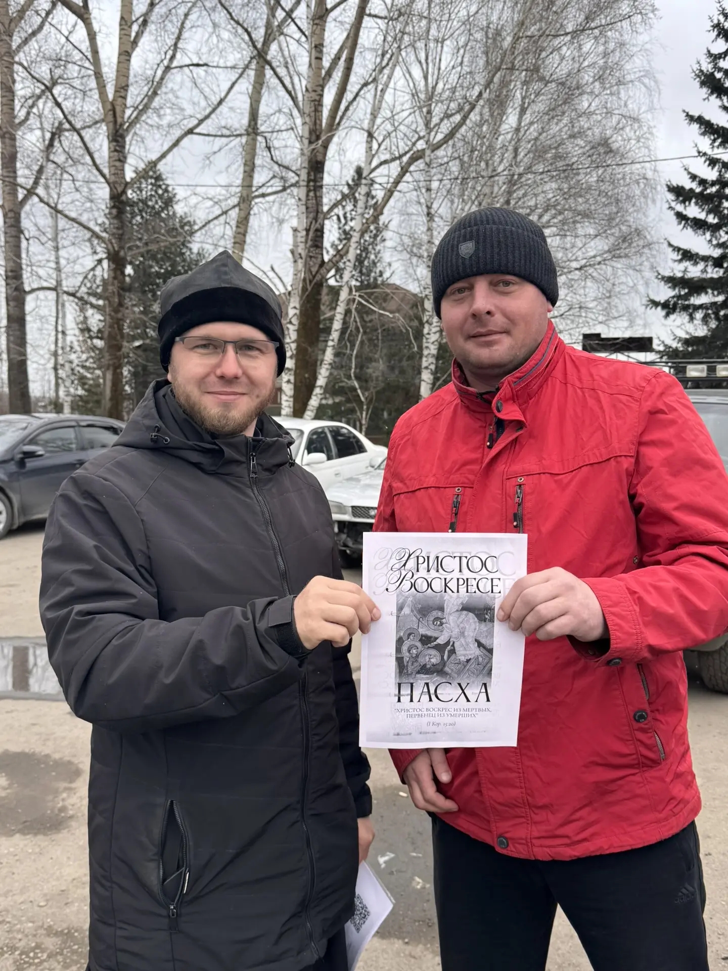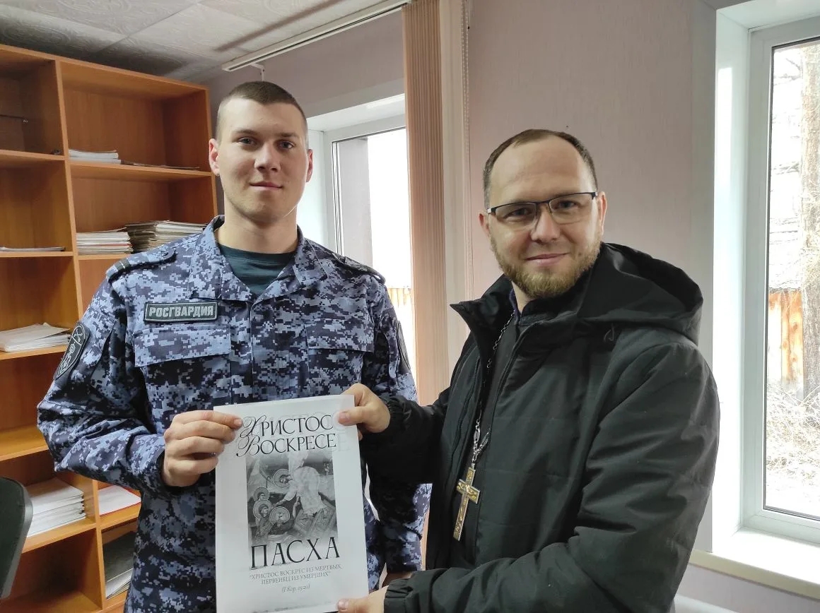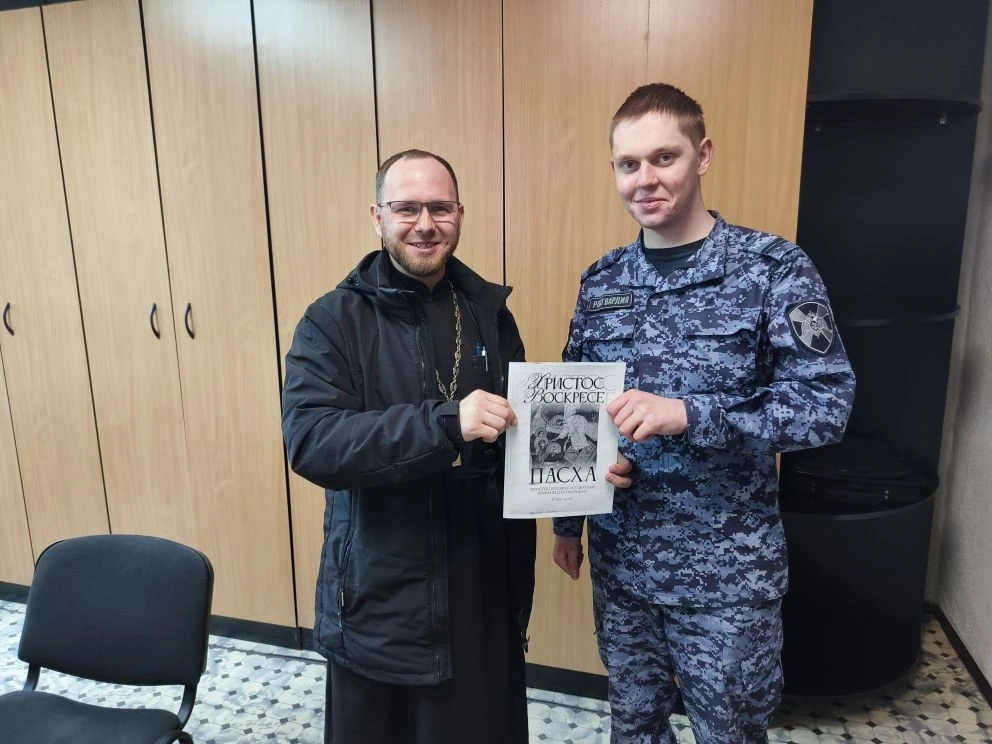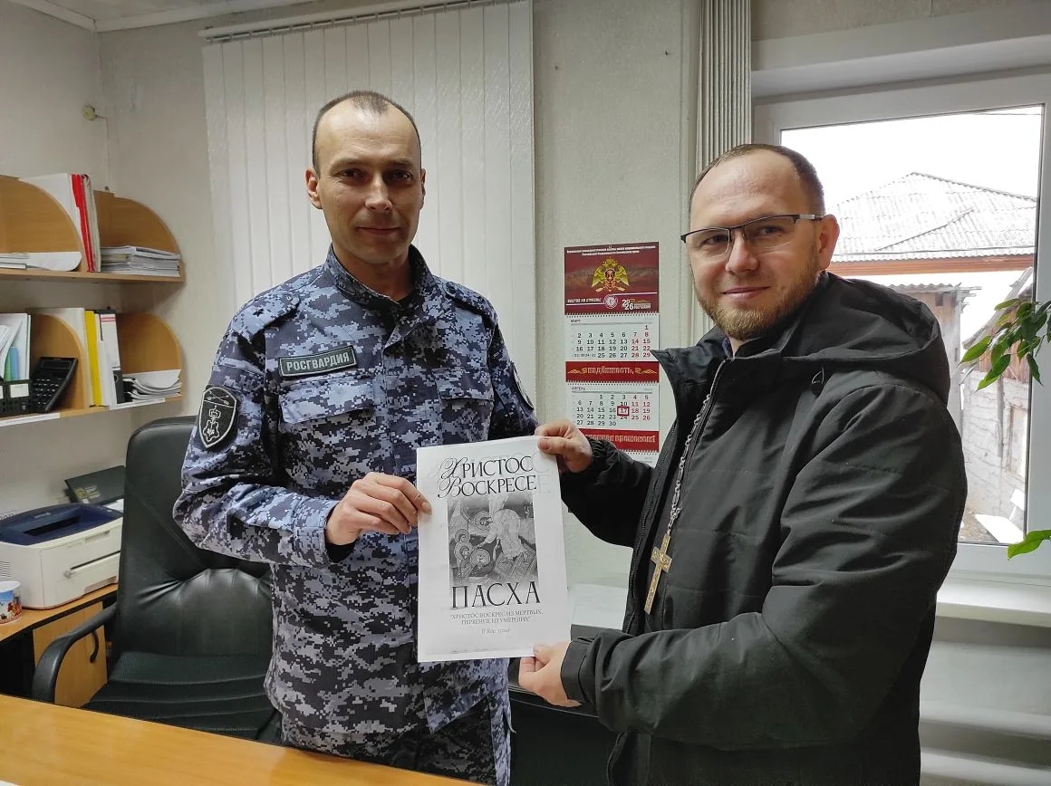 Батюшка раздал буклеты о Пасхе прохожим на улице и сотрудникам отдела Росгвардии по Красногорскому району.