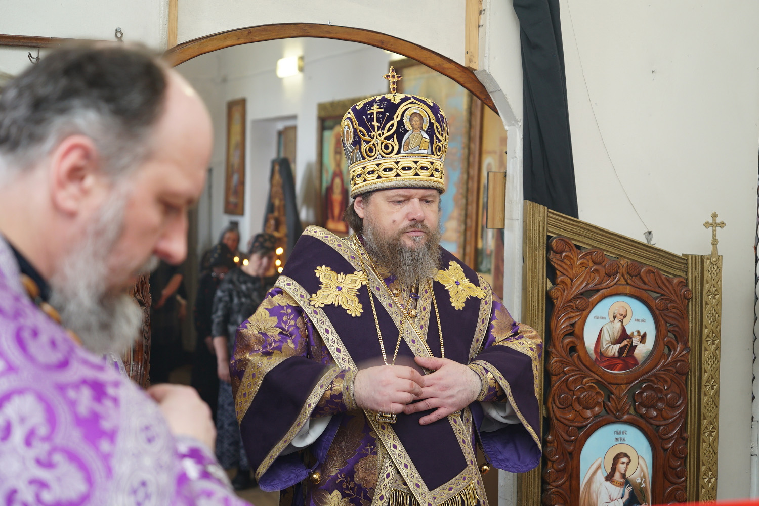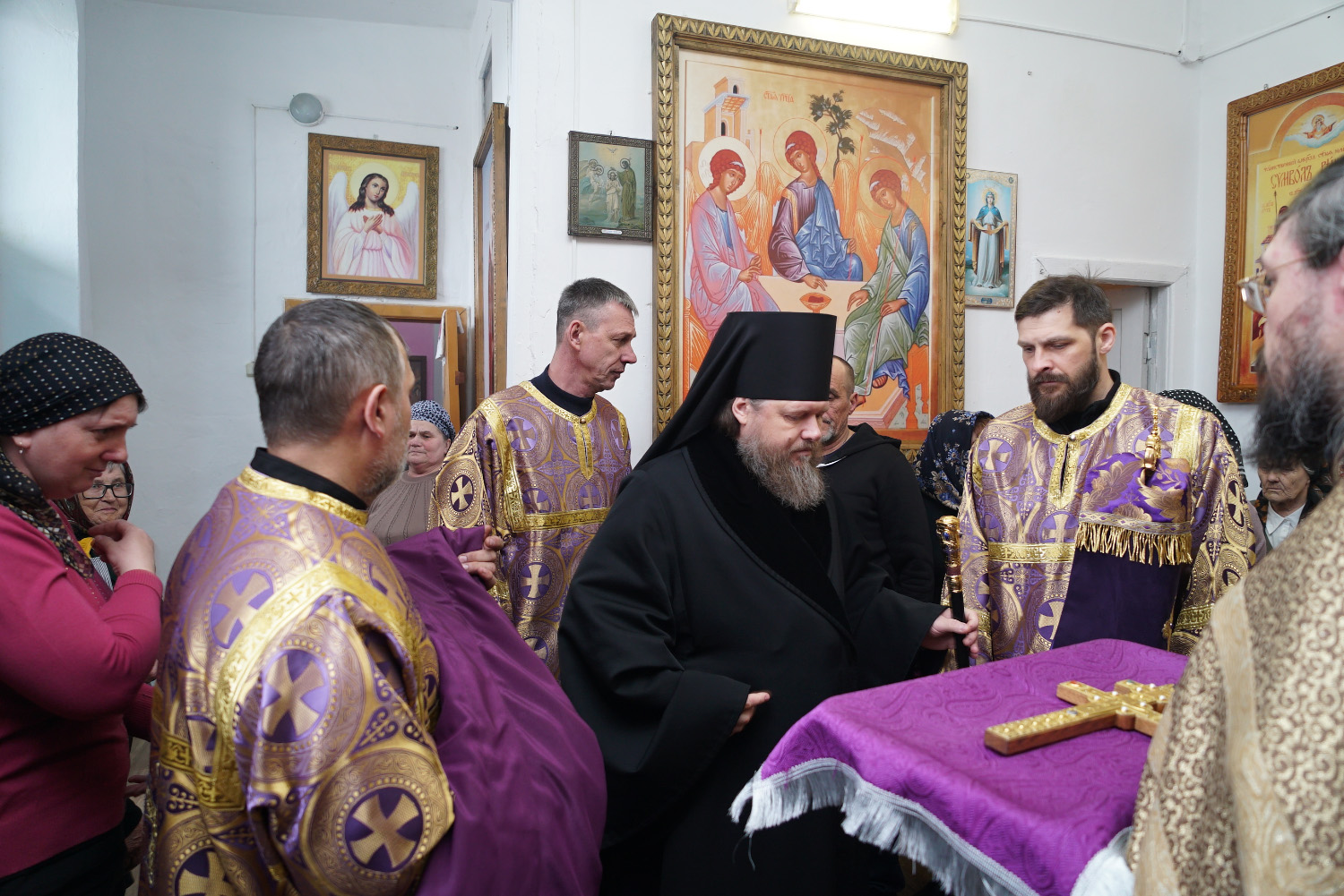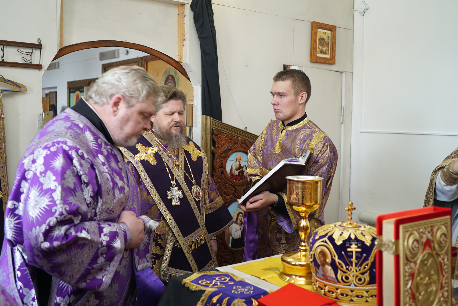 Его Преосвященству сослужили: ключарь Успенского кафедрального собора протоиерей Александр Петров, настоятель храма иеромонах Никита (Москаленко), диакон Вадим Шпак.