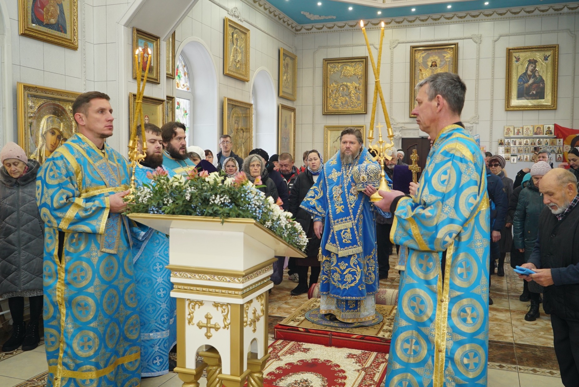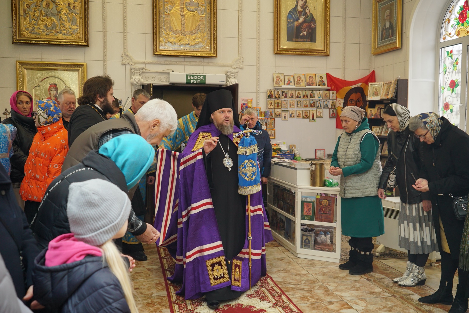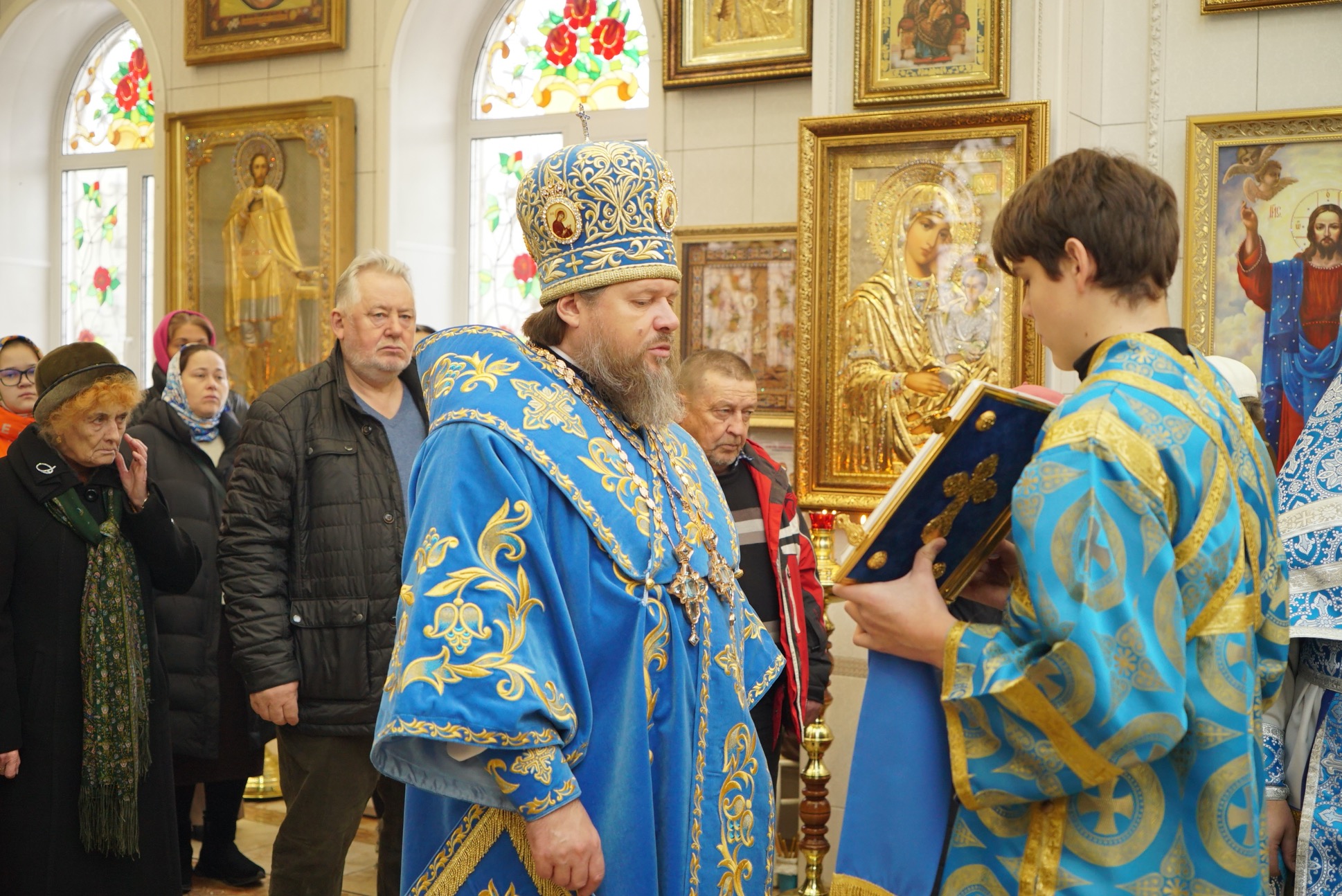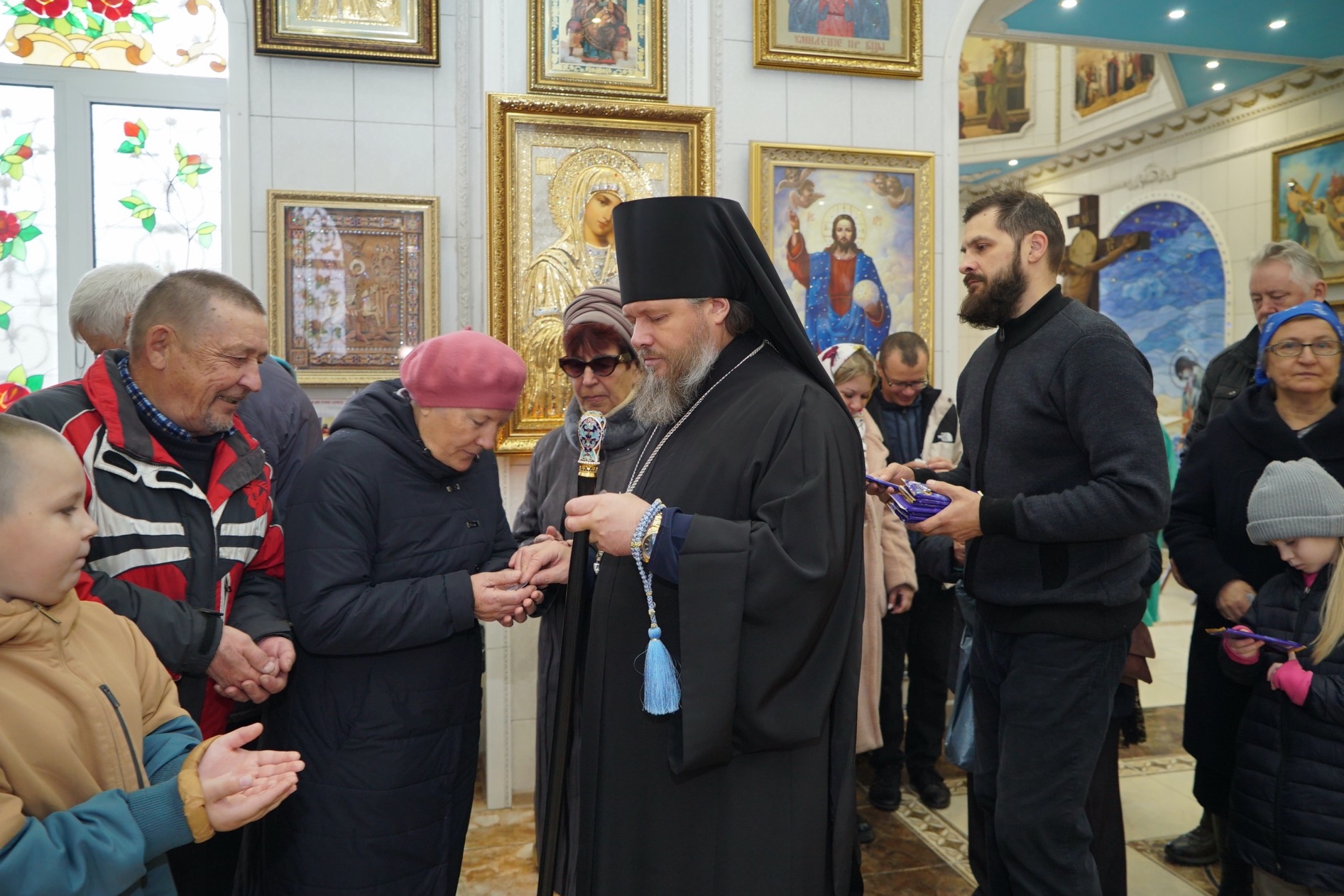 Преосвященному владыке сослужили: настоятель храма иерей Евгений Капп, иерей Димитрий Щербаков, диакон Никита Гологузов.