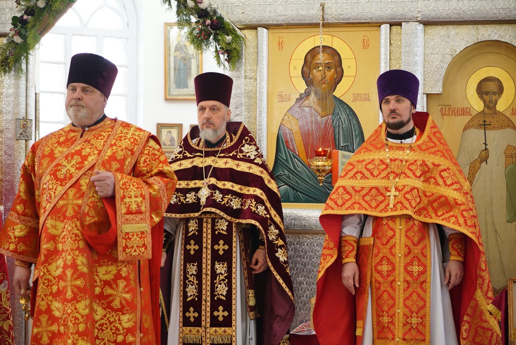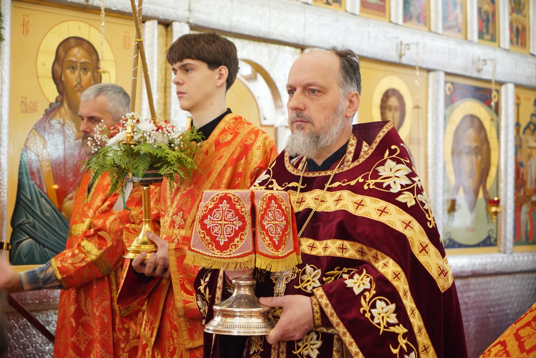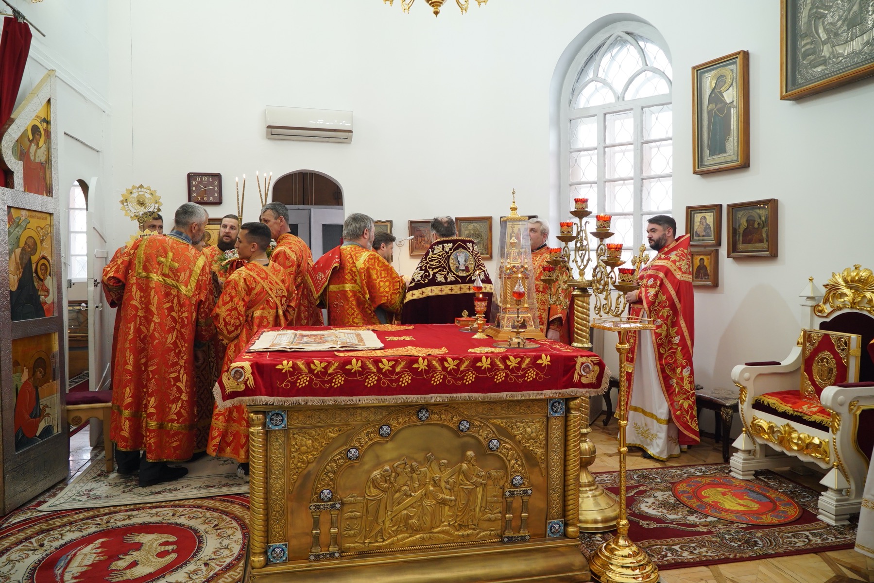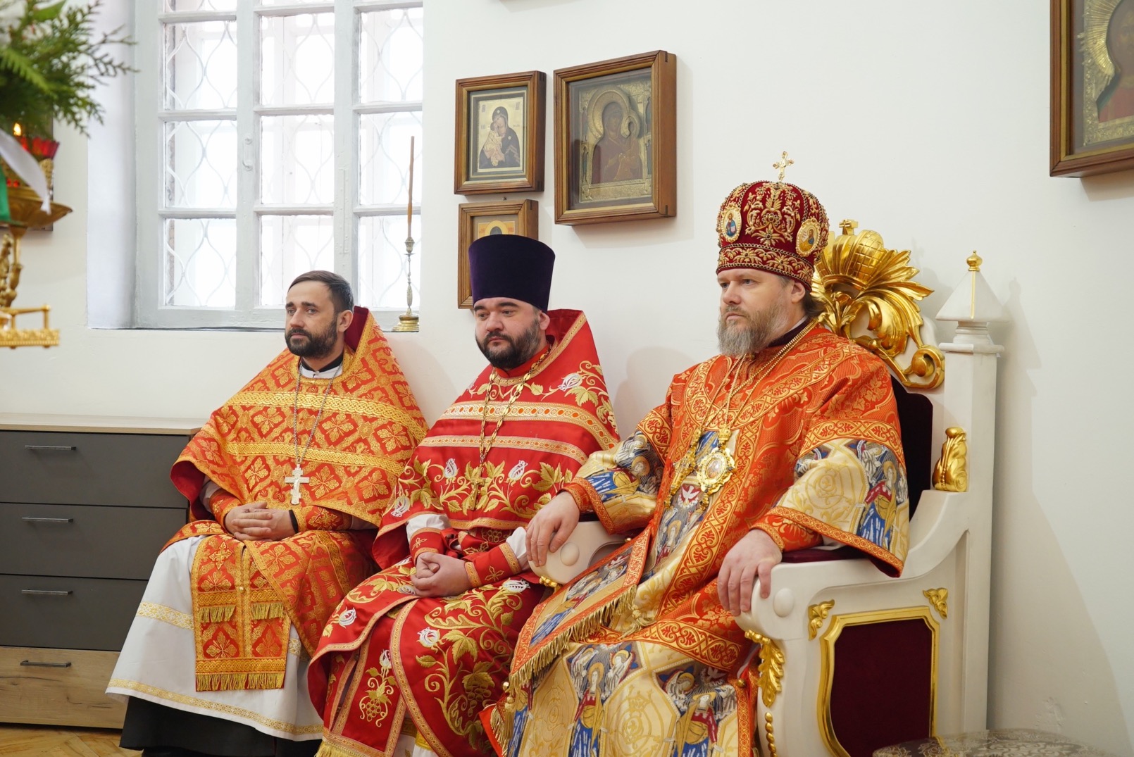 Его Преосвященству сослужили: ключарь Успенского кафедрального собора протоиерей Александр Петров, ключарь Пантелеимоновского собора иерей Роман Третьяков, иерей Андрей Новиков, иерей Герман Ходаковский, протодиакон Вадим Шпак, диакон Андрей Поповичев.