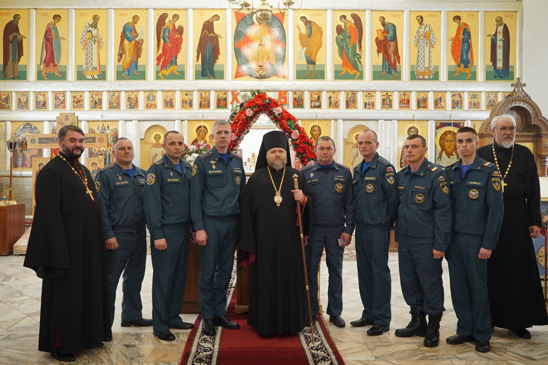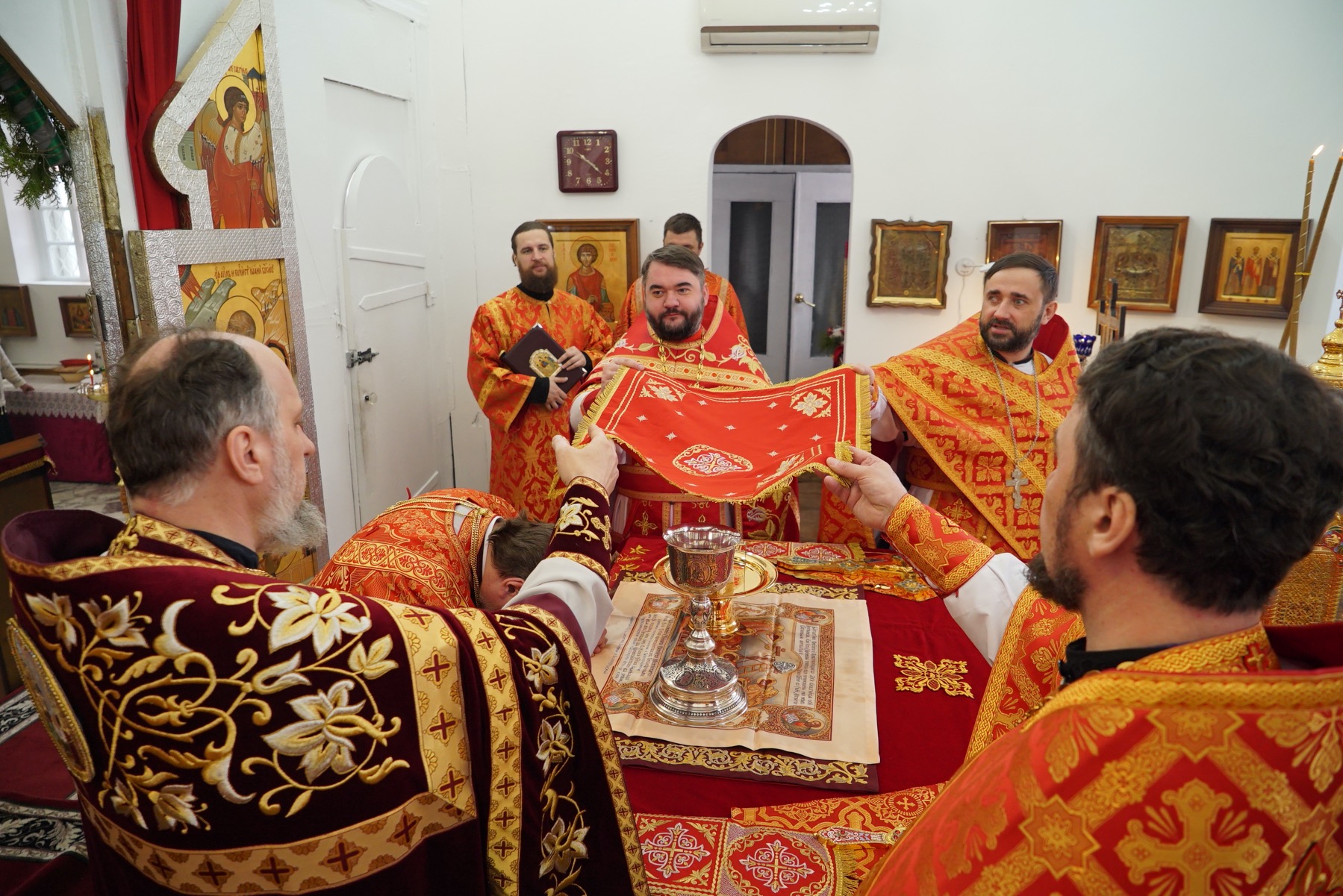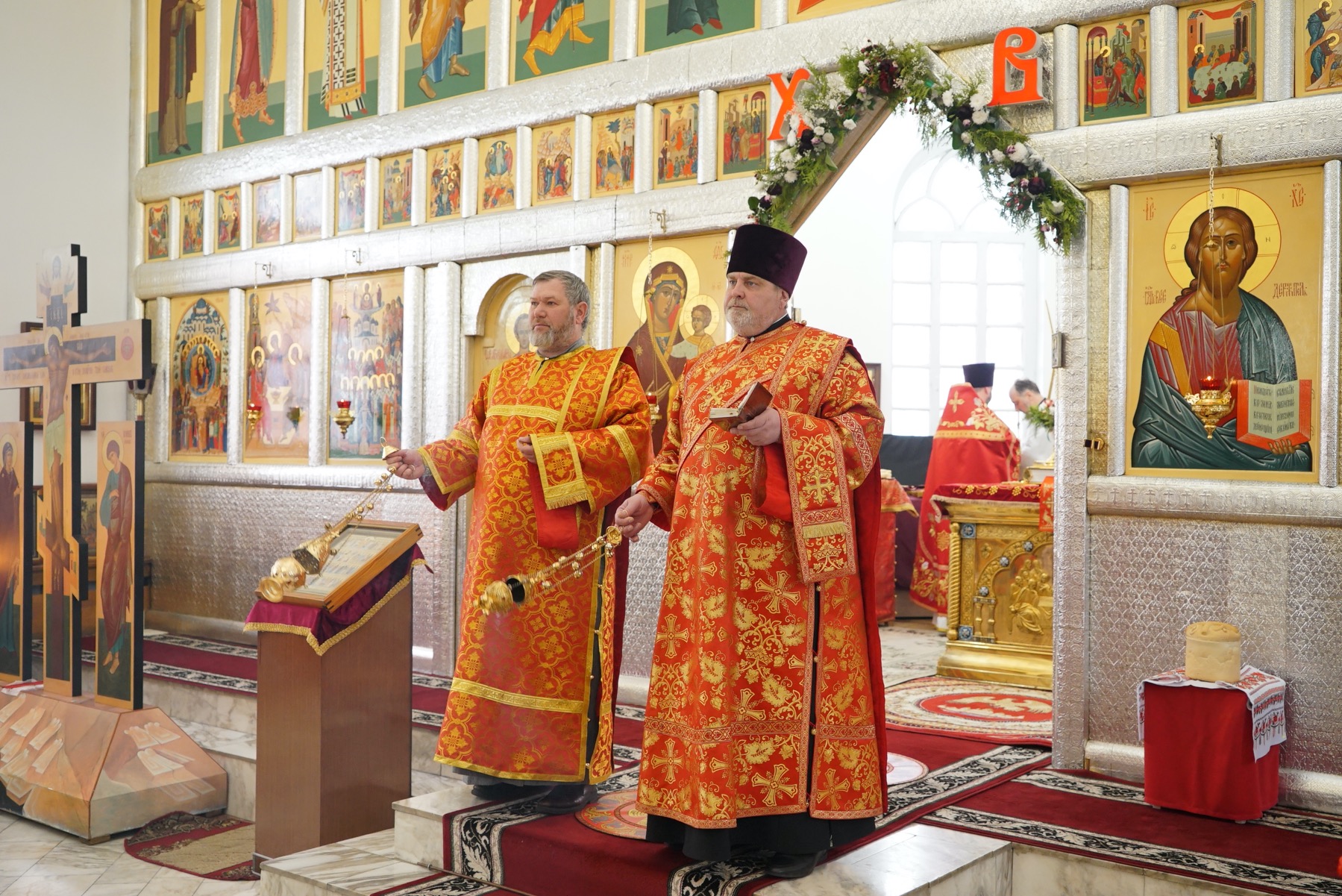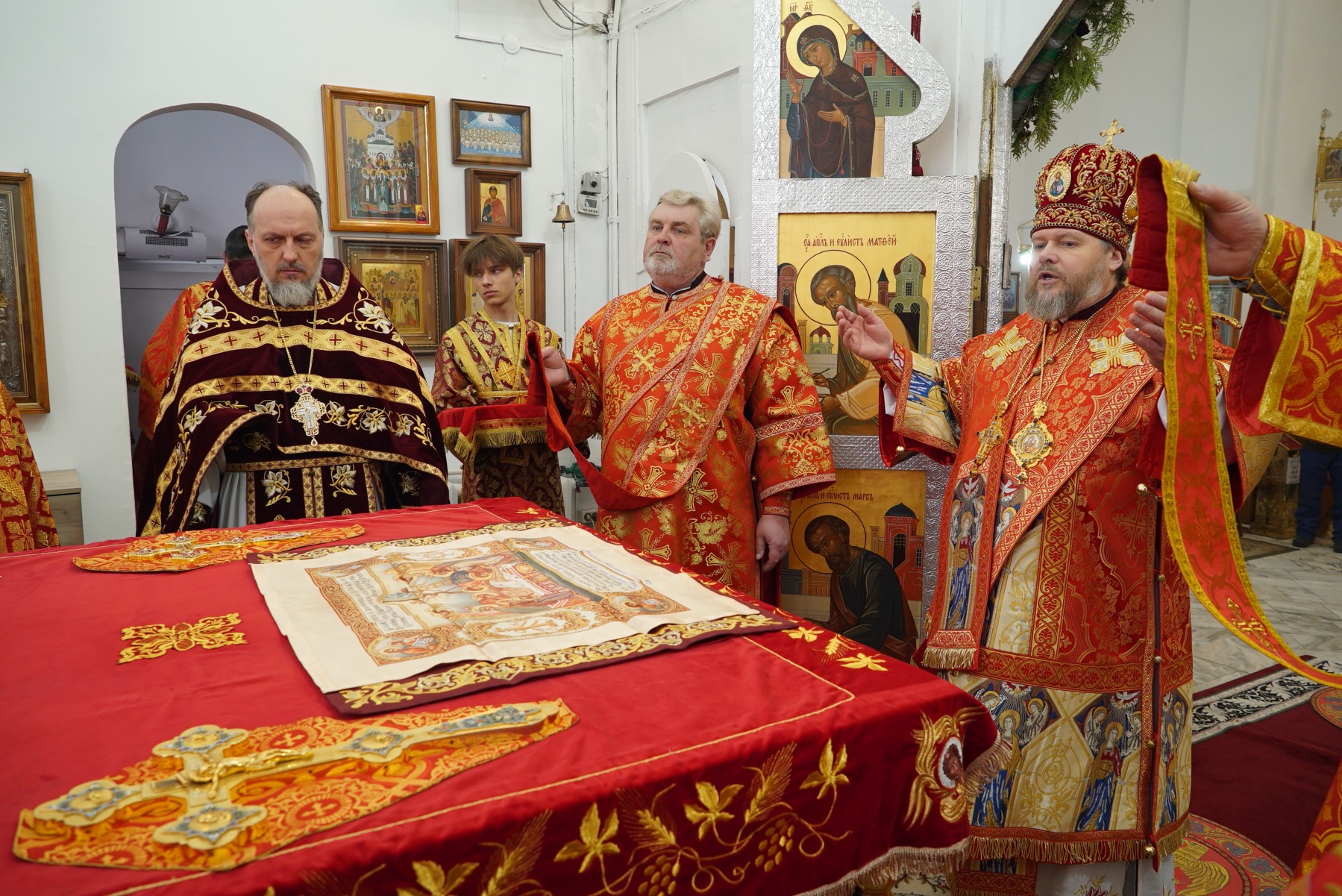 Его Преосвященству сослужили: ключарь Успенского кафедрального собора протоиерей Александр Петров, ключарь Пантелеимоновского собора иерей Роман Третьяков, иерей Андрей Новиков, иерей Герман Ходаковский, протодиакон Вадим Шпак, диакон Андрей Поповичев.
