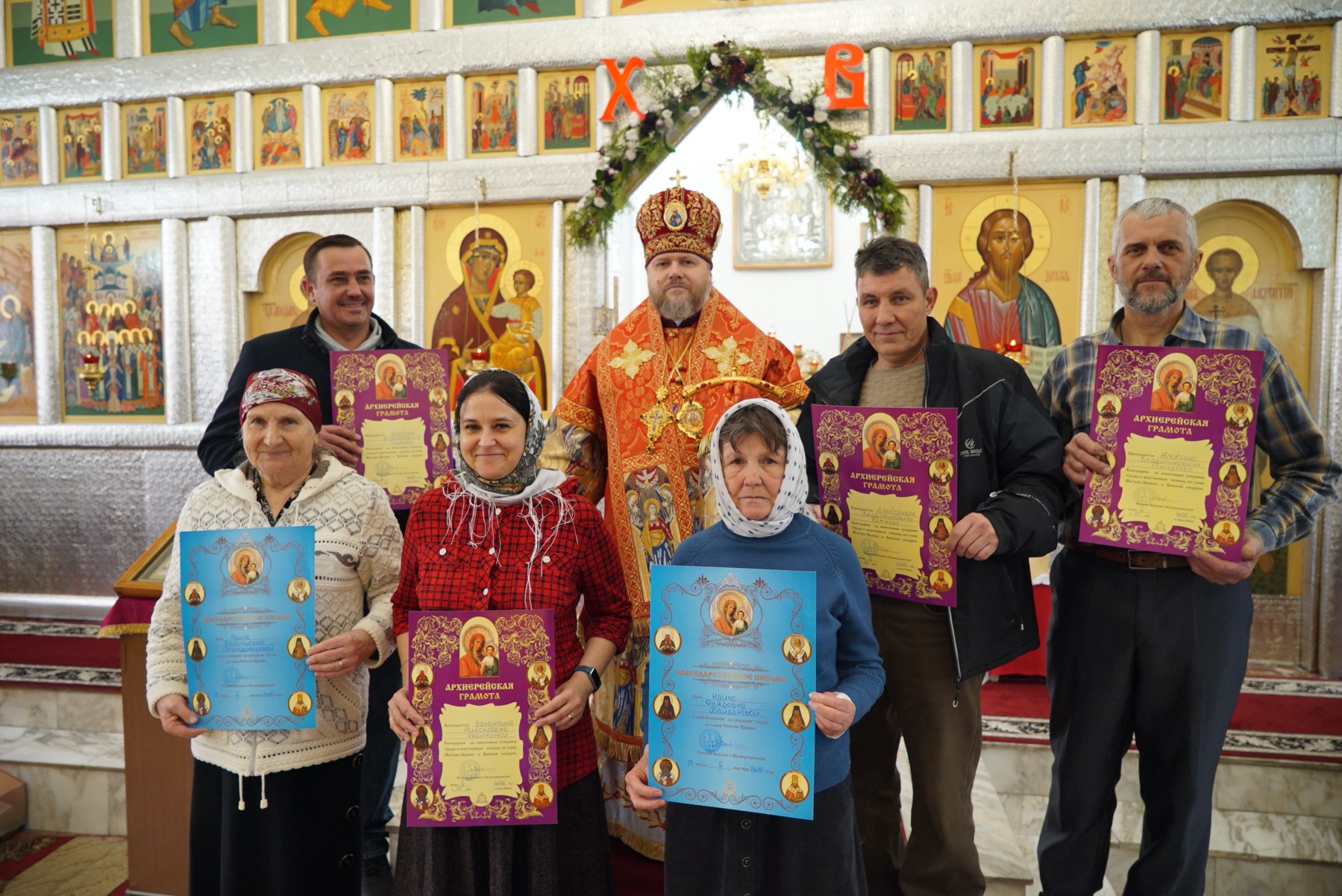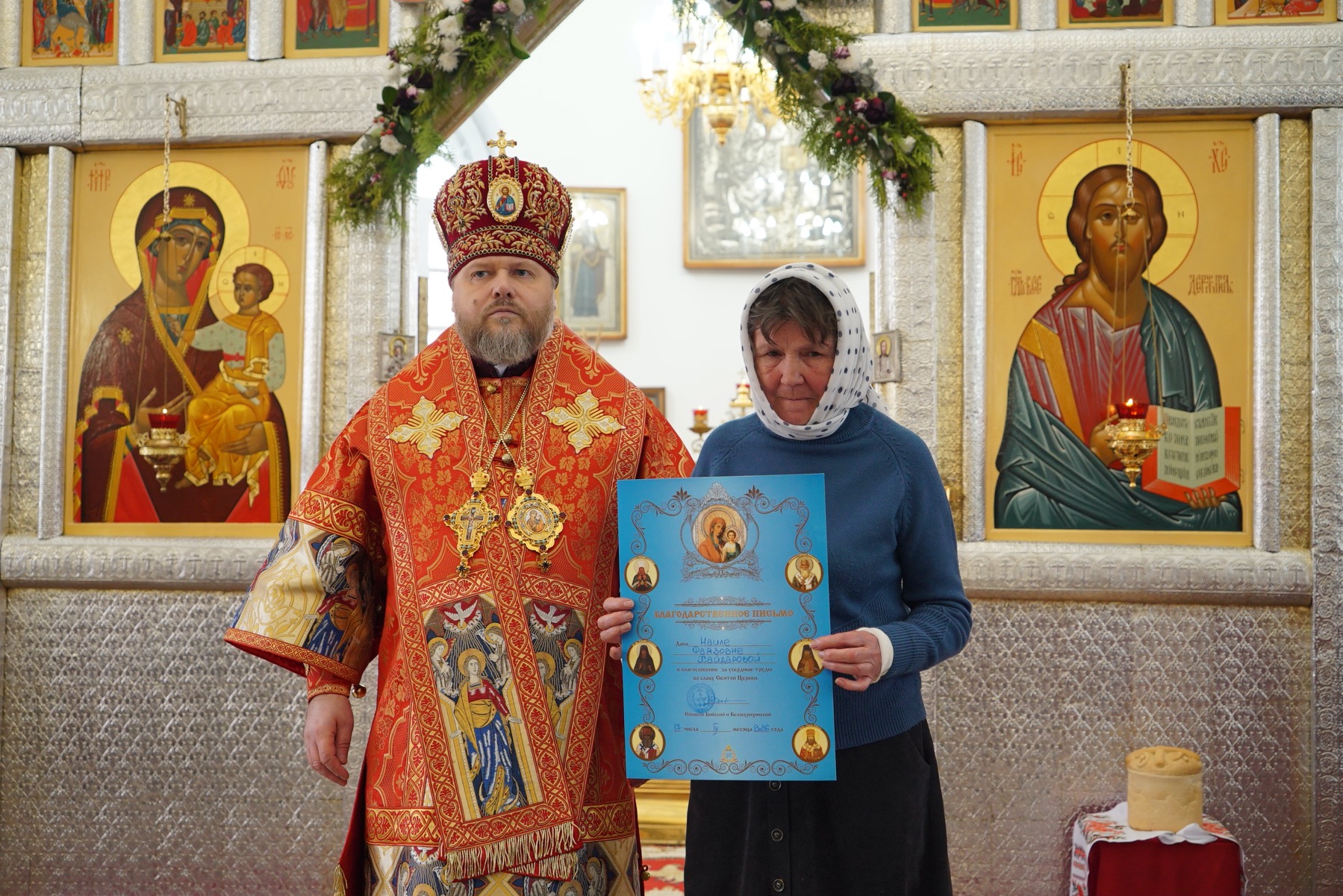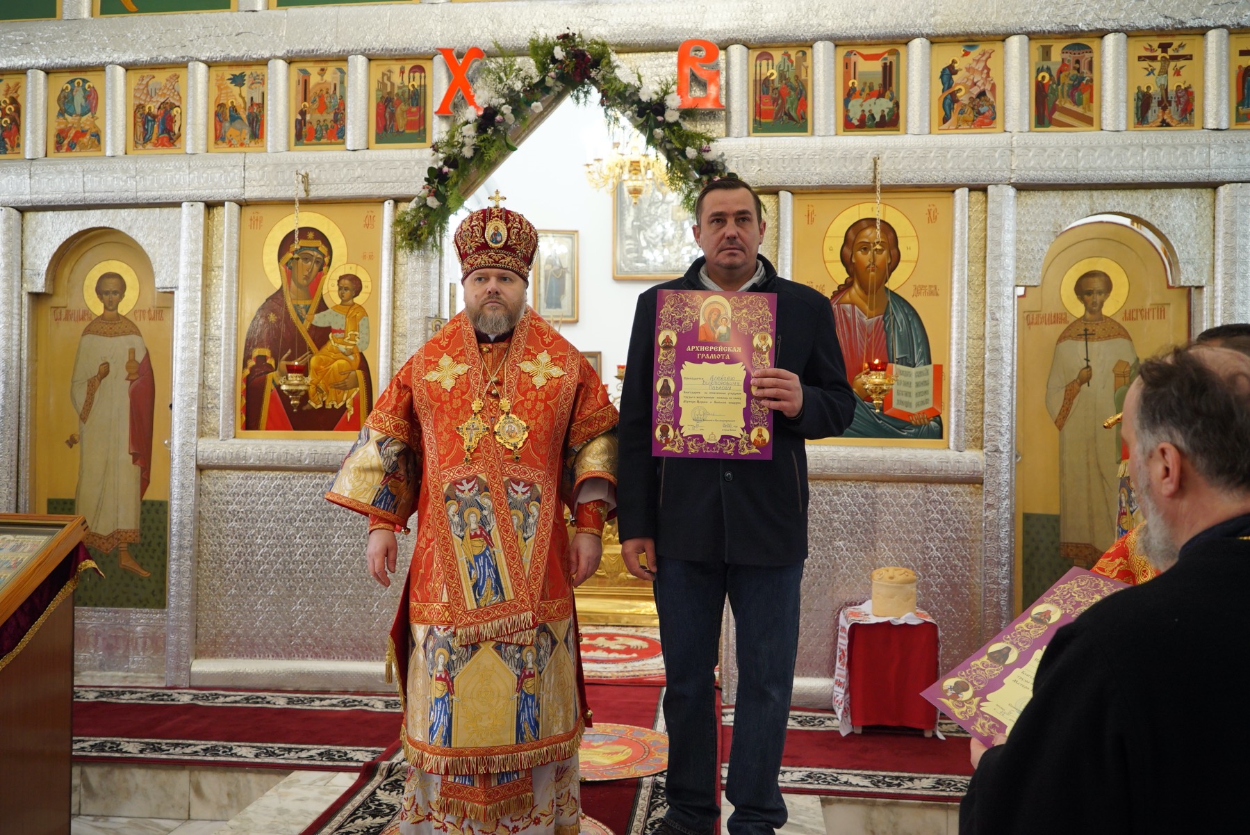 В завершение праздничного богослужения архипастырь обратился к сослужащему духовенству и всем молящимся со святительским словом, посвященным празднику Светлого Христова Воскресения, а затем наградил активных прихожан собора Архиерейскими грамотами и Благодарственными письмами.