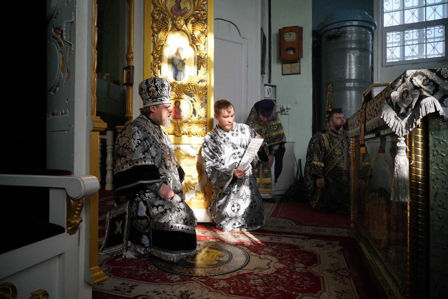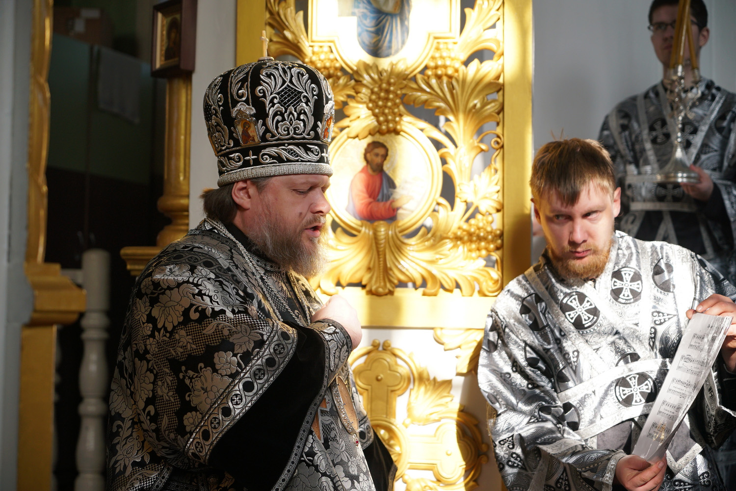 Преосвященному владыке сослужили: ключарь собора протоиерей Александр Петров, иерей Владимир Ащеулов, иерей Иоанн Шкуропацкий, иерей Артемий Золотых, диакон Вадим Шпак, диакон Никита Гологузов, диакон Артемий Волков.