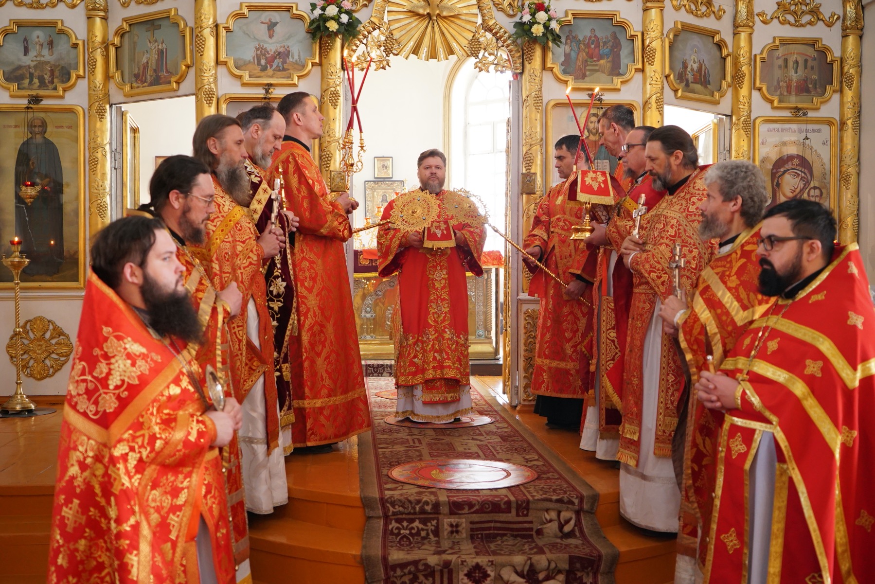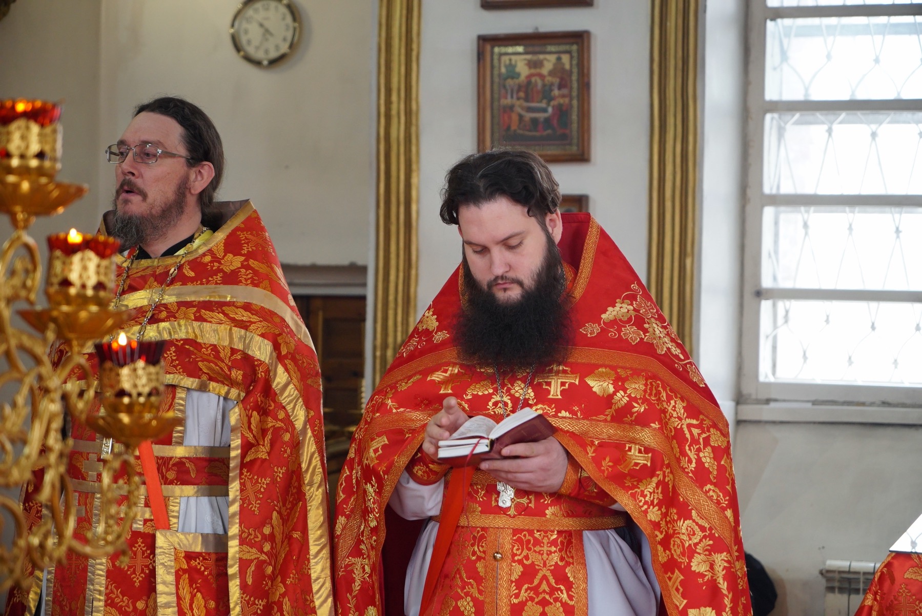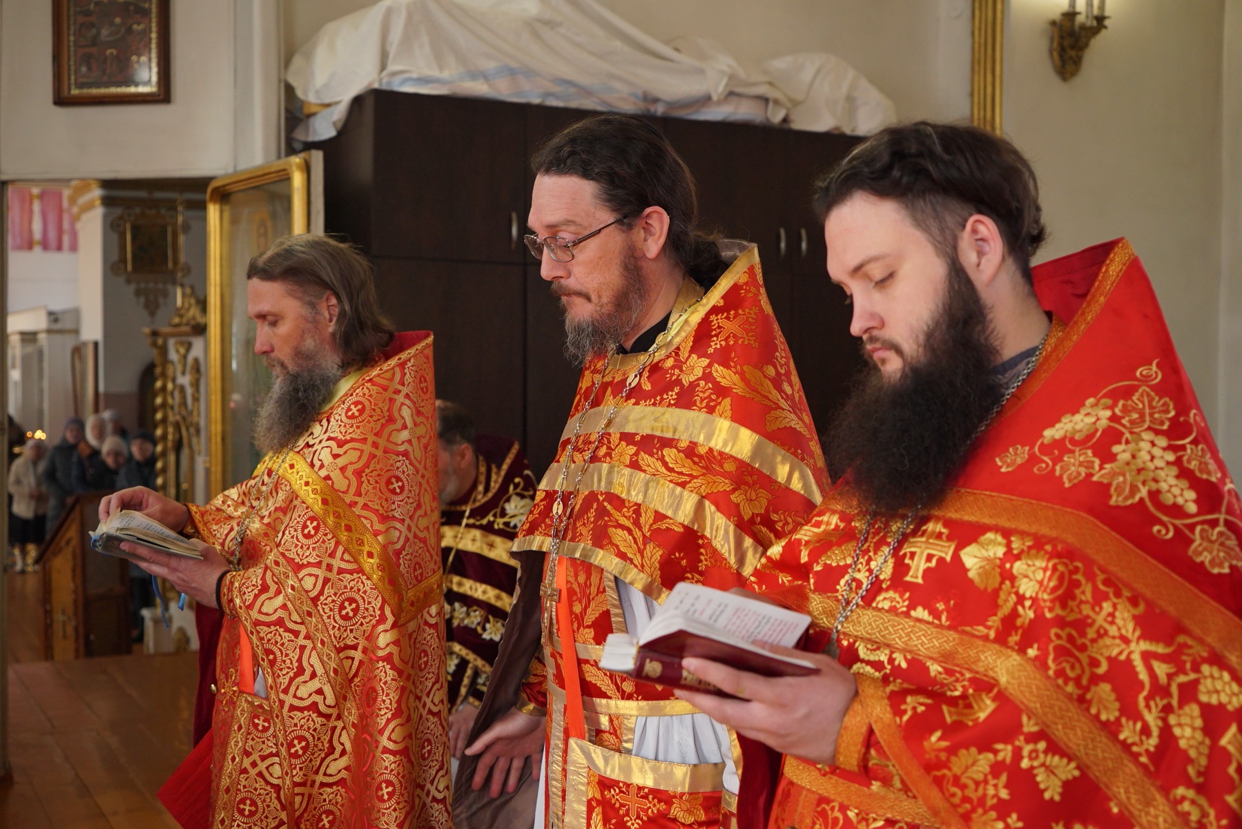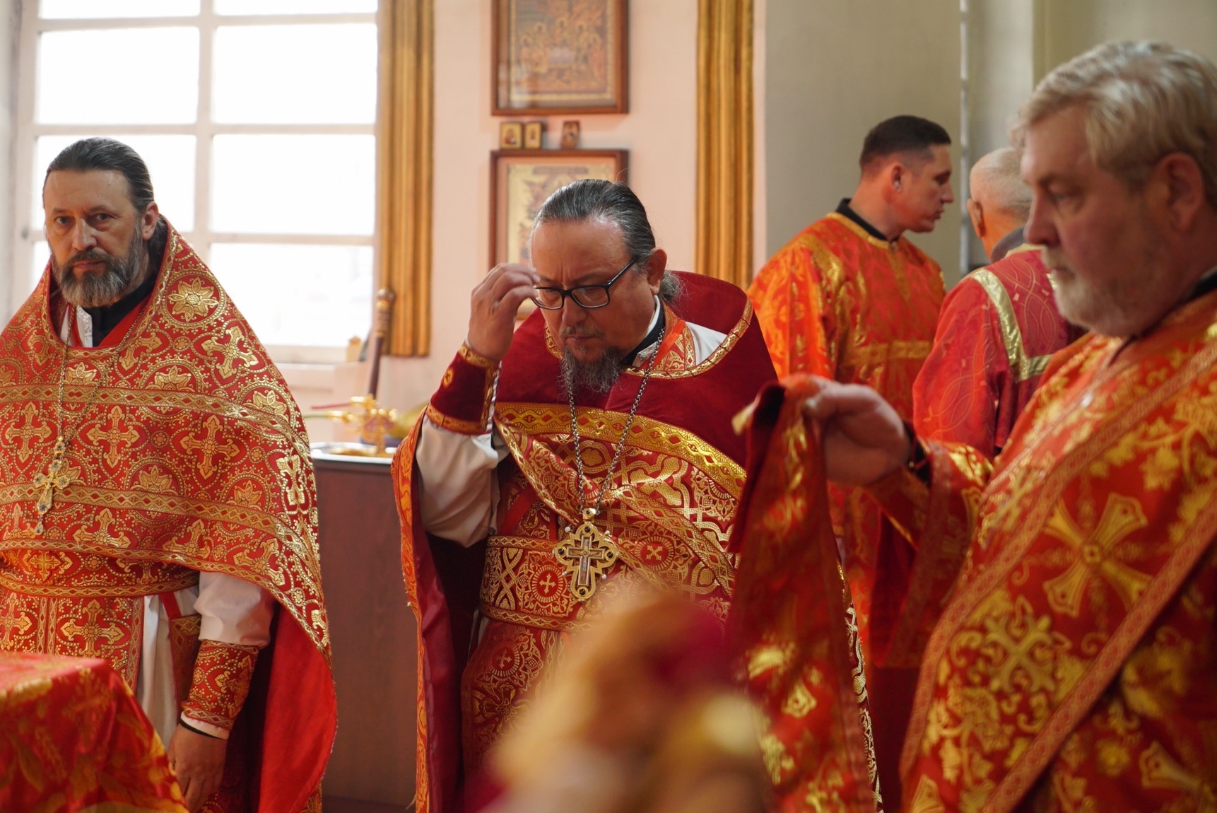 Его Преосвященству сослужили: настоятель храма протоиерей Валерий Замятин, протоиерей Александр Петров, иерей Евгений Щигрев, иерей Димитрий Харин, иерей Димитрий Камбалин, иерей Вадим Четвергов, иерей Василий Давыдкин, иерей Александр Лобанов, протодиакон Вадим Шпак, диакон Николай Геришенко.