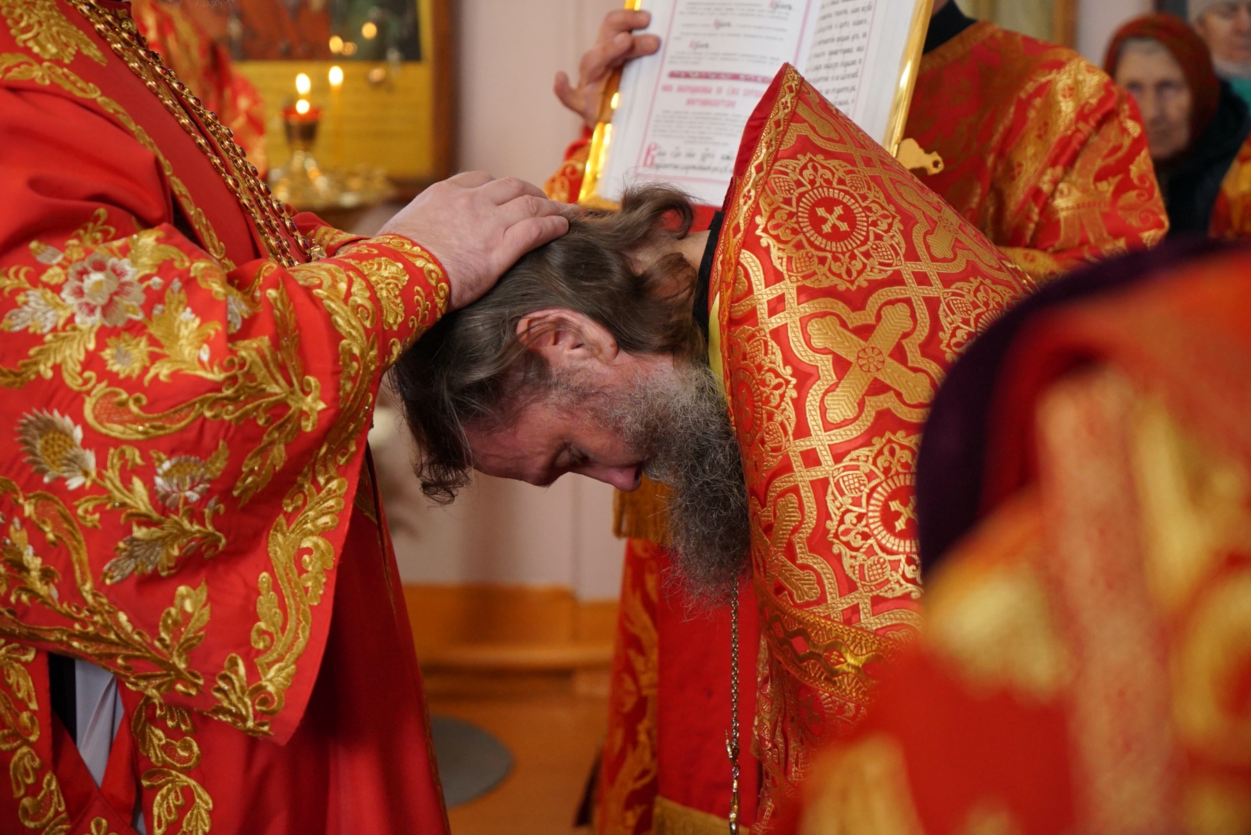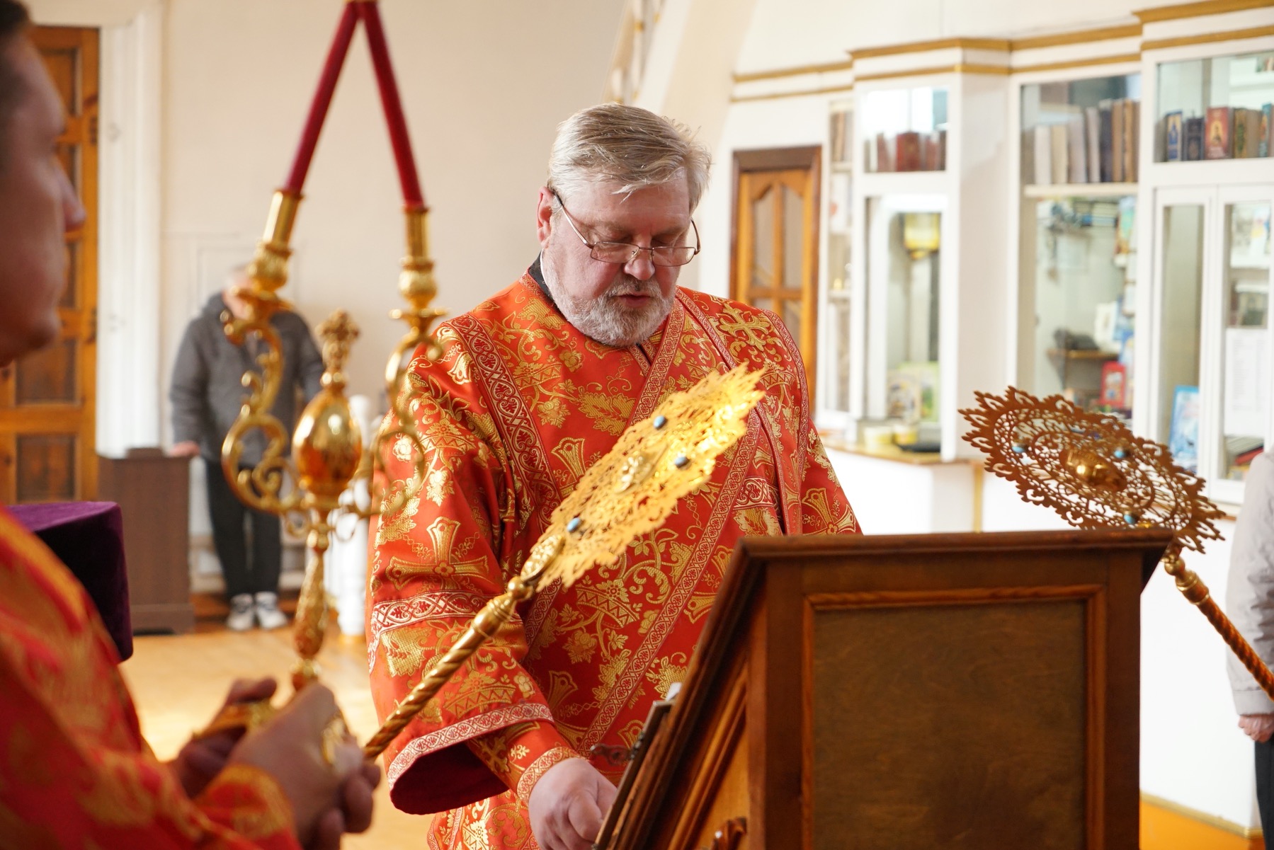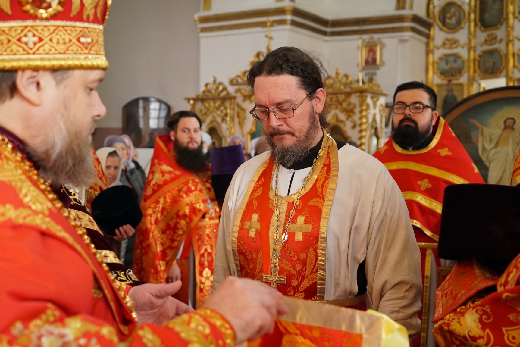 За богослужением Преосвященный Серафим возвел иерея Димитрия Харина и иерея Димитрия Камбалина в сан протоиерея, а также наградил правом ношения палицы иерея Вадима Четвергова и иерея Василия Давыдкина.